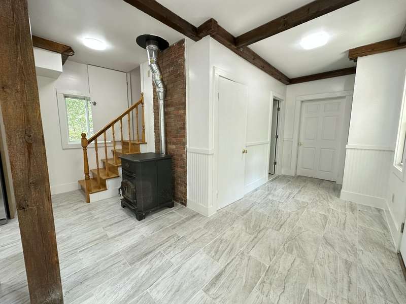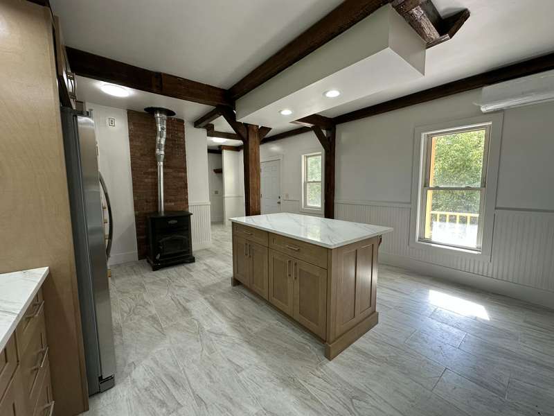 New shingles on the back of house and garage in September! Welcome to a stunning, completely renovated home! This property feels brand new, with every room meticulously updated from top to bottom. It offers three levels of living space, five bedrooms, and three full baths. The gourmet kitchen is a true showstopper, featuring brand-new cabinets, quartz countertops, a center island, and new appliances. All three bathrooms have been fully updated, and a new washer and dryer are included. Year-round comfort is a given, with oversized mini-split heat pumps on every level and a cozy pellet stove in the kitchen for cold winter nights. The fresh feel extends throughout, with new staircases, all-new flooring, and a finished basement with a poured concrete floor. An attached, oversized two-car garage includes a workbench, and the finished bonus room above is perfect for a family room, home office, or gym. Outside, you'll find a quiet, spacious lot with a peaceful pond. This ideal location on a quiet side street is just a short walk to downtown and the grocery store. With its prime location in central Maine, this home is perfect for a year-round residence, rental, or Airbnb.
