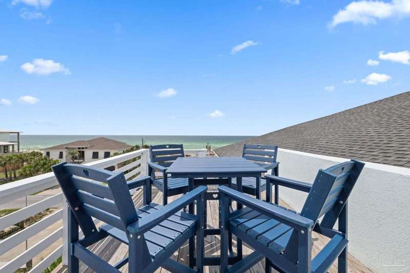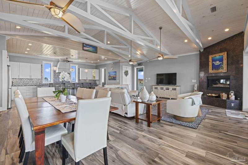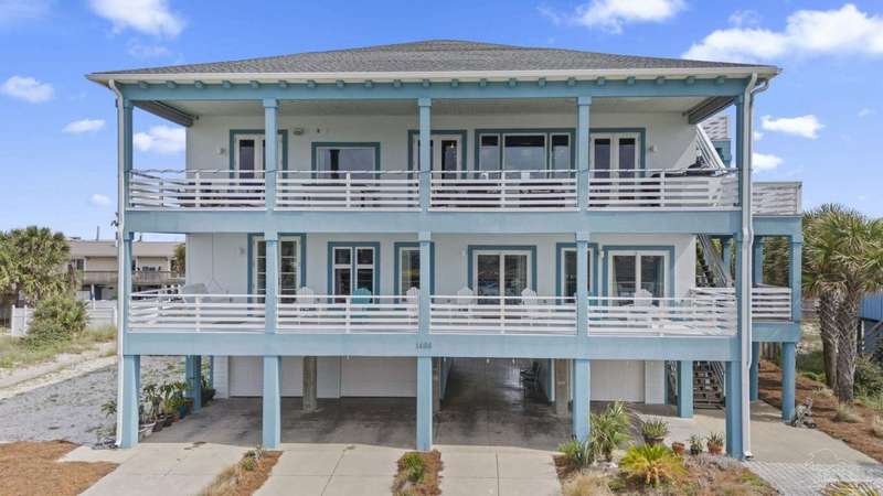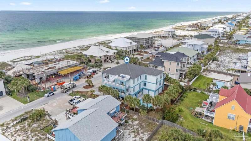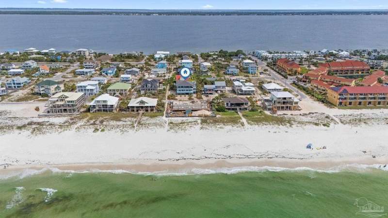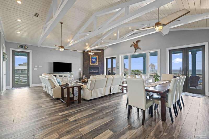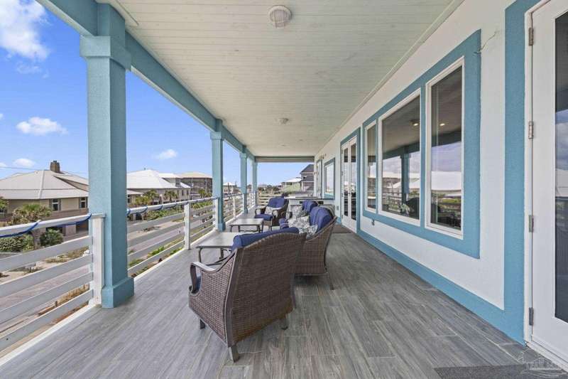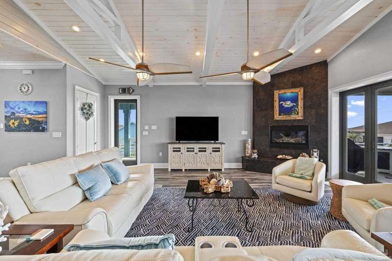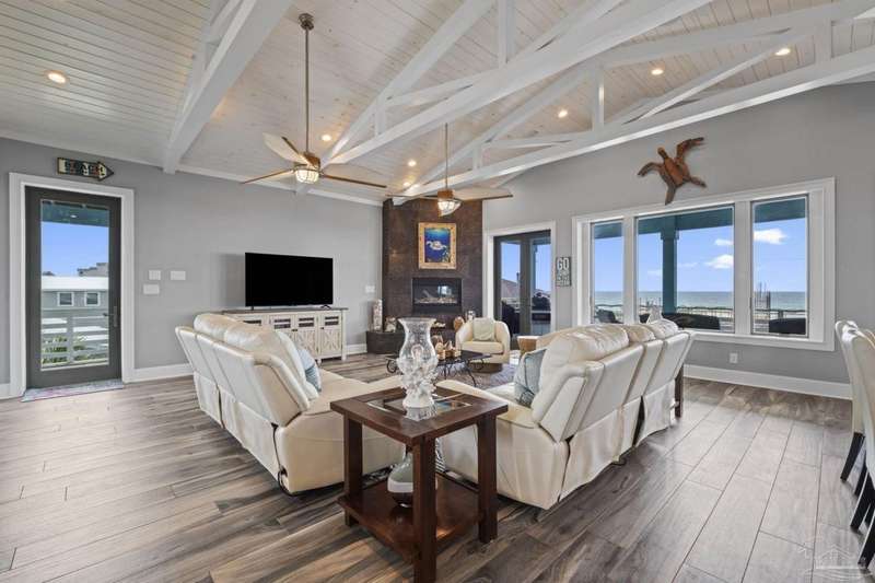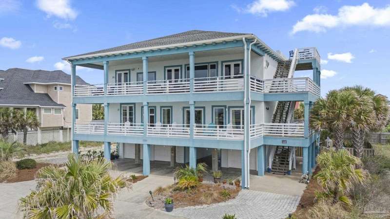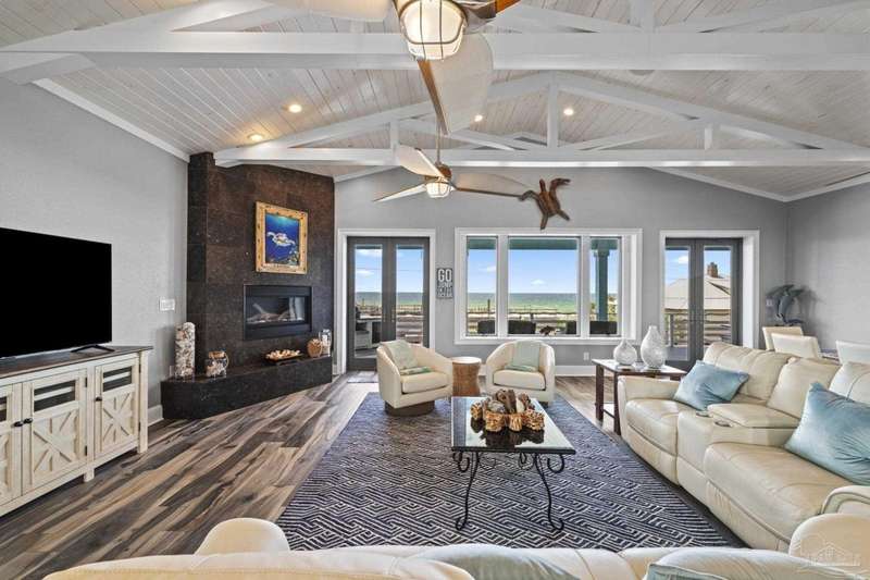This luxury beach retreat offers breathtaking Gulf views from nearly every room. Located on the top floor, the main living area features soaring tongue-and-groove ceilings, wood-look tile flooring, and expansive windows that flood the space with natural light and frame stunning water vistas. Modern coastal finishes create a clean, sophisticated aesthetic. The chef's kitchen includes custom cabinetry, mosaic tile backsplash, granite countertops, dual dishwashers, and bar seating with a view. The spacious living room-anchored by a fireplace with granite tile surround-flows onto a covered deck, perfect for alfresco dining or unwinding after a day at the beach. Outdoor spaces include generous balconies that invite relaxation to the sound of the waves, a rooftop deck with panoramic island views, and a hot tub just off the game room deck. The expansive primary suite offers balcony access, a large walk-in closet, and a luxurious en suite bath with double vanities, granite countertops, a Thermasol steam shower, and its own washer/dryer. Four additional en suite bedrooms on the second level provide private, light-filled retreats. A custom bunk area, kitchenette, and two more laundry stations add comfort and flexibility. Constructed with concrete pilings, ICF concrete walls, and ICF concrete floors on the second level, this home offers exceptional strength and energy efficiency. All windows are impact-rated Anderson. The home also features geothermal HVAC, an elevator to all levels, two attics for storage, and garages that accommodate up to five vehicles. A lock-out door can be added at the bottom of the stairs-framed and ready-offering potential for rental income or multigenerational living. At sand level, enjoy a fire pit, grilling area, and a gunite pool with tanning ledge and waterfall. Whether a primary residence, second home, or rental, this property is thoughtfully designed for an exceptional coastal lifestyle.