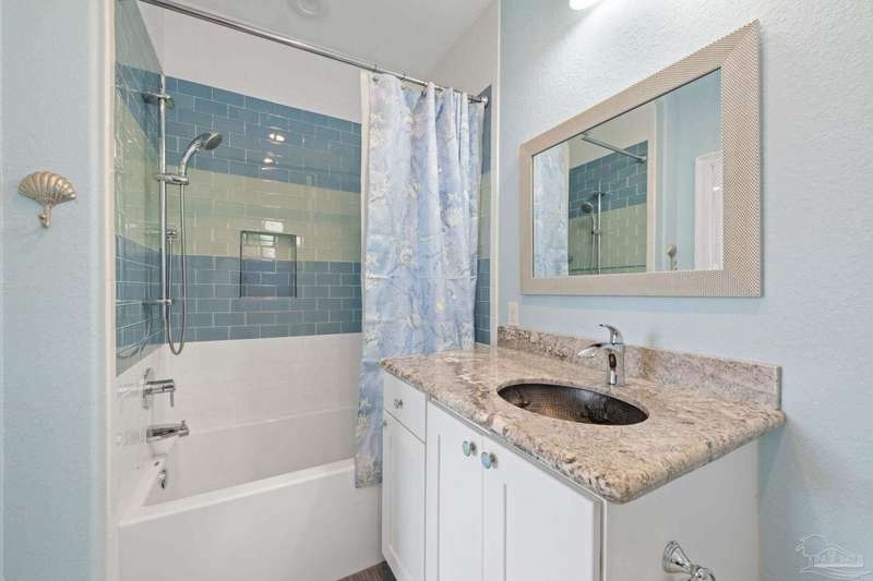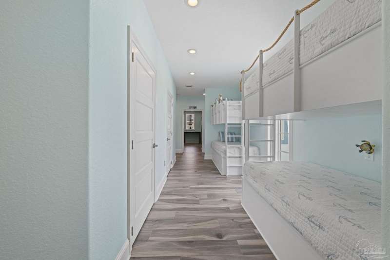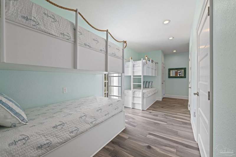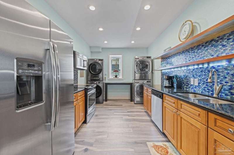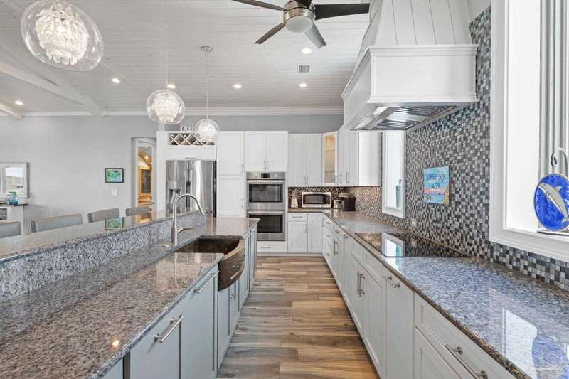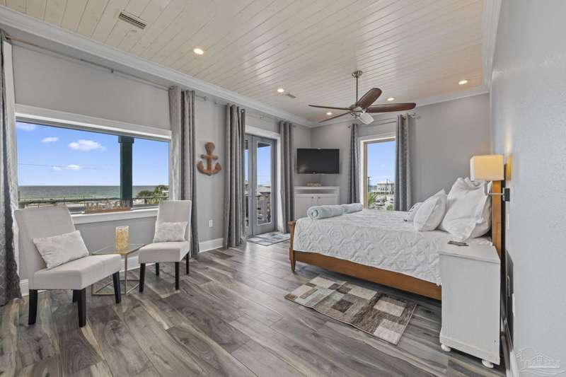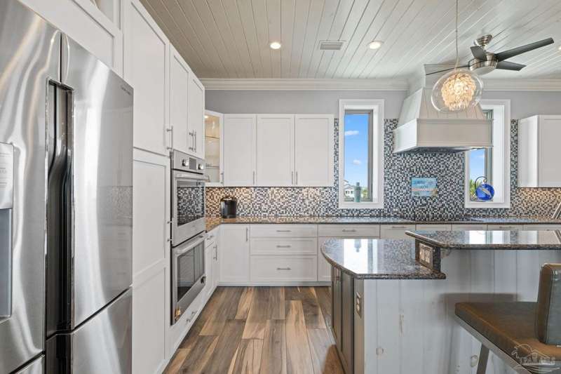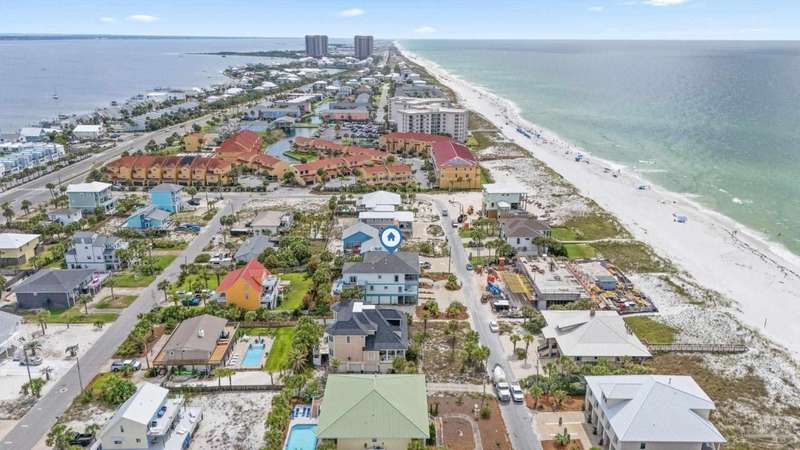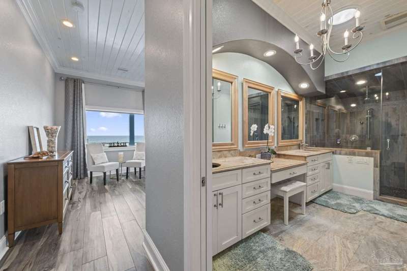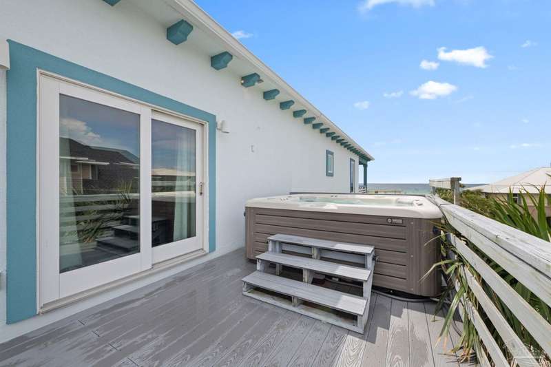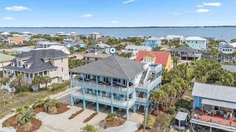 This luxury beach retreat offers breathtaking Gulf views from nearly every room. Located on the top floor, the main living area features soaring tongue-and-groove ceilings, wood-look tile flooring, and expansive windows that flood the space with natural light and frame stunning water vistas. Modern coastal finishes create a clean, sophisticated aesthetic. The chef's kitchen includes custom cabinetry, mosaic tile backsplash, granite countertops, dual dishwashers, and bar seating with a view. The spacious living room-anchored by a fireplace with granite tile surround-flows onto a covered deck, perfect for alfresco dining or unwinding after a day at the beach. Outdoor spaces include generous balconies that invite relaxation to the sound of the waves, a rooftop deck with panoramic island views, and a hot tub just off the game room deck. The expansive primary suite offers balcony access, a large walk-in closet, and a luxurious en suite bath with double vanities, granite countertops, a Thermasol steam shower, and its own washer/dryer. Four additional en suite bedrooms on the second level provide private, light-filled retreats. A custom bunk area, kitchenette, and two more laundry stations add comfort and flexibility. Constructed with concrete pilings, ICF concrete walls, and ICF concrete floors on the second level, this home offers exceptional strength and energy efficiency. All windows are impact-rated Anderson. The home also features geothermal HVAC, an elevator to all levels, two attics for storage, and garages that accommodate up to five vehicles. A lock-out door can be added at the bottom of the stairs-framed and ready-offering potential for rental income or multigenerational living. At sand level, enjoy a fire pit, grilling area, and a gunite pool with tanning ledge and waterfall. Whether a primary residence, second home, or rental, this property is thoughtfully designed for an exceptional coastal lifestyle.