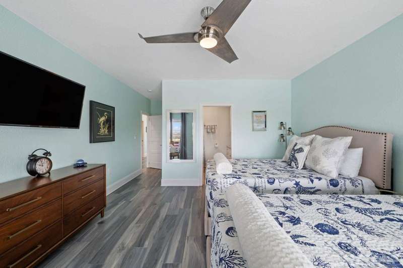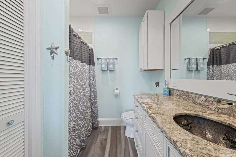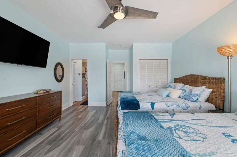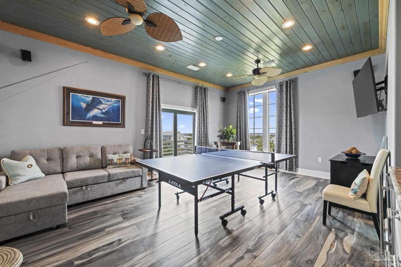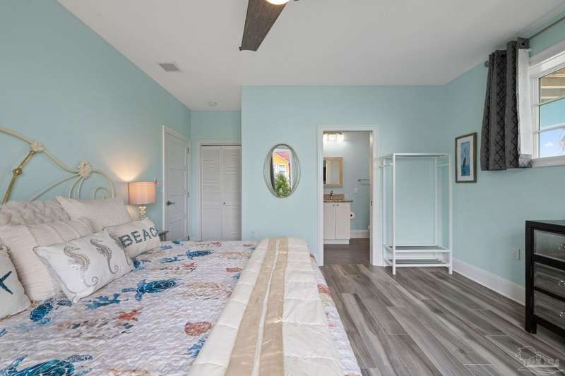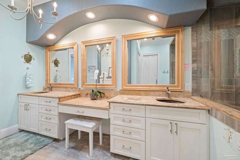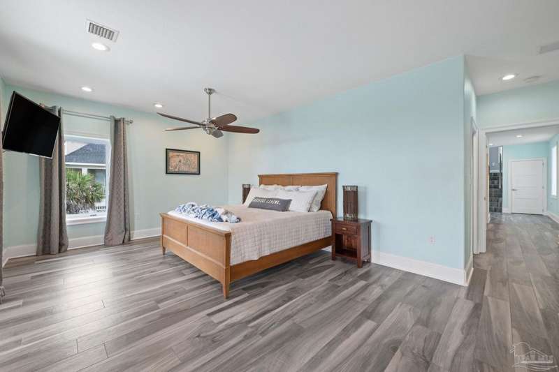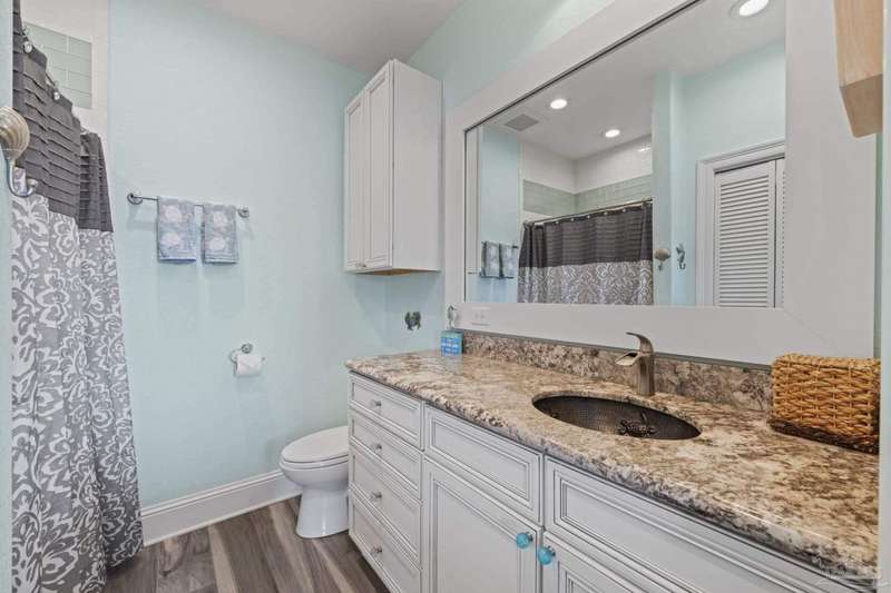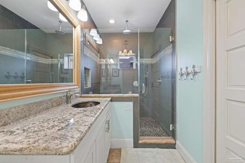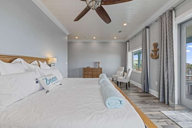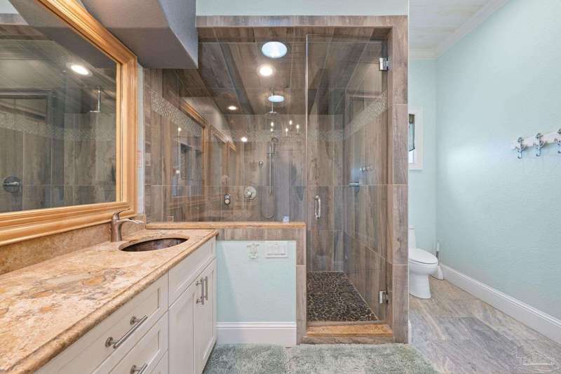 This luxury beach retreat offers breathtaking Gulf views from nearly every room. Located on the top floor, the main living area features soaring tongue-and-groove ceilings, wood-look tile flooring, and expansive windows that flood the space with natural light and frame stunning water vistas. Modern coastal finishes create a clean, sophisticated aesthetic. The chef's kitchen includes custom cabinetry, mosaic tile backsplash, granite countertops, dual dishwashers, and bar seating with a view. The spacious living room-anchored by a fireplace with granite tile surround-flows onto a covered deck, perfect for alfresco dining or unwinding after a day at the beach. Outdoor spaces include generous balconies that invite relaxation to the sound of the waves, a rooftop deck with panoramic island views, and a hot tub just off the game room deck. The expansive primary suite offers balcony access, a large walk-in closet, and a luxurious en suite bath with double vanities, granite countertops, a Thermasol steam shower, and its own washer/dryer. Four additional en suite bedrooms on the second level provide private, light-filled retreats. A custom bunk area, kitchenette, and two more laundry stations add comfort and flexibility. Constructed with concrete pilings, ICF concrete walls, and ICF concrete floors on the second level, this home offers exceptional strength and energy efficiency. All windows are impact-rated Anderson. The home also features geothermal HVAC, an elevator to all levels, two attics for storage, and garages that accommodate up to five vehicles. A lock-out door can be added at the bottom of the stairs-framed and ready-offering potential for rental income or multigenerational living. At sand level, enjoy a fire pit, grilling area, and a gunite pool with tanning ledge and waterfall. Whether a primary residence, second home, or rental, this property is thoughtfully designed for an exceptional coastal lifestyle.
