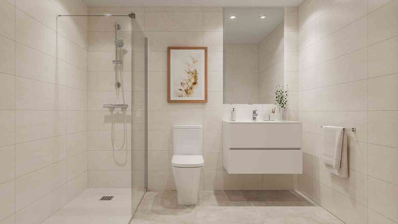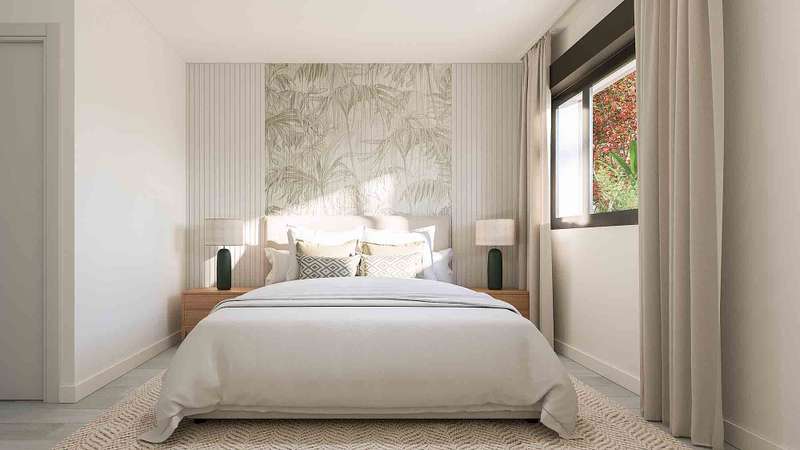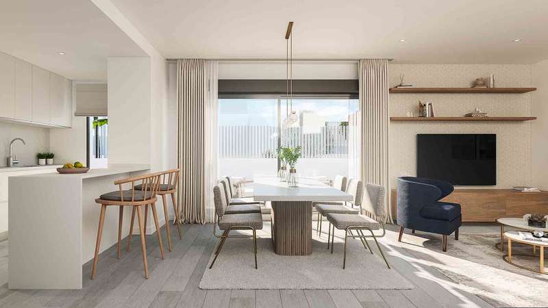 This apartment offers an airy open-plan living and dining space, a modern fitted kitchen, and three spacious bedrooms with built-in wardrobes. The main bedroom includes an en-suite bathroom. Expansive sliding doors open to a large private terrace with direct access to the communal gardens and pool area, perfect for outdoor dining and relaxation. High-quality finishes, efficient layouts, and excellent natural light create a comfortable and stylish living environment.