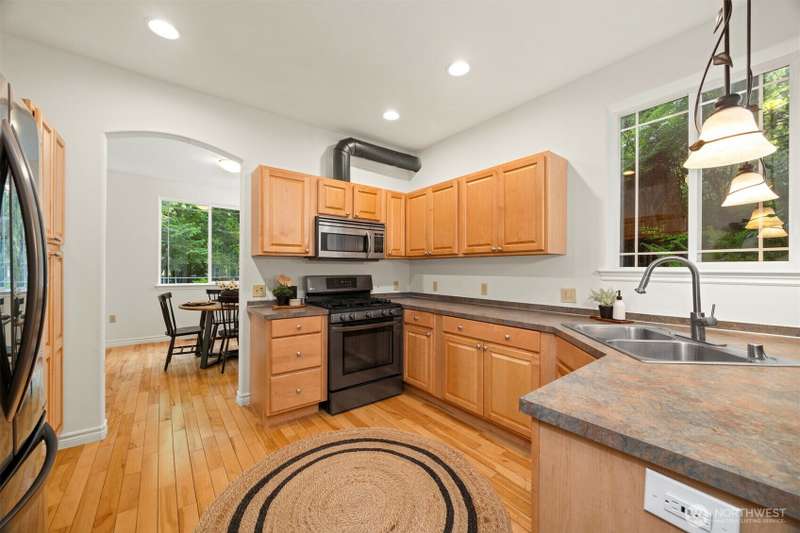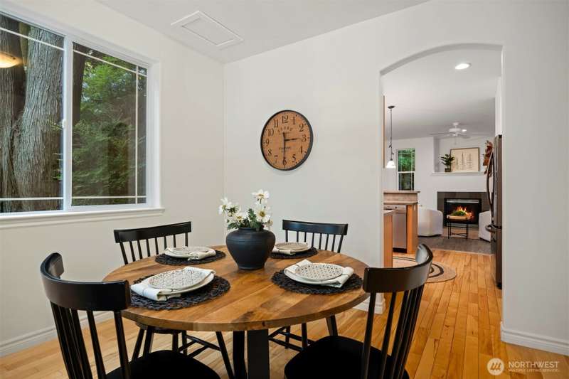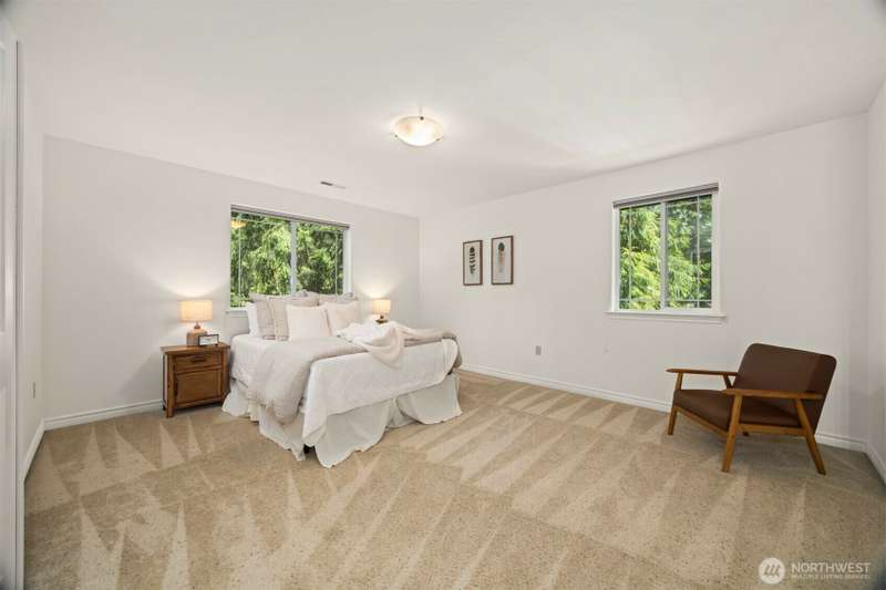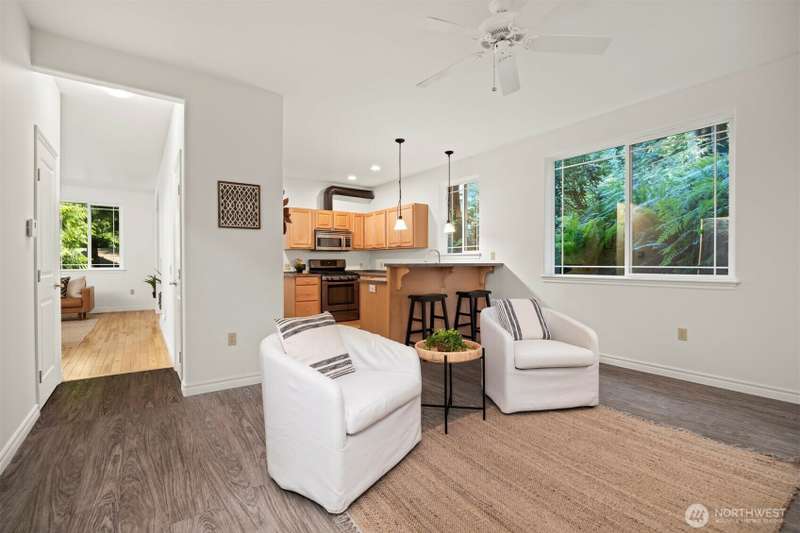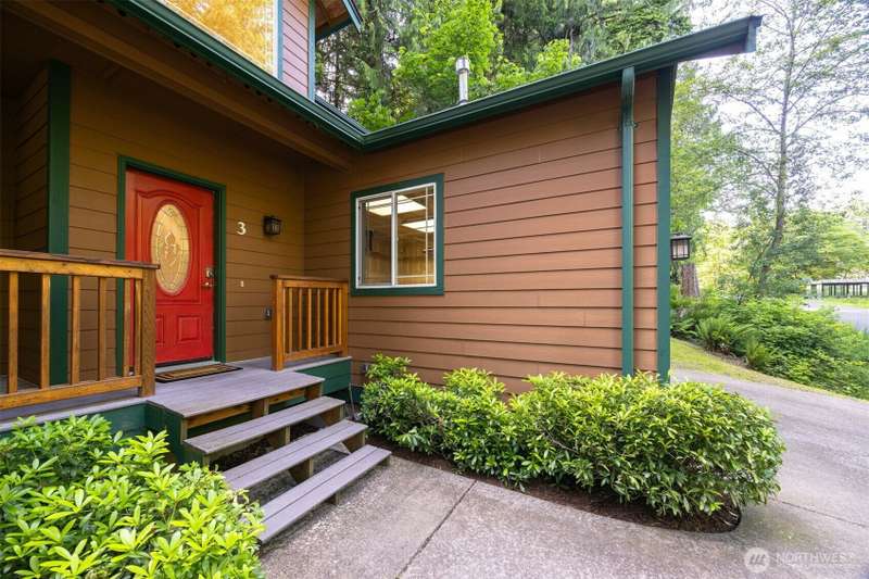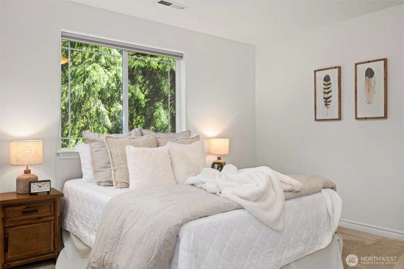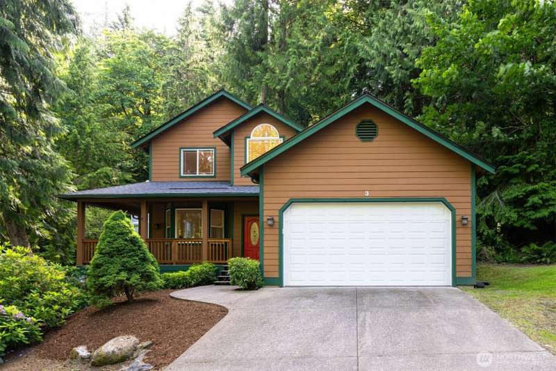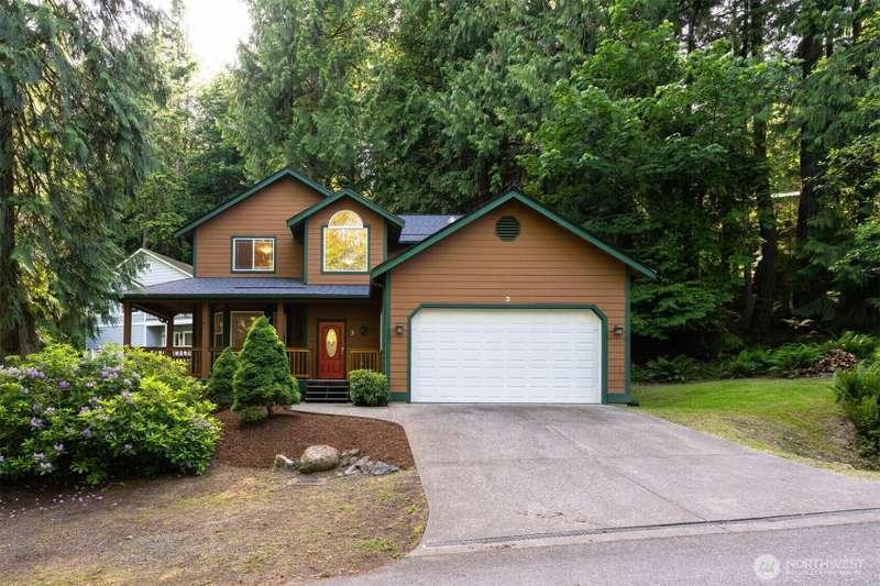 Tucked next to a greenbelt on a quiet dead-end street, this Sudden Valley home offers peace, privacy & convenience. No steep hills, no through traffic, & close to WTA & school bus stops. Step inside to hardwood floors & a bright, welcoming living room. Dining room flows off the kitchen, which opens to a cozy family room for added living space. Upstairs primary includes a walk-in & full en suite bath. 2 additional bedrooms & a 2nd full bath complete the upper level, while a half bath on the main floor adds everyday ease. With natural gas (no propane bills), a brand new roof, fresh interior paint, this home is move-in ready. 2-car garage, driveway & off-street parking offer plenty of room for guests. Golf, marina, beaches, trails & more!
