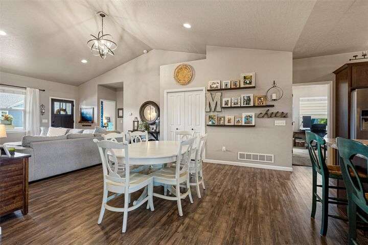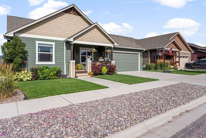 Set on one of the most desirable lots in 44 Ranch, this home offers a backyard few others can rival. Expansive, fully fenced, and beautifully landscaped, it’s one of the largest outdoor spaces in the neighborhood and includes underground sprinklers for easy care. A large patio extends your living area outdoors, and the front and side of the home feature custom multi-color LED soffit lighting so you can celebrate every season and holiday in style at the push of a button. The setting itself is equally impressive. Right out your front door is the 5.7-acre 44 Ranch Park, the signature gathering place for the neighborhood. The park includes a fountain, water features, a playground, a covered pavilion with picnic areas, and wide-open green space that brings neighbors together year-round. From your covered front porch, you’ll have a shaded, comfortable spot to relax and enjoy a front-row seat to the park’s activity. Inside, the home offers nearly 1,600 square feet of thoughtfully designed single-level living. A vaulted ceiling opens up the great room as you enter, connecting a bright living area, dining space, and a kitchen that’s both functional and inviting. Stainless steel appliances, abundant cabinet storage, extensive counter space, a breakfast bar, and a walk-in pantry make the kitchen a standout. A second den area features rustic barn-wood accents and sliding glass doors that lead directly to the backyard. Additional highlights include a custom laundry room with built-in cabinetry and workspace, a primary suite with a large walk-in closet and heated tile bathroom floors, two additional bedrooms with a second full bath, and an oversized garage with an extra-deep bay, built-in shelving, and a separate door to the backyard. A high-efficiency furnace, central air conditioning, and an included storage shed round out the package. Life in 44 Ranch means more than just a home, it’s becoming part of a community known for block parties, seasonal celebrations, and one of the best Halloween traditions in Missoula. With unmatched yard space, direct access to the park, and a beautifully finished interior, this property puts you at the heart of it all.