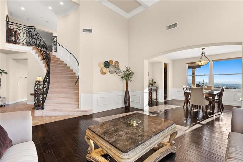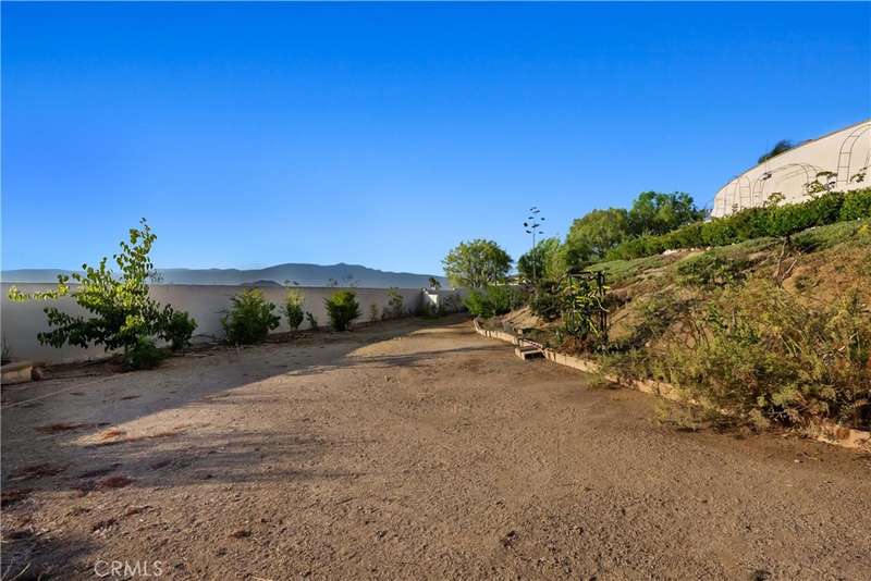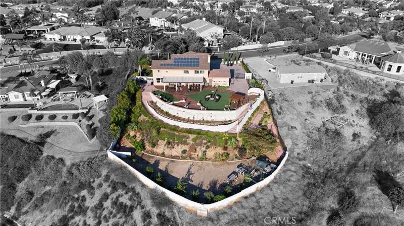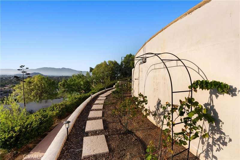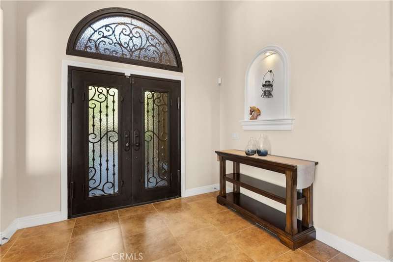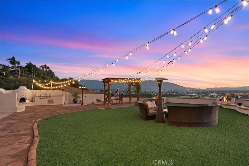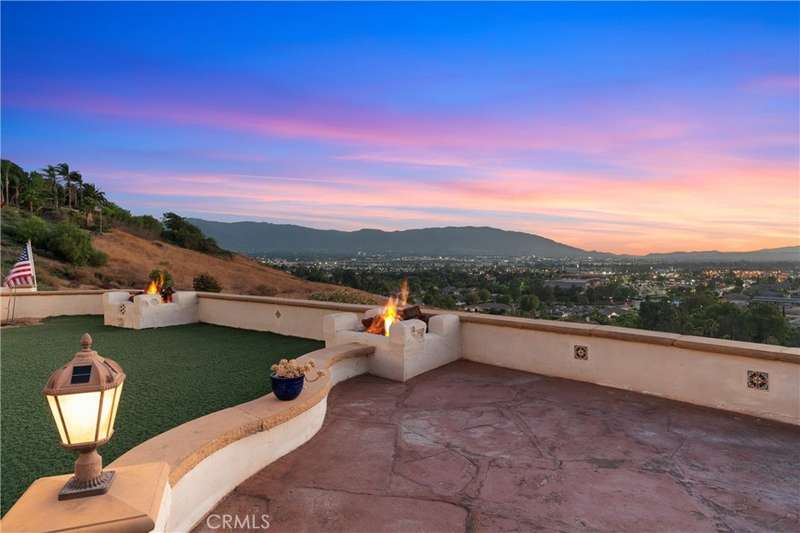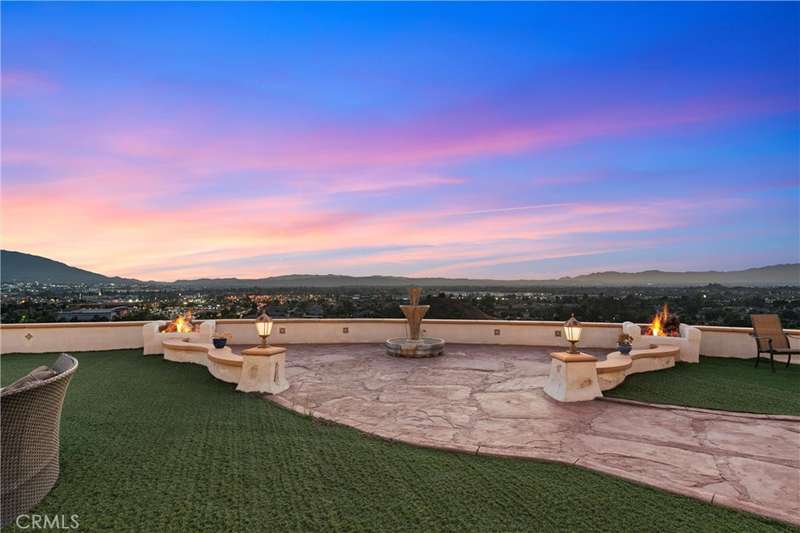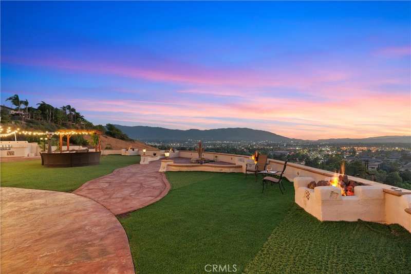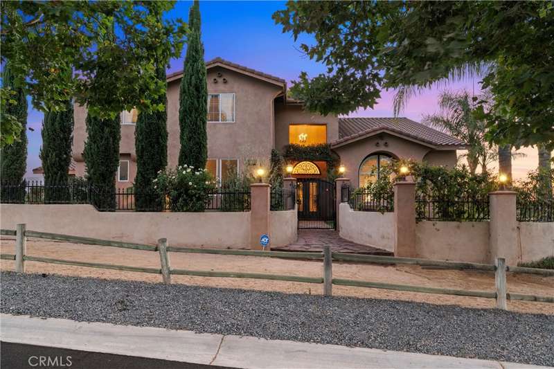 Nestled within the tranquil confines of Norco Hills, this exquisite estate exudes sophistication, class and a touch of Tuscany-country charm. Spanning 3,895 square feet of living space on a sprawling .87-acre lot, this gated residence offers unparalleled privacy and unobstructed, panoramic city-light and mountain views. As you approach the property, you'll be captivated by the meticulously designed exterior, surrounded by stucco-finished block walls, iron fences, and a remote-control gate that leads to a paved front entrance. The impressive entryway through the gated courtyard is adorned with lush vines wrapped around the archway, guiding you to the custom wrought iron double doors. Step inside to soaring two-story ceilings and be greeted by the luxurious board and batten walls, complemented by rich hardwood flooring and pristine tile. The ornate wrought iron staircase is a masterpiece. The gourmet kitchen is a chef's dream, featuring a large island with bar seating, granite countertops, a built-in gas range and hood, and stainless-steel appliances. This space seamlessly flows into the family room, where French doors open to the breathtaking tri-level backyard. Completing the main level is an office that can be converted into a 5th bedroom plus a bathroom with a standing shower, as well as, a powder bathroom perfect for accommodating guests. Upstairs, the massive primary suite is a sanctuary, offering more of those incredible views. The spa-like primary bathroom boasts his and her walk-in closets, dual sink vanities with granite countertops, marble flooring, a tumbled travertine soaking tub, and a spacious walk-in shower with a rainfall showerhead. An additional three generously sized secondary bedrooms can be found upstairs featuring mirrored closets. There is also an upstairs hallway bathroom with dual sinks, granite countertops and a shower tub. The outdoor space is nothing short of spectacular, with a built-in BBQ counter, 2 fireplaces, 5 gas fire pits, 2 water fountains, 3 chicken coops, various fruit trees, and designated planters to grow your own food. Enjoy al-fresco dining while viewing incredible sunset views under the Alumawood-covered patio with 3 ceiling fans. Additional features include a spacious laundry room with extra storage, double 2-car garages accommodating up to four vehicles, and a long gated driveway for RV parking. Paid off solar and no HOA!