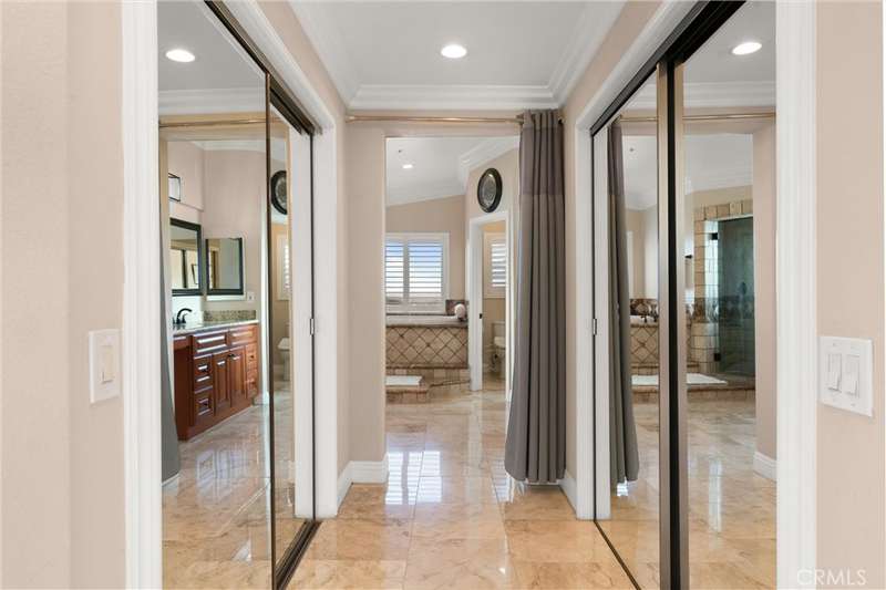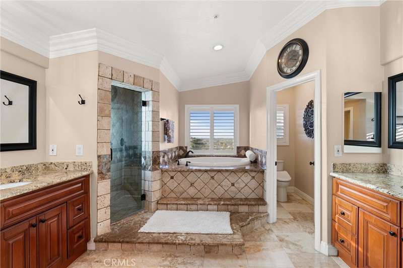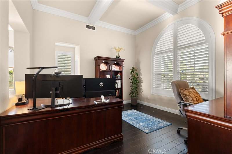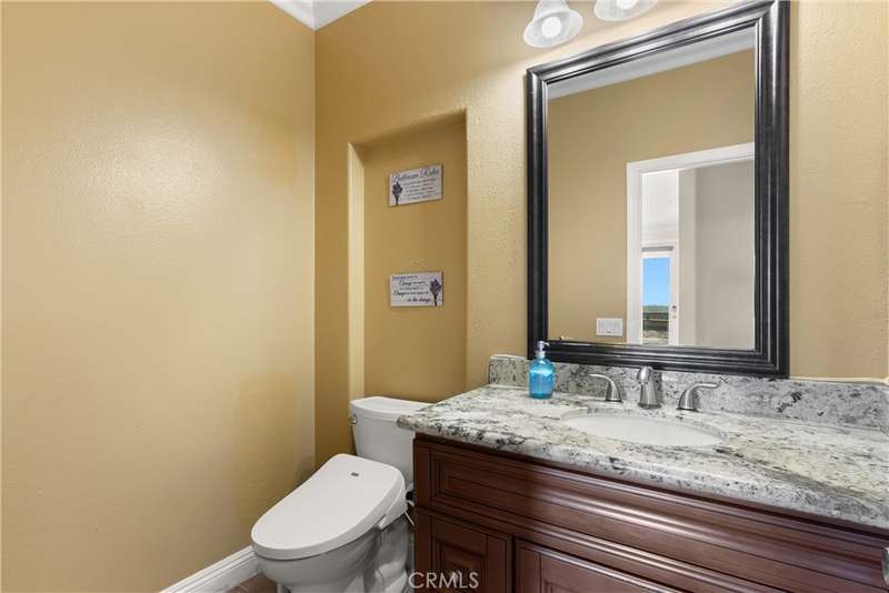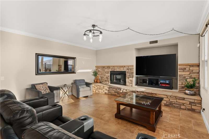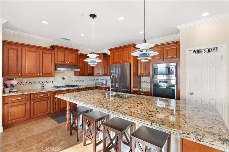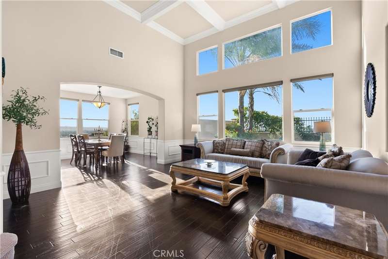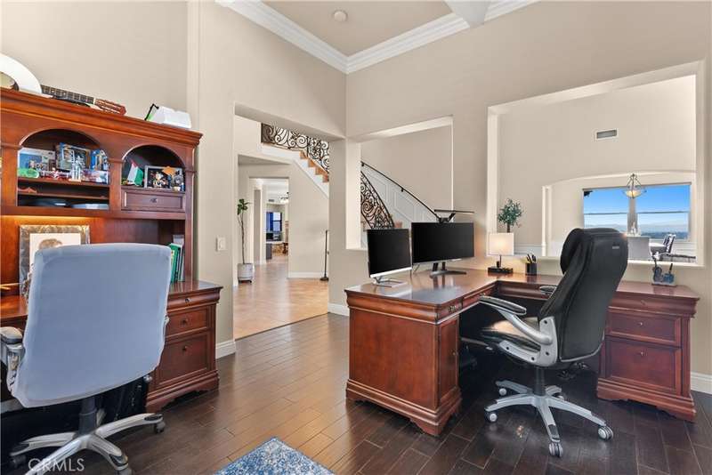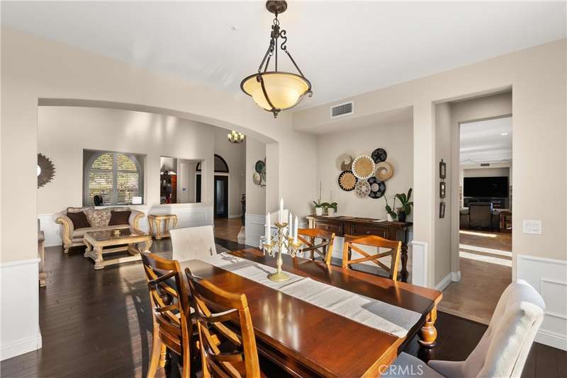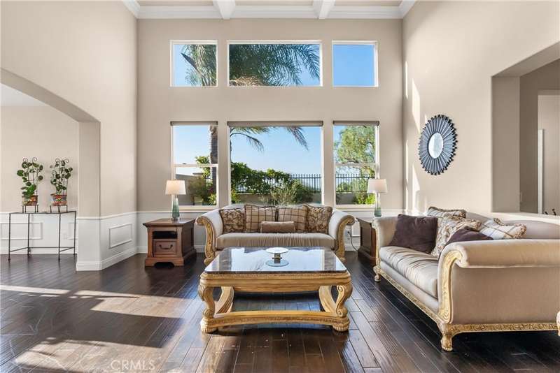 Nestled within the tranquil confines of Norco Hills, this exquisite estate exudes sophistication, class and a touch of Tuscany-country charm. Spanning 3,895 square feet of living space on a sprawling .87-acre lot, this gated residence offers unparalleled privacy and unobstructed, panoramic city-light and mountain views. As you approach the property, you'll be captivated by the meticulously designed exterior, surrounded by stucco-finished block walls, iron fences, and a remote-control gate that leads to a paved front entrance. The impressive entryway through the gated courtyard is adorned with lush vines wrapped around the archway, guiding you to the custom wrought iron double doors. Step inside to soaring two-story ceilings and be greeted by the luxurious board and batten walls, complemented by rich hardwood flooring and pristine tile. The ornate wrought iron staircase is a masterpiece. The gourmet kitchen is a chef's dream, featuring a large island with bar seating, granite countertops, a built-in gas range and hood, and stainless-steel appliances. This space seamlessly flows into the family room, where French doors open to the breathtaking tri-level backyard. Completing the main level is an office that can be converted into a 5th bedroom plus a bathroom with a standing shower, as well as, a powder bathroom perfect for accommodating guests. Upstairs, the massive primary suite is a sanctuary, offering more of those incredible views. The spa-like primary bathroom boasts his and her walk-in closets, dual sink vanities with granite countertops, marble flooring, a tumbled travertine soaking tub, and a spacious walk-in shower with a rainfall showerhead. An additional three generously sized secondary bedrooms can be found upstairs featuring mirrored closets. There is also an upstairs hallway bathroom with dual sinks, granite countertops and a shower tub. The outdoor space is nothing short of spectacular, with a built-in BBQ counter, 2 fireplaces, 5 gas fire pits, 2 water fountains, 3 chicken coops, various fruit trees, and designated planters to grow your own food. Enjoy al-fresco dining while viewing incredible sunset views under the Alumawood-covered patio with 3 ceiling fans. Additional features include a spacious laundry room with extra storage, double 2-car garages accommodating up to four vehicles, and a long gated driveway for RV parking. Paid off solar and no HOA!