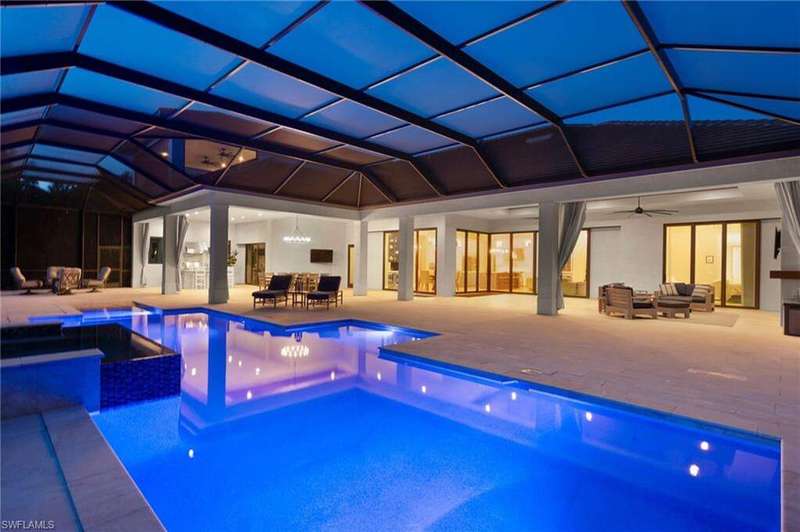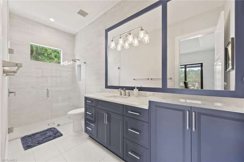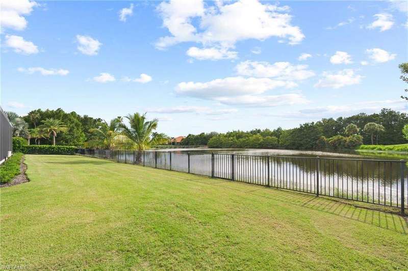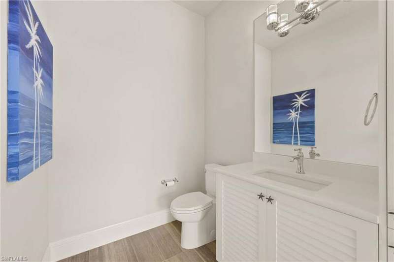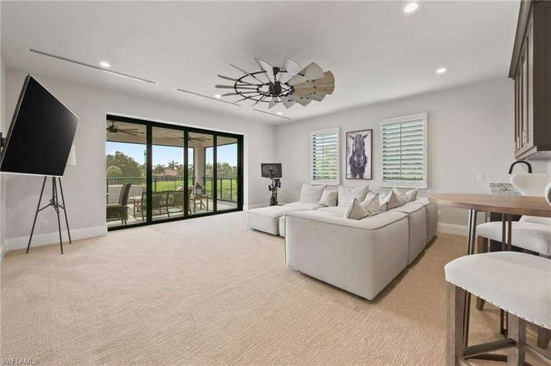 IMMEDIATE GOLF MEMBERSHIP AVAILABLE with this stunning custom home built by Florida Lifestyle. Elevated 16'1 feet above sea level and equipped with impact-resistant glass and a full-house generator, this home was meticulously designed for peace of mind and modern comfort. Every detail has been thoughtfully curated-from wide-plank Legno Bastone flooring to a 1,000-gallon propane tank, water filtration system, elevator, full security setup, and Sonos sound throughout. Beautifully furnished by Clive Daniel and Norris, this home is move-in ready for effortless Florida living. The chef's kitchen is an entertainer's dream, featuring dual porcelain islands, Thermador appliances, a wine refrigerator, and a spacious auto-lit walk-in pantry. A nearby bar area includes an additional wine fridge and seamlessly connects to the dining space for relaxed hosting.The luxurious primary suite offers a tranquil retreat with a custom ceiling accent, blackout shades, dual walk-in closets, and a spa-like bath with new shower heads and dual water closets. Two additional en-suite guest rooms are located on the main level in a split-bedroom layout, providing ultimate privacy.Take the elevator upstairs to a spacious fourth bedroom with double vanities and ample closet storage. This upper-level guest suite also features a lounge area, TV space, kitchenette, bar, and Sub-Zero wine cooler. The upstairs private screened lanai offers gorgeous golf views. On the main level, enjoy a generously sized laundry room with pull-out bins, extra cabinetry, a storage closet, and an additional refrigerator. The oversized four-car garage includes built-in storage, a refurbished four-seat "Hole In One" golf cart, and yet another refrigerator. For even more storage, a built-in mudroom with cubbies keeps everything organized. Entertain in style on the expansive lanai, featuring a beautiful wood ceiling, gas fireplace, covered lounging and dining areas, an air-conditioned pool bath, and a two-story panoramic cage. The fully equipped outdoor kitchen includes three TVs and custom drapes, creating an intimate yet chic setting for outdoor living. With western exposure and breathtaking water and golf course views, you'll enjoy glorious sunsets from the gas-heated saltwater pool and spa.This home truly has it all-style, functionality, and luxury-ready for you to enjoy the ultimate Florida lifestyle.