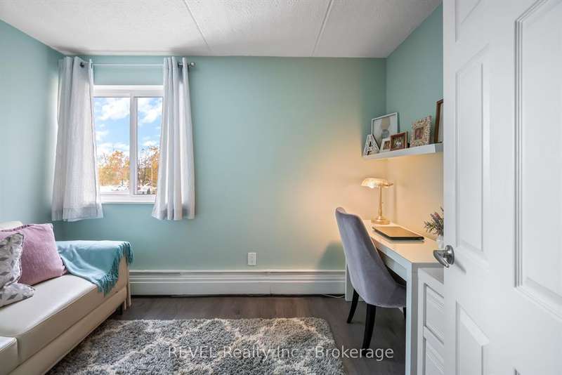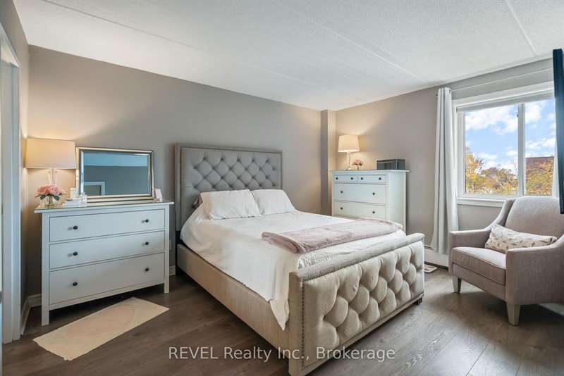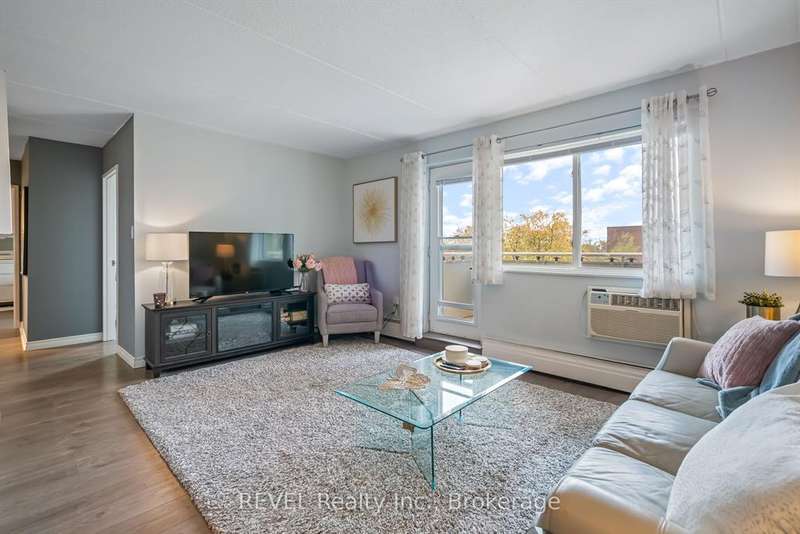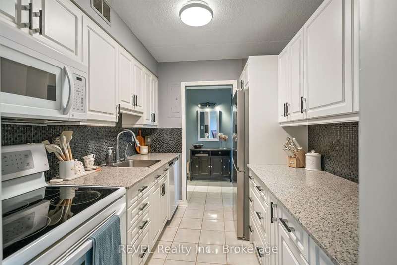 Cozy & Classy best describe this beautiful two bedroom unit! With updated kitchen, flooring and bathroom, you can simply move in and unpack. The primary bedroom is very roomy and has a fantastic walk-in closet with built-in organizer. The second bedroom is also bright and roomy and could easily double as a home office. The living room has tons of natural light and takes you out to the private terrace, with western exposure. The kitchen has lovely granite countertops, ceramic backsplash, newer appliances and plenty of cabinet space. Enjoy access to the outdoor heated pool, gym, & sauna. This building is situated in a quiet, north-end enclave, but is still very close to the Fairview Mall, churches, QEW access and bus routes. Let's Get You Home!