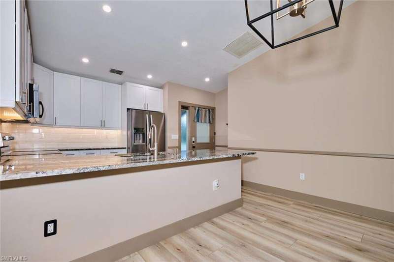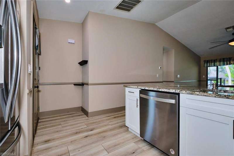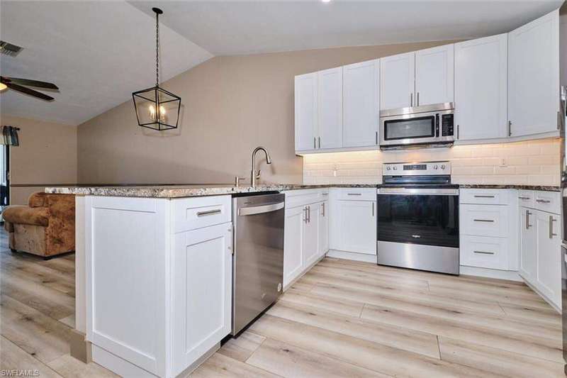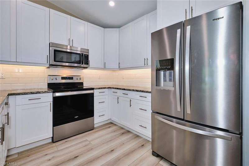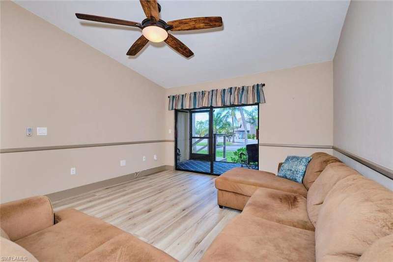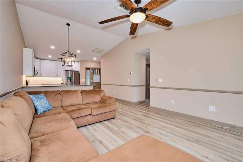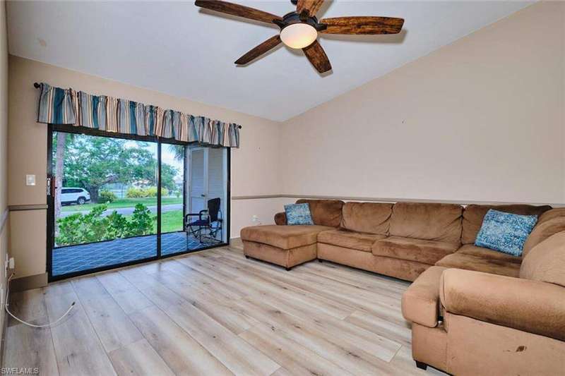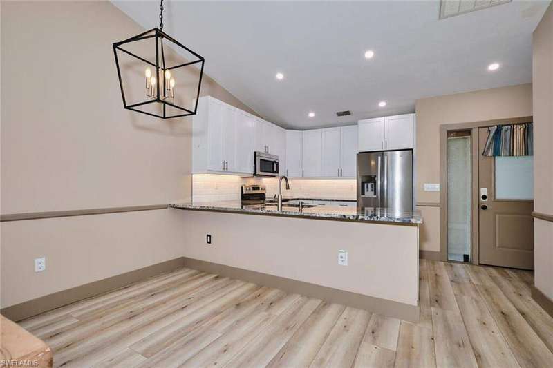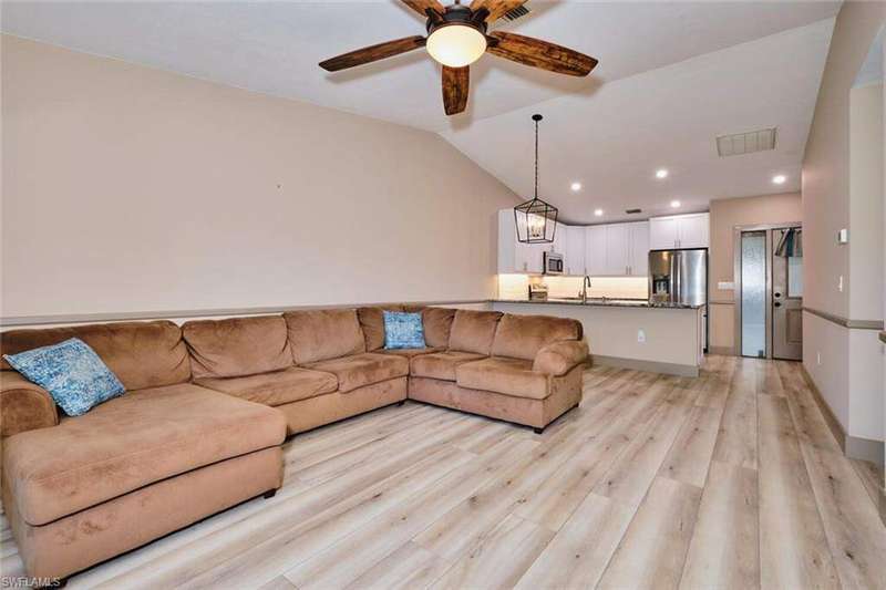 FLOOD INSURANCE PAID BY HOA!!! 1% rate buy down offered by seller to qualified buyer. Beautifully Renovated Villa in Island Park Village II - Move-In Ready! In addition to the flood insurance, the HOA is responsible for the roof for each unit. Welcome to this fully renovated corner-end villa in desirable Island Park Village II, offering 2 spacious bedrooms and 2 bathrooms under air, plus a private one-car garage with driveway. This home is truly like new, featuring a 2023 roof, fresh interior paint, wood-style plank flooring, and vaulted ceilings that create an open, airy feel. The modern kitchen is a showstopper, boasting white shaker cabinets, elegant granite countertops, and new stainless steel appliances. Enjoy convenient in home laundry featuring newer washer and dryer units, just off the lanai. The primary suite and the livingroom features sliding doors that leads to the screened-in lanai, with power blinds, perfect for relaxing or entertaining while overlooking serene views of the lake, pool, and recreation area. Fresh landscaping, corner unit and near the pool and amenities complete the outdoor oasis. Additional upgrades include: New roof 2023 New A/C and water heater Updated modern bathrooms with new vanities, sinks, and fixtures Ceiling fans and lighting fixtures throughout Island Park Village offers resort-style amenities, including a community pool & spa, tennis courts, shuffleboard, pickleball courts, clubhouse, and scenic lakes. Not a 55+ section - open to all ages! Rental policy is two times per year. 2 dogs allowed. Located just minutes from I-75, Gulf Coast Town Center, FGCU, RSW Airport, dining, shopping, and world-class beaches. With LOWEST HOA fees in the community, this villa is a rare find. Don't miss your chance to own a move-in-ready, like-new home in a prime location!
