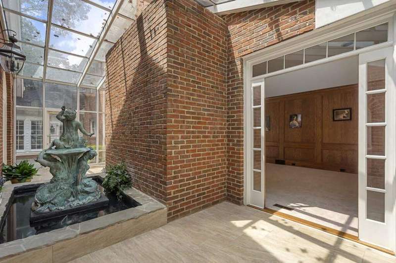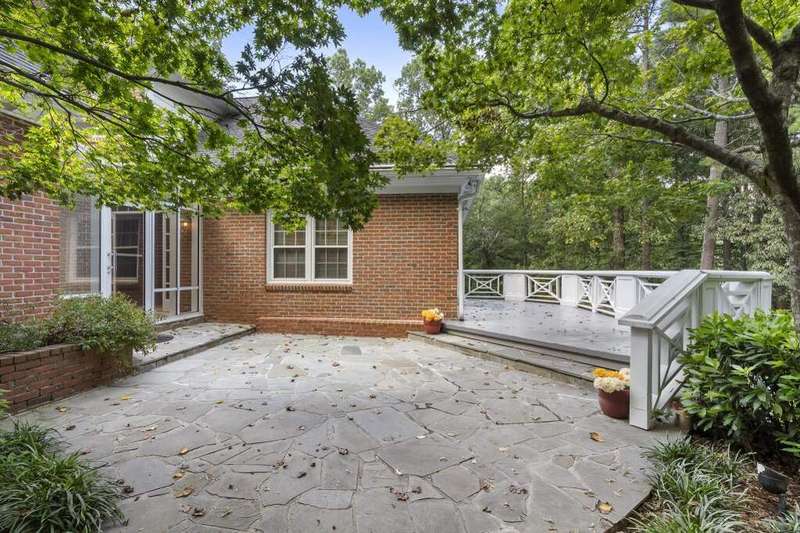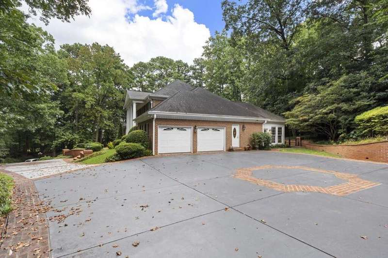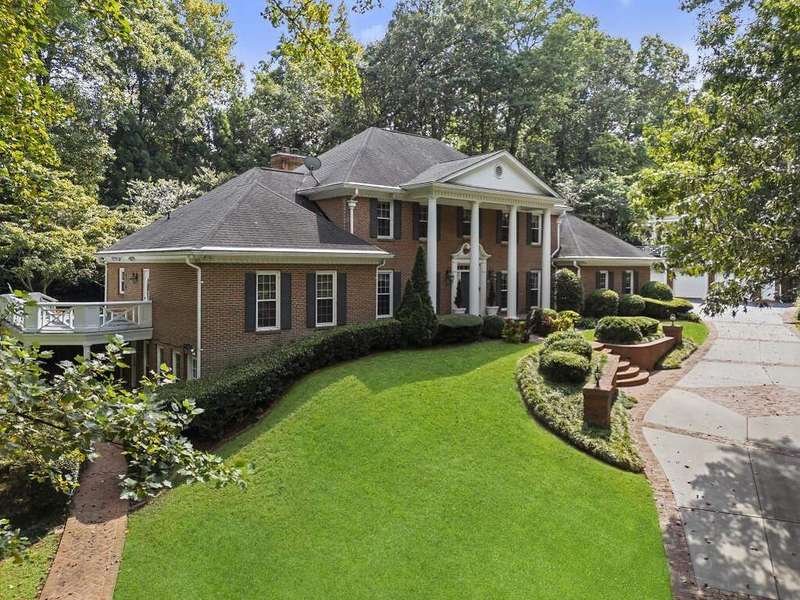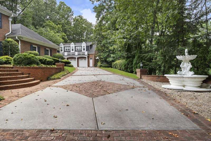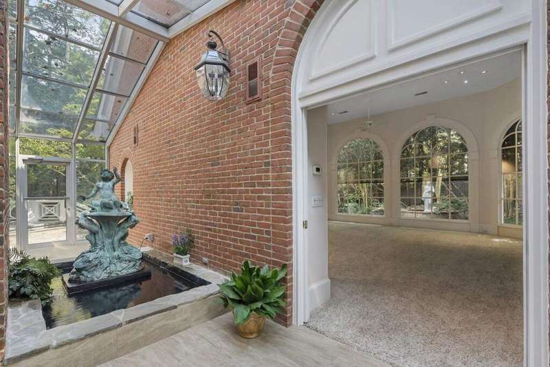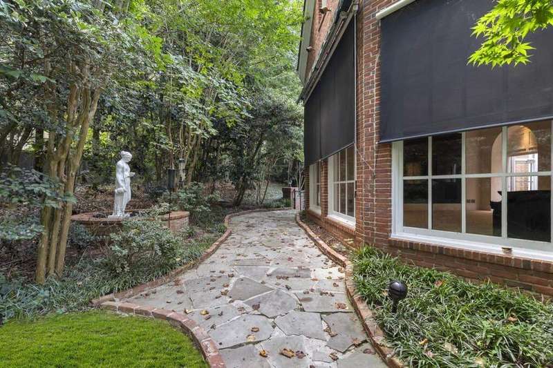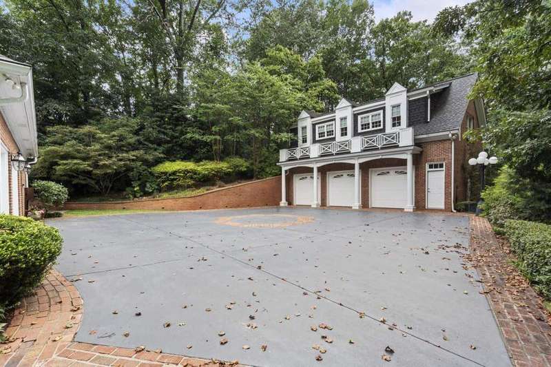 This elegant gated estate rests on 2.23 manicured acres in the heart of Sandy Springs, offering exceptional privacy, architectural sophistication, and an abundance of living space both inside and out. A long, landscaped driveway leads to a grand brick facade with classic columns. The grand double doors welcome you into a breathtaking two-story foyer featuring polished marble floors and a sweeping staircase. To the left, the formal living room invites conversation with its fireplace and abundant natural light, while across the foyer the formal dining room exudes elegance with marble flooring and a mirrored feature wall. The richly paneled den, accented by coffered ceilings and a fireplace, offers a warm and refined space for quiet reading or intimate gatherings. Nearby, a solarium with floor-to-ceiling windows and an antique fountain opens into an expansive media and entertainment room, complete with built-in cabinetry, a retractable awning, surround sound, and dramatic Palladian-style windows that flood the space with light. The heart of the home lies in the gourmet kitchen, with white custom cabinetry, porcelain tile flooring, stainless steel appliances including a built-in steamer, tile backsplash, and off-white Corian countertops. A spacious breakfast room and adjacent sunroom provide stunning views of the backyard, creating a peaceful setting for daily living. The main level also features a large primary suite with dual oversized closets and a private en suite bath, ideal for guests. Upstairs, the luxurious secondary primary suite is a true retreat, highlighted by a lighted double tray ceiling, spa-inspired bath with dual vanities, a jacuzzi tub, and a custom-designed oversized closet. Additional upstairs bedrooms are generously sized and share well-appointed baths, offering comfort and privacy for family and guests. The finished terrace level expands the home's living space with a versatile layout that includes a home office, a full bath, a wet bar, a game area, and direct access to a covered patio. Just off the terrace level, there's ample space to add a custom pool, allowing seamless indoor-outdoor entertaining. On the opposite side of the storage building, there's room for a tennis court or handball court, adding even more recreational possibilities to the estate. Several levels throughout the home and grounds can comfortably host mixed indoor-outdoor gatherings of over 100 people, making it ideal for entertaining on a grand scale. The grounds are equally impressive, featuring brick paver pathways, manicured lawns, classical statues, multiple fountains, and a built-in gas grill-perfect for al fresco entertaining. The guest house features its own three-car garage, providing private accommodations that include a living space with a kitchen, a full bathroom, and a bedroom. This arrangement increases the total garage capacity to five cars. This one-of-a-kind estate offers timeless craftsmanship, thoughtful updates, and premier amenities in one of Sandy Springs' most sought-after neighborhoods.