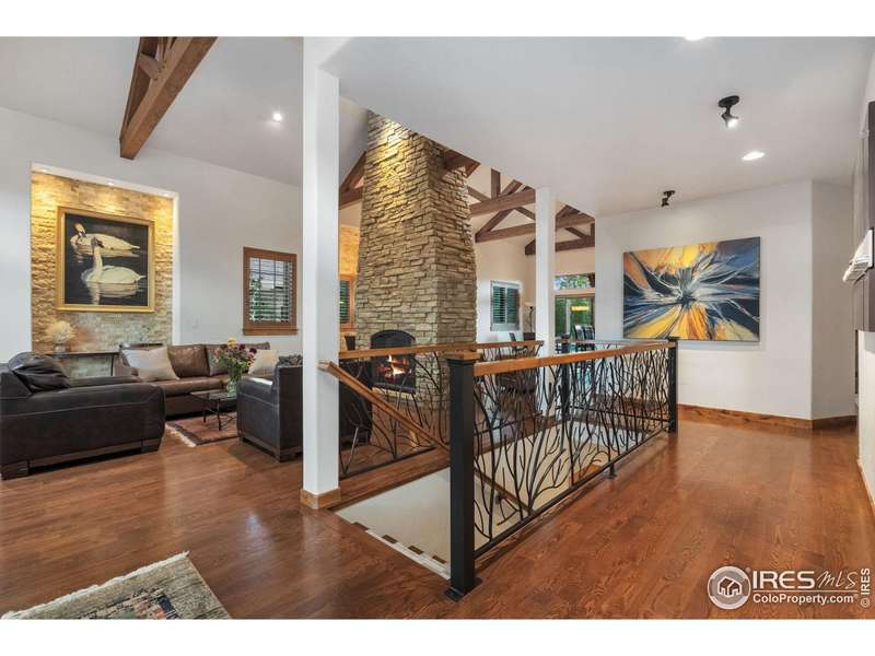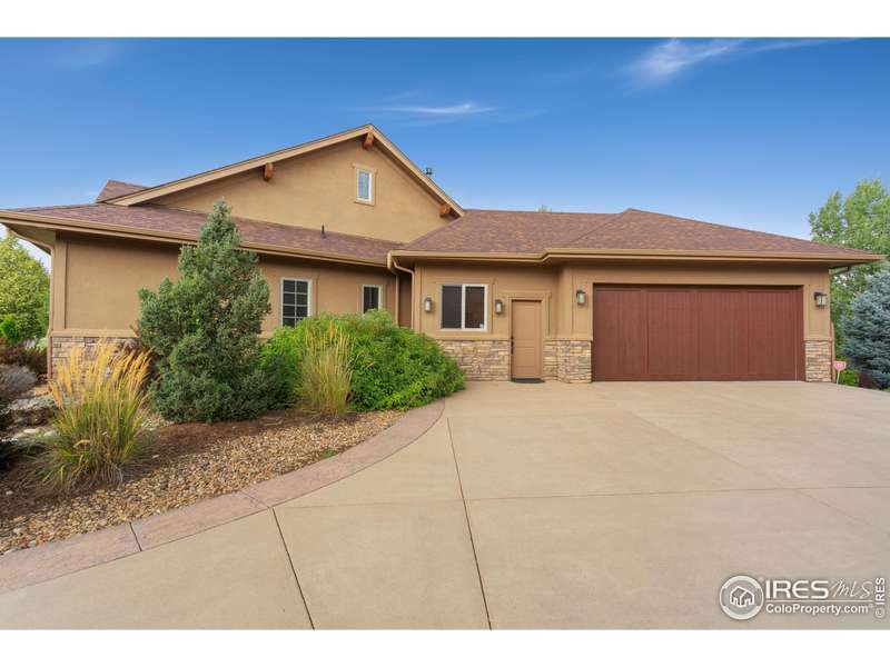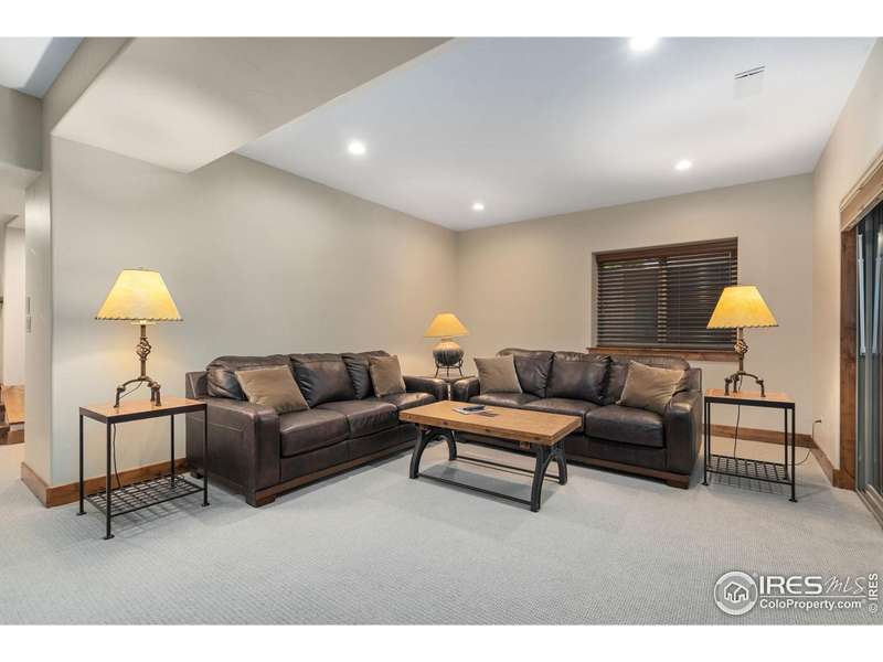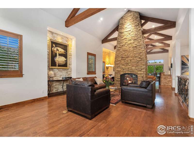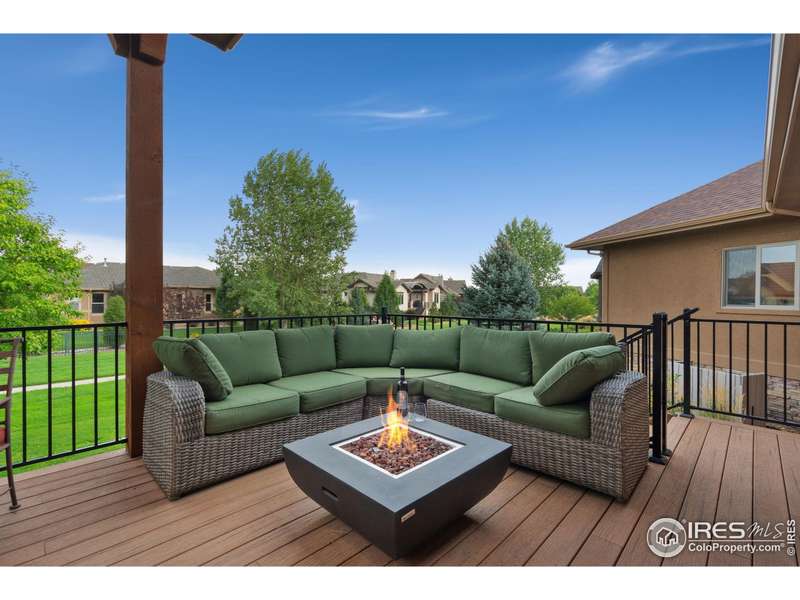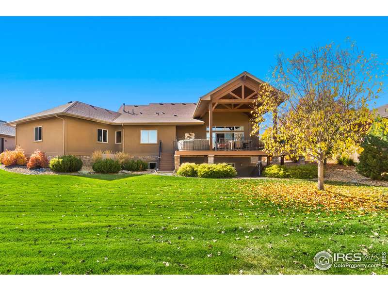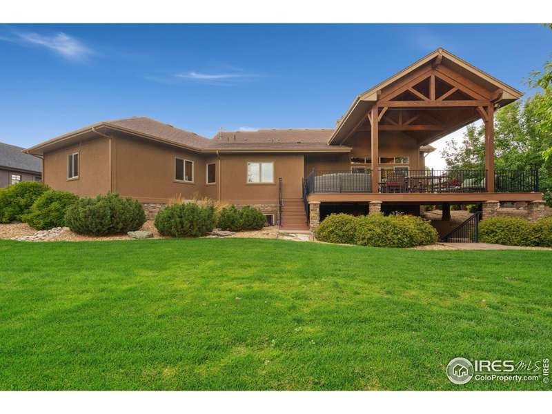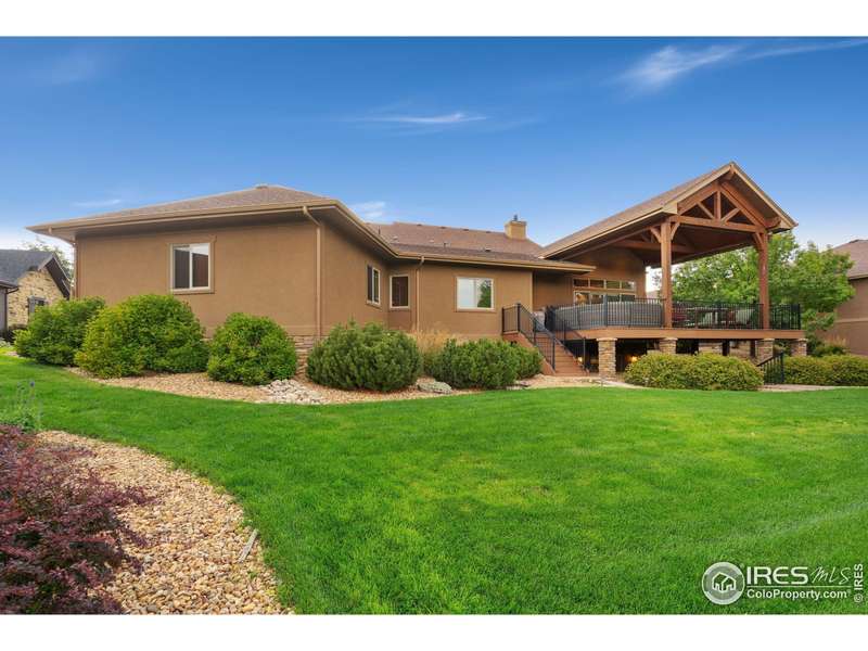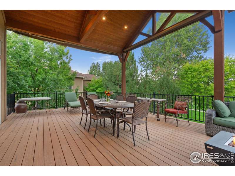 This beautifully crafted 4-bedroom home blends timeless architecture with high-end finishes. A covered front porch is ideal to enjoy mountain views. The floor-to-ceiling dual-sided stone fireplace separates the living rm from the spacious kitchen + dining areas. The gourmet kitchen features Thermador appliances, including a 5-burner range, convection oven, microwave, and refrigerator, with a tall eating bar ideal for casual dining +easy access to covered deck w auto shade. The primary suite offers spa-like amenities w/ dual glass vessel sinks, backlit mirrors, and walk-in closet. Additional main-level office / TV room adds flexibility, while laundry area has custom cabinetry, sink, +closet. Beautiful steel rod railing leads to walkout lower level w/ 3 bedrooms, full bath, family room w/wet bar, a workout area, + extra storage. One bedroom includes a built-in Murphy bed. The side-entry heated two-car garage offers bonus space currently used as a rec/sports area, with potential for a third bay or studio... 265 sq ft. Lot backs to private open space, but close to trails and Boedecker Lake. New carpet + paint and some lighting in lower level, new Lennox furnace installed 2024, new smoke alarms, radon mitigation complete, Pre-inspected and 5 year Roof Cert in place