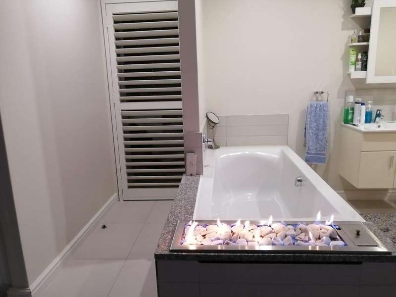 The master bedroom has a built-in gas fireplace which gives cozy warmth to the spectacular open plan bathroom. This leads out to a balcony with amazing sea views.