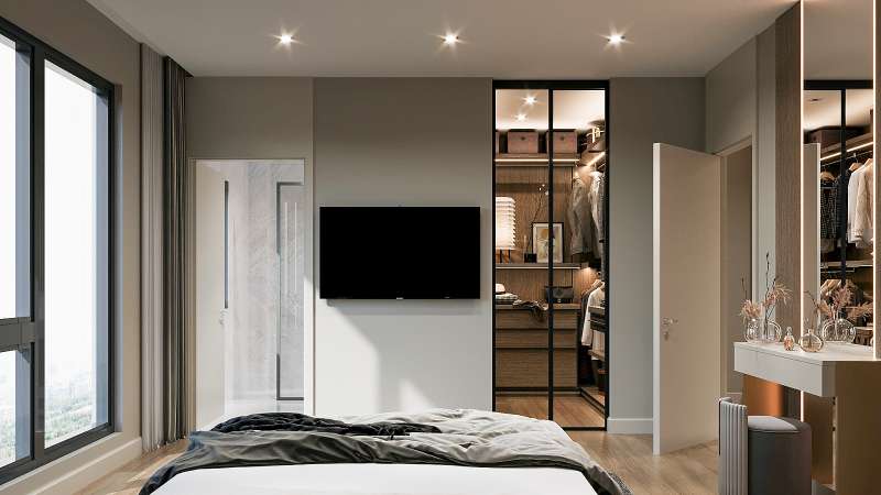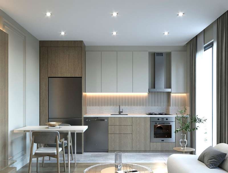 Apartments are equipped with automatic blinds, a smart home system, natural gas heating, triple-hung appliances, a lacquered cloakroom, doors and kitchen cabinets, and spotlights with LED lighting.