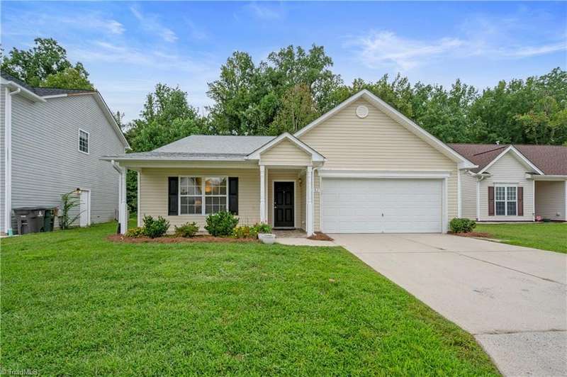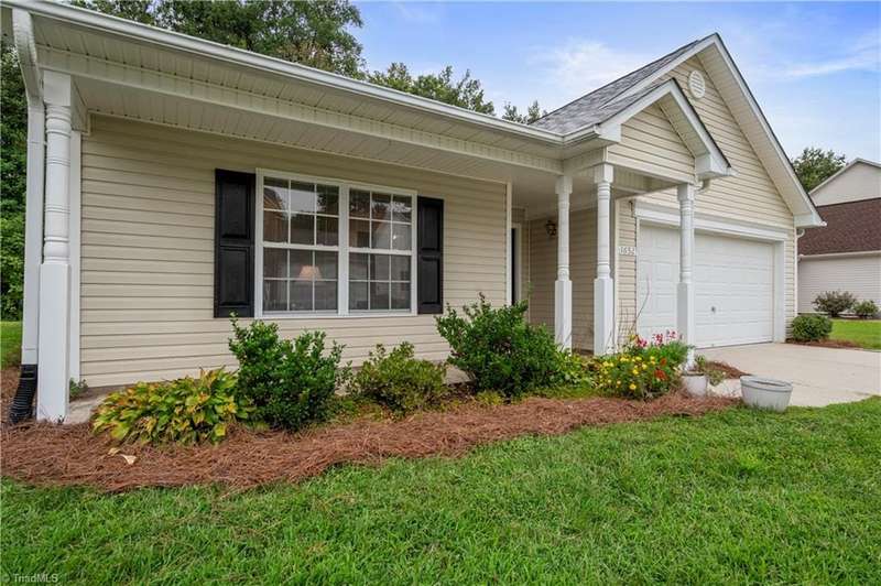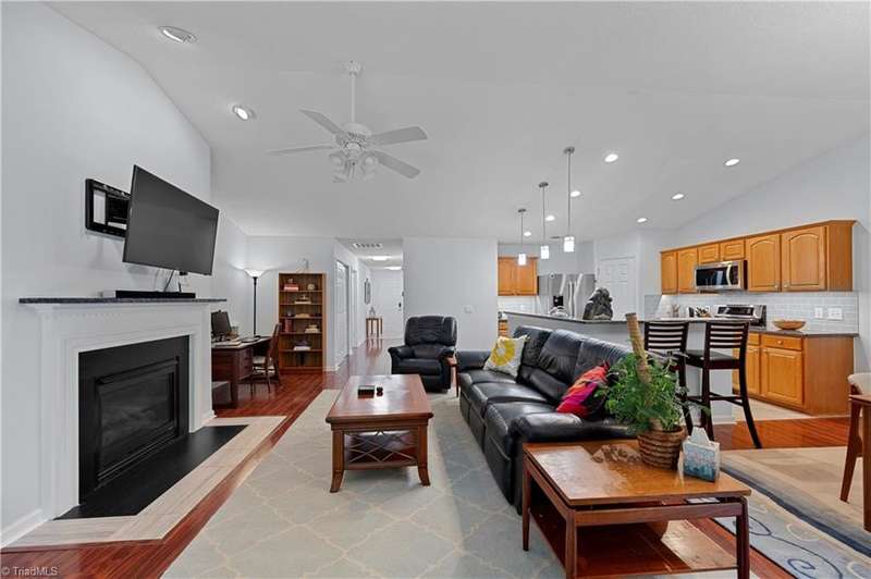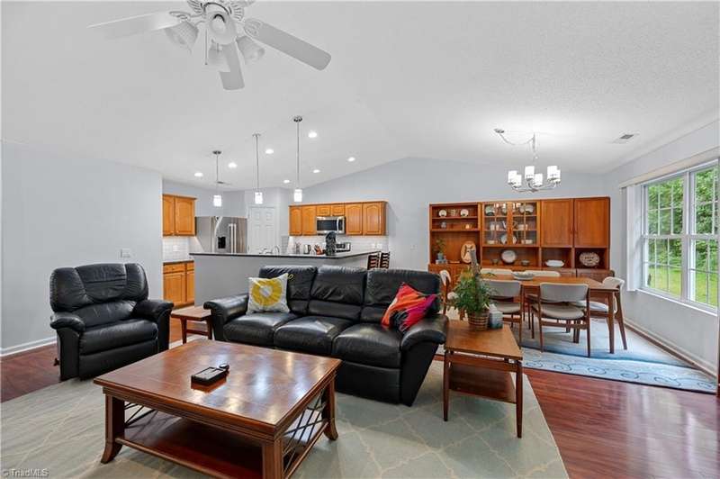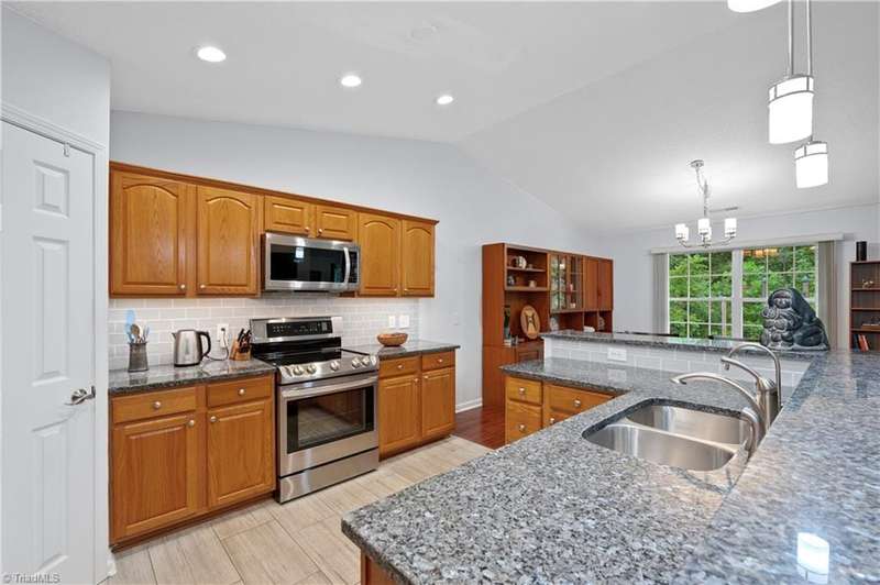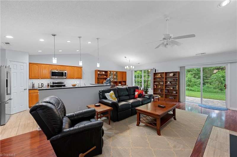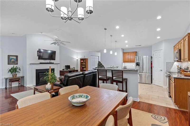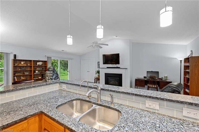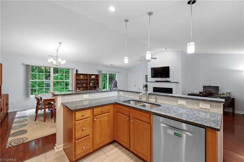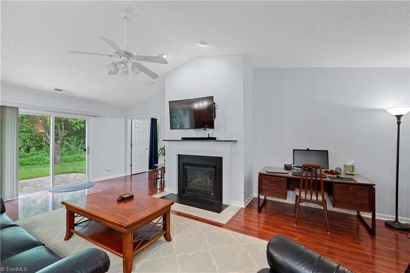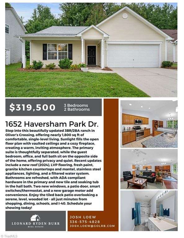 Step into this beautifully updated 3BR/2BA ranch in Olivers Crossing, offering nearly 1,800 sq ft of comfortable, single-level living. Sunlight fills the open floor plan with vaulted ceilings and a cozy fireplace, creating a warm, inviting atmosphere. The primary suite is thoughtfully separated, while the guest bedroom, office, and full bath sit on the opposite side of the home, offering privacy and quiet. Recent updates include a new roof (2024), flooring throughout, fresh paint, granite kitchen countertops and mantel, stainless steel appliances, lighting, and a filtered water system. Bathrooms are refreshed, with ADA compliant hardware in the primary and new tile and soaking tub in the hall bath. Two new windows, a patio door, smart switches/thermostat, and a new garage motor add convenience. Enjoy the tiled back patio overlooking a serene, level, wooded lot - all just minutes from shopping, dining, schools, and I-40. Schedule your showing today!