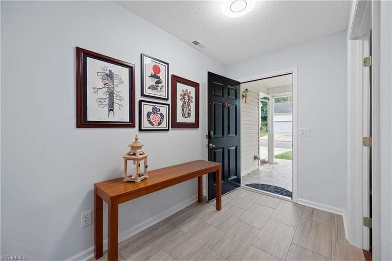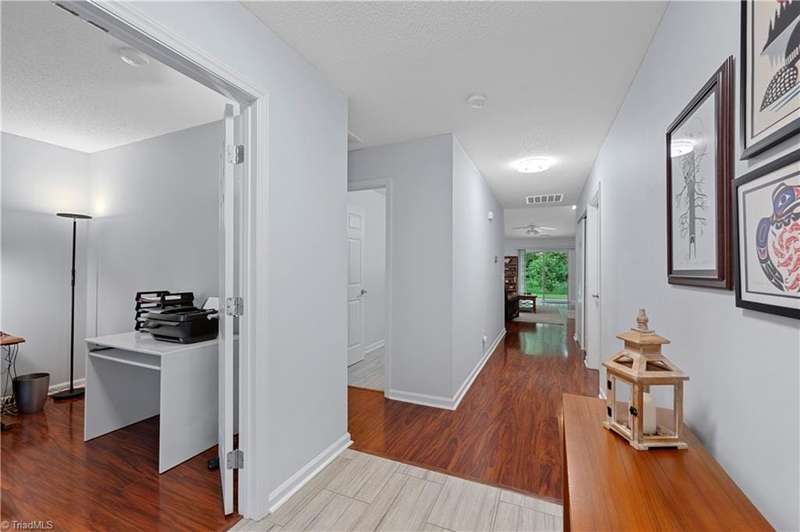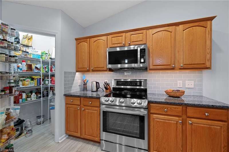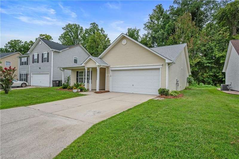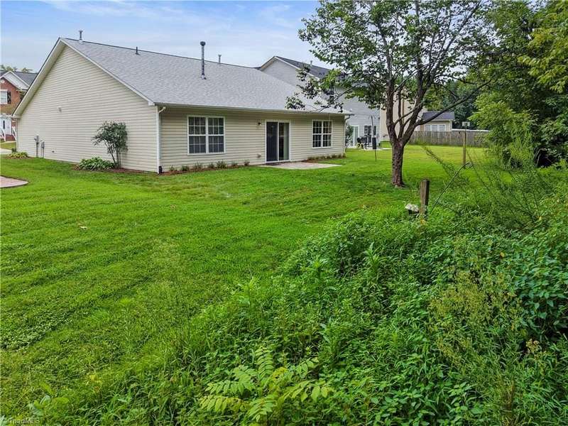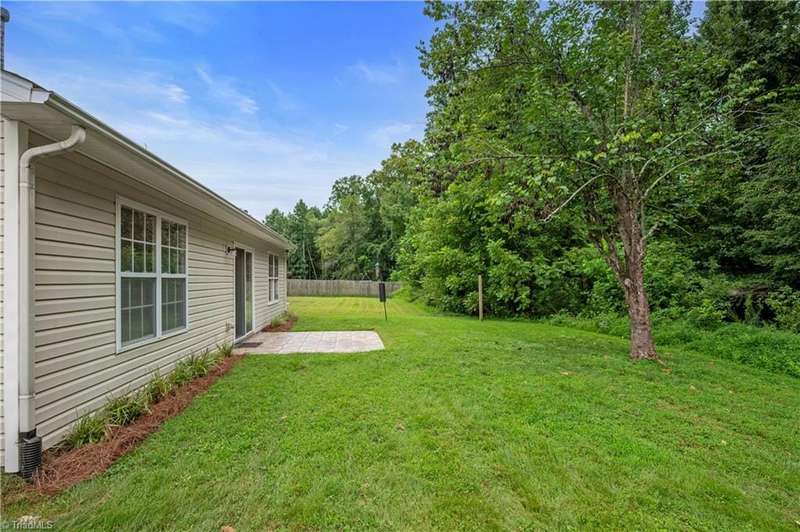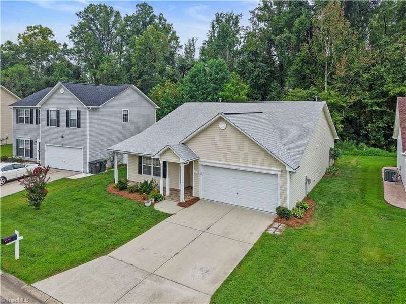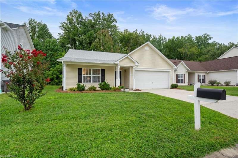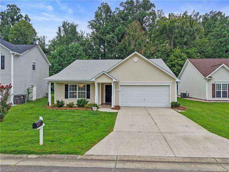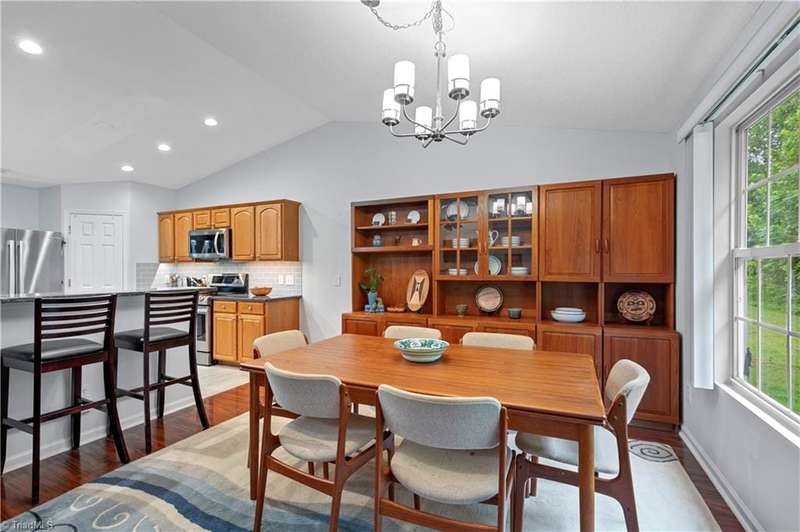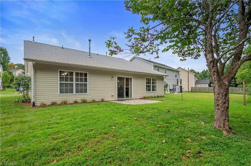 Step into this beautifully updated 3BR/2BA ranch in Olivers Crossing, offering nearly 1,800 sq ft of comfortable, single-level living. Sunlight fills the open floor plan with vaulted ceilings and a cozy fireplace, creating a warm, inviting atmosphere. The primary suite is thoughtfully separated, while the guest bedroom, office, and full bath sit on the opposite side of the home, offering privacy and quiet. Recent updates include a new roof (2024), flooring throughout, fresh paint, granite kitchen countertops and mantel, stainless steel appliances, lighting, and a filtered water system. Bathrooms are refreshed, with ADA compliant hardware in the primary and new tile and soaking tub in the hall bath. Two new windows, a patio door, smart switches/thermostat, and a new garage motor add convenience. Enjoy the tiled back patio overlooking a serene, level, wooded lot - all just minutes from shopping, dining, schools, and I-40. Schedule your showing today!