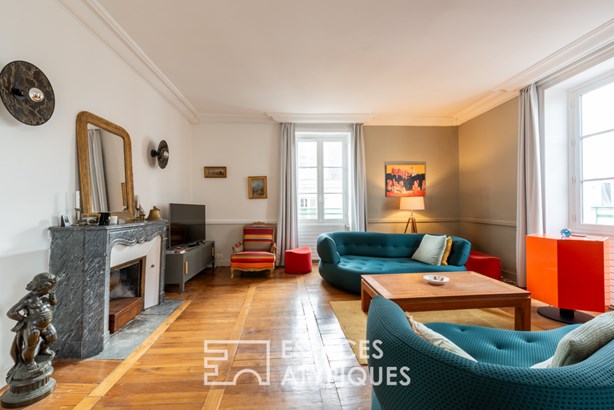 On the second floor, a pretty bedroom, a magnificent bathroom with intact Odorico mosaics. A work of art. A hallway with numerous storage spaces entirely made to measure, optimizing the under-staircase, which hides a subtle office: On the top floor, a landing (with storage) which can accommodate an office or a reading corner according to the wishes of its future owners :Then a very stylish bathroom as well as a bedroom, always nicely decorated and also provided with storage. Undeniably a high quality renovation. The house has a large double garage with very high ceilings. A major asset for this property located in the heart of Rennes. Also, a small laundry room is located behind the kitchen.
