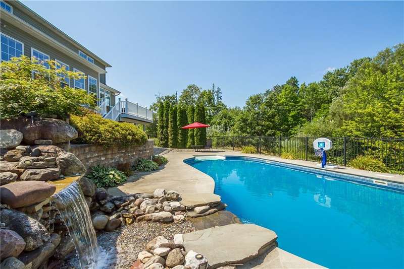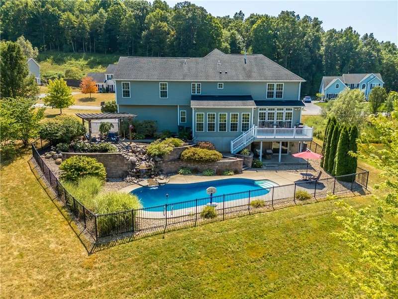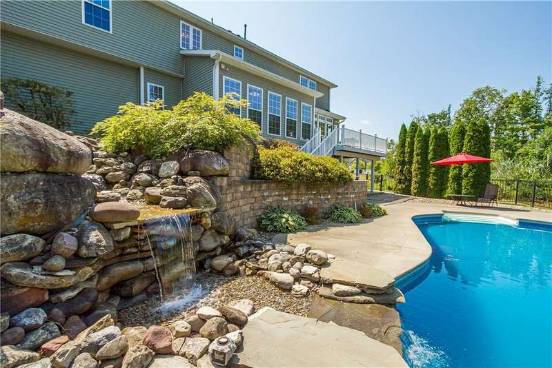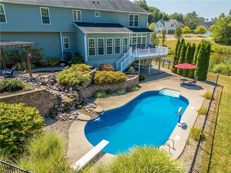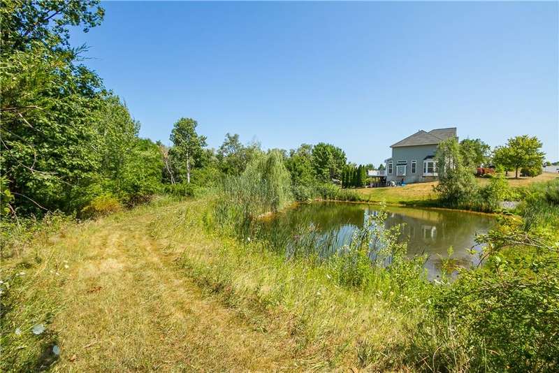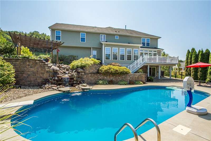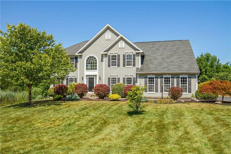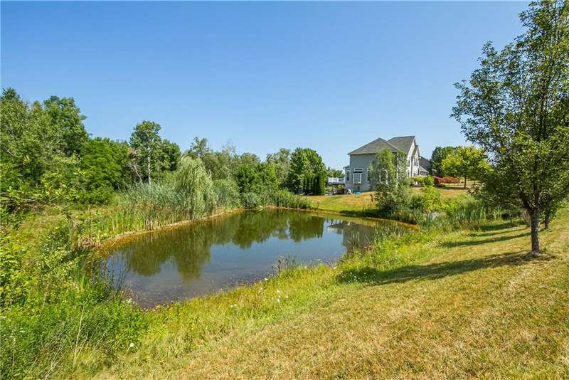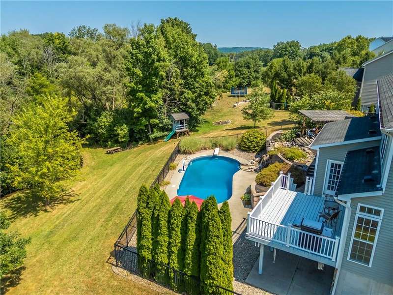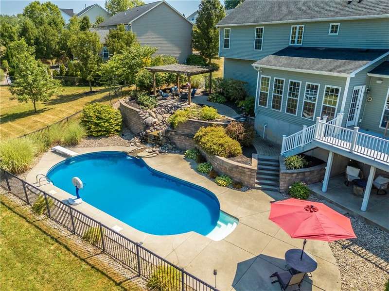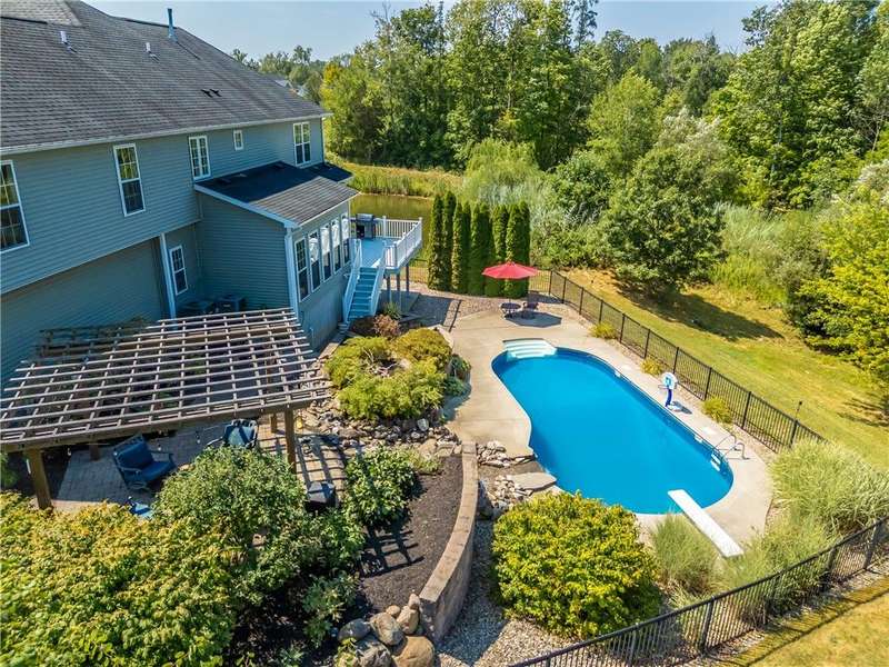 SPECTACULAR & GRAND RESORT-STYLE ESTATE situated on over 1.5 RARE ACRES with an in-ground pool featuring a gorgeous stone waterfall, a pond, and a creek meandering through the woods... all with a showcase DREAM HOME boasting over 4,000 sq ft of living space & high-end finishes! This is a rare opportunity to own a million-dollar backyard designed for making millions of memories, with exquisite landscaping & hardscaping, featuring a custom stone waterfall that trickles into the in-ground pool, surrounded by a patio area for sunbathing & cannonballs, an elevated deck & a paver patio with a pergola- truly an entertainer's dream backyard overlooking the scenic pond & creek! This stately home welcomes you with a GRAND TWO-STORY FOYER with a Palladian window & beautiful hardwood floors. The STUNNING GREAT ROOM offers phenomenal open living, featuring a designer kitchen with gorgeous cabinetry, high-end stainless steel appliances & an expansive center island breakfast bar overlooking the living area with a gas fireplace & a wall of windows. A SPECTACULAR VAULTED-CEILING MORNING ROOM with a wall of windows provides serene views of the backyard & access to the deck... perfect for both everyday living & upscale entertaining. An expansive formal dining room with crown molding & a chair rail. A spacious EXECUTIVE OFFICE with a bay window offers peaceful views of the pond. Convenient 1ST floor laundry & powder room complete the main level. Upstairs, the luxury continues with four spacious bedrooms and two full bathrooms, including a massive PRIMARY SUITE with two walk-in closets & a spa bathroom designed for relaxation. The ULTIMATE WALK-OUT LOWER LEVEL is built for fun and entertainment, with a custom bar, a spacious great room for games or activities, a movie theatre with elevated seating, plus a full bathroom (1,100 sq ft included in sq ft) This residence truly has it all?an entertainer's paradise, a private retreat, and a showcase property rolled into one. Premier location just minutes to the Hamlet of Mendon, Village of Victor, & Eastview Mall, with restaurants & shops, easy access to 490 & NYS Thruway! Negotiations 8/26/25 at 10 AM.