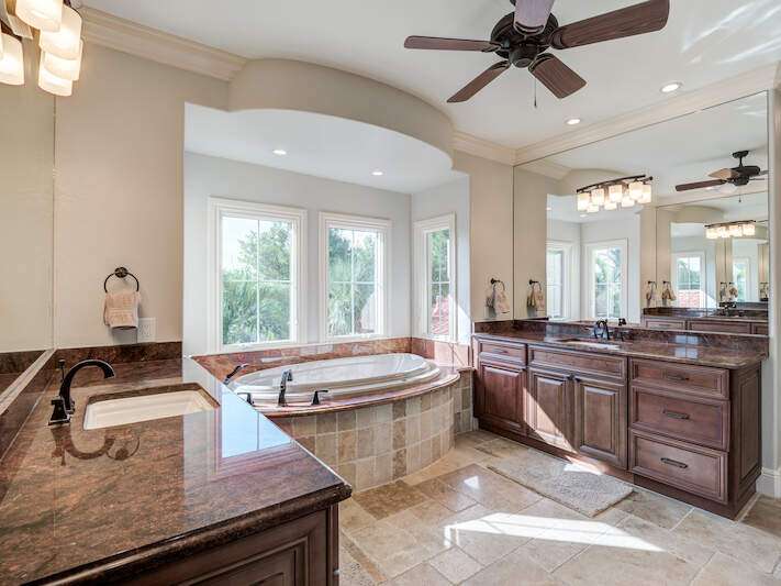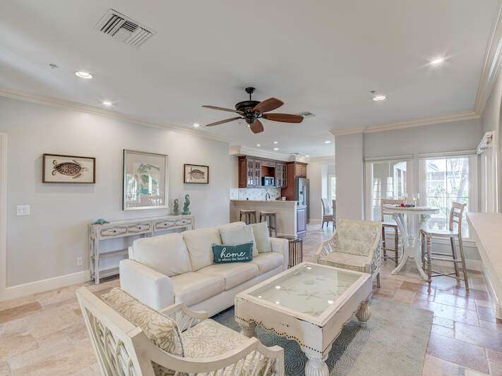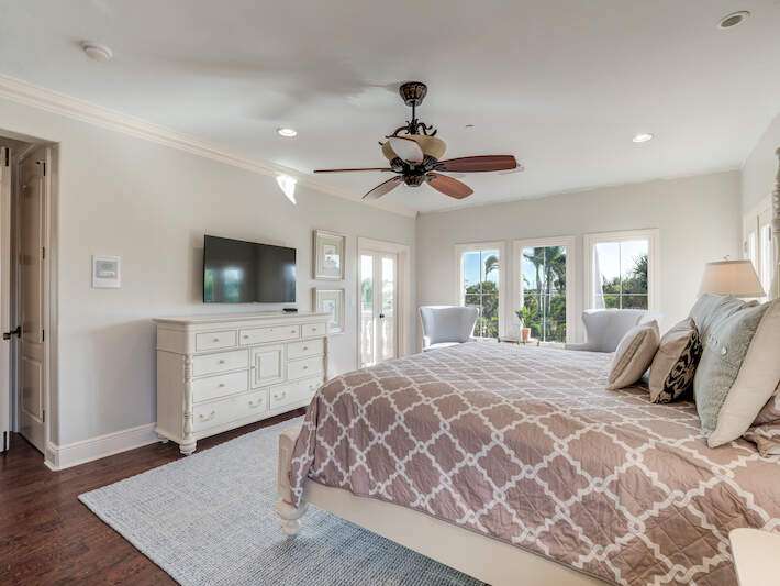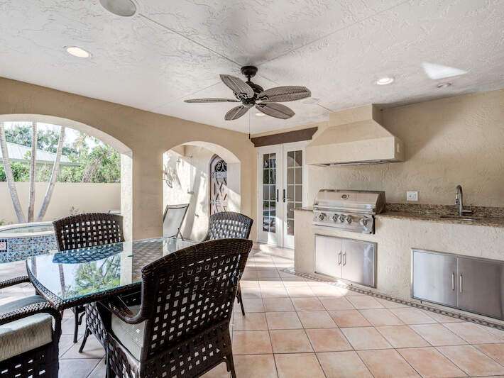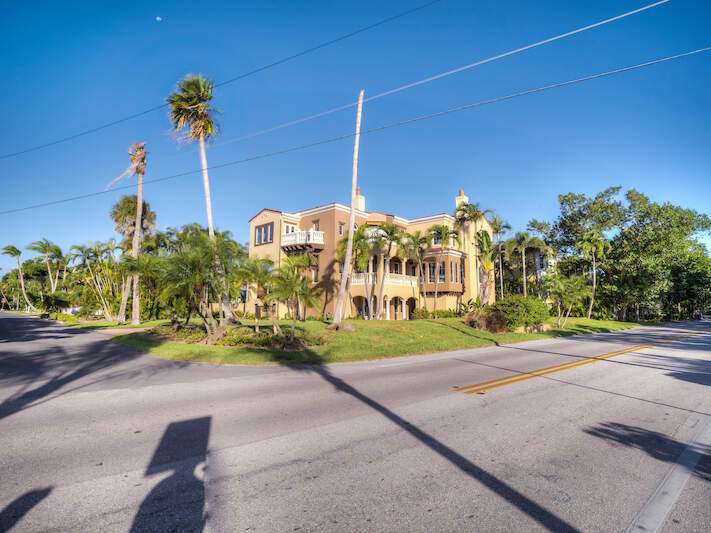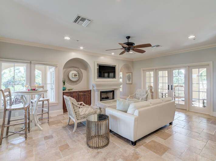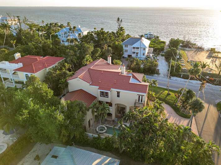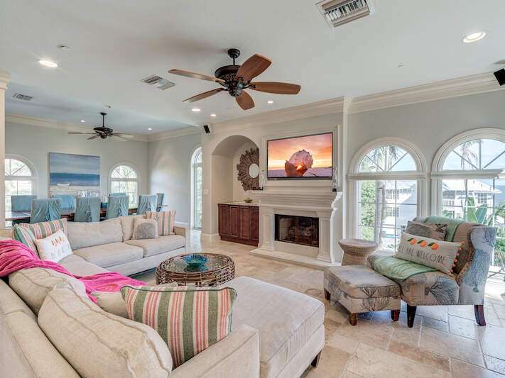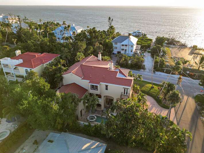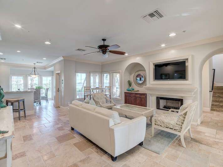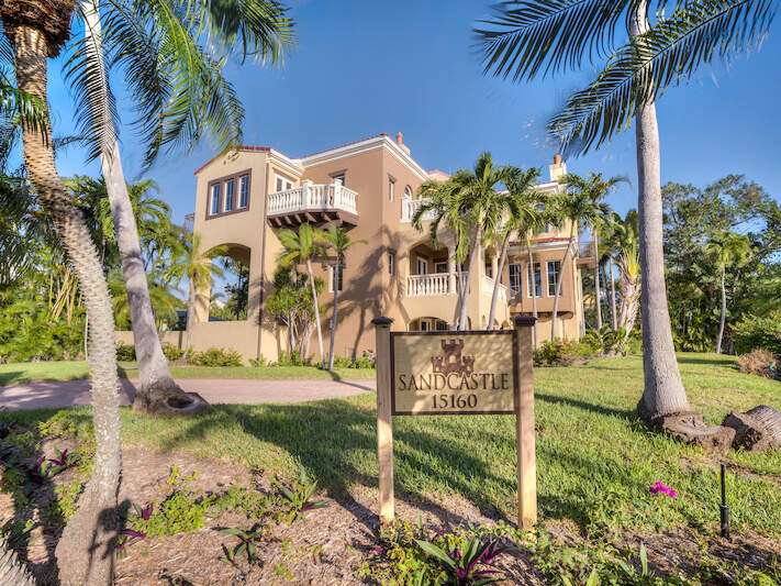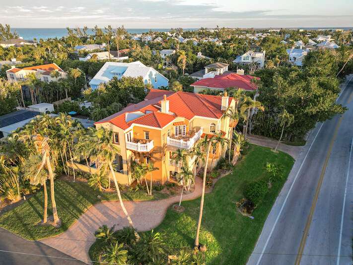 Experience the charm of Sandcastle, a stunning coastal estate with a unique reverse floor plan. This impressive 6-bedroom + den, 6.5-bath residence spans over 4,800 square feet, offering breathtaking bay views from its multi-level decks. Designed in Coastal Tuscan style, the home features luxurious touches throughout, including travertine floors in the living areas, wood floors in the bedrooms, and soaring 10+ ft ceilings with elegant crown molding. The spacious layout boasts multiple living rooms, en-suite bedrooms, an elevator, a morning kitchen, and a private in-law suite. The chef's kitchen is a culinary dream, featuring a gas stove, stainless steel appliances, granite countertops with a breakfast bar, a walk-in pantry, custom wood cabinetry, an oversized sink, and a dedicated bar area. Enjoy the #IslandLifestyle with your private pool and spa, multiple covered and open patios, or a short walk to the beach. Sandcastle is conveniently located near the Village, renowned restaurants, and plenty of shopping, offering everything you need to embrace the #CaptivaLifestyle.