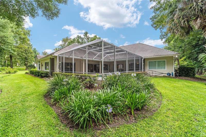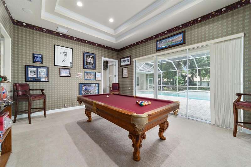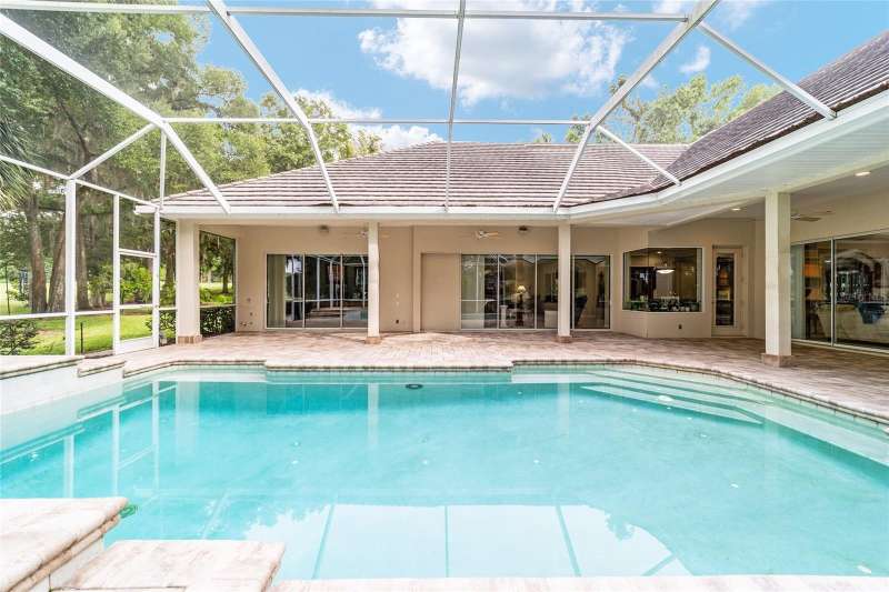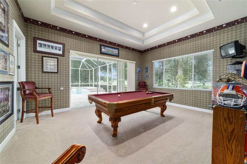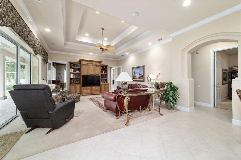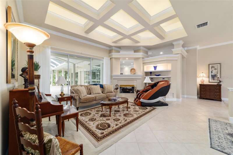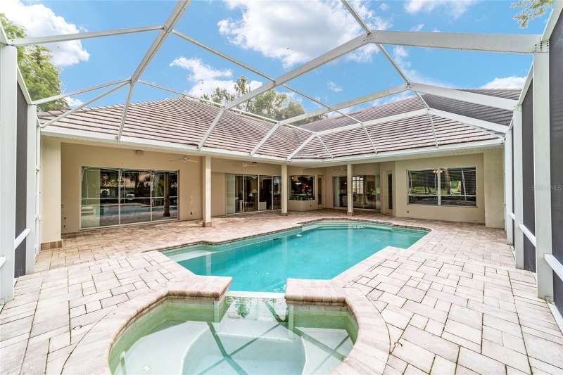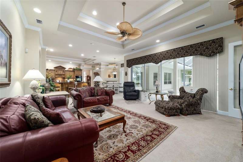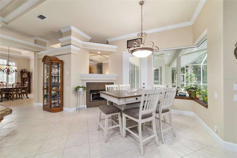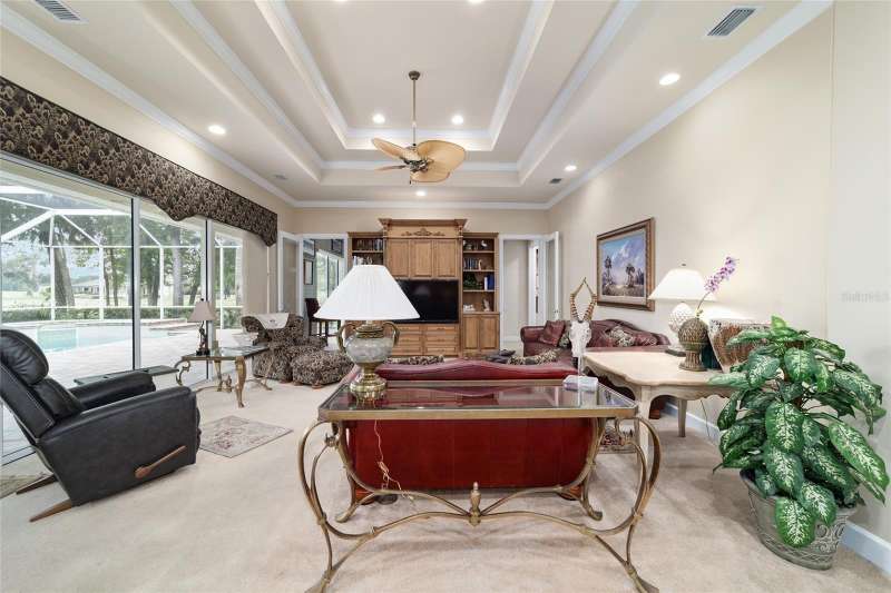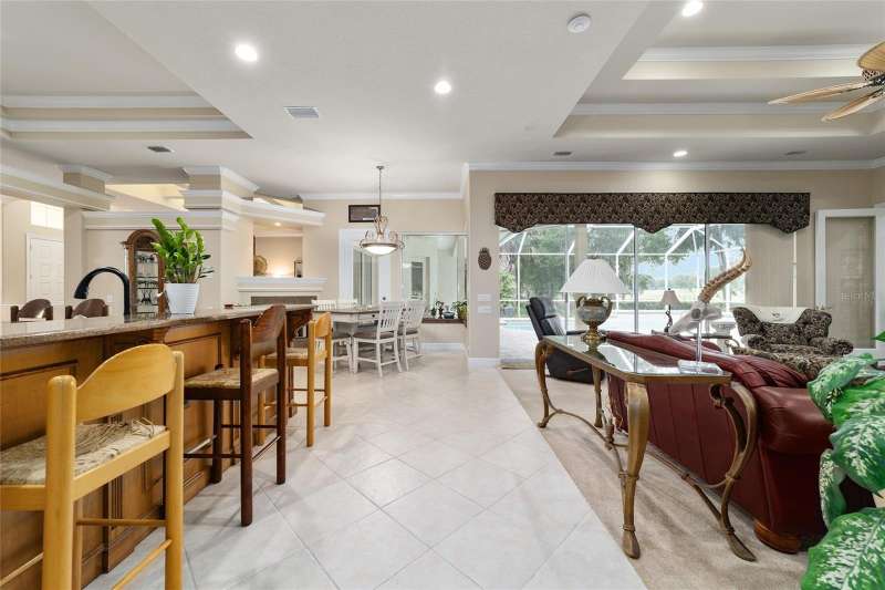 Welcome to this stunning 4 bedroom/3 bath Rutenberg-built home, with 4,614 sq ft of living square footage and situated in a gated golf community with beautiful views of the 18th hole. Step inside to find a well-planned triple split floor plan that includes formal living and dining rooms, a private office, and a spacious bonus/game room with sliders that open out to the pool. Enjoy movie nights in your very own theater room—perfect for entertaining guests or relaxing with family. The heart of the home is the expansive kitchen, featuring abundant cabinetry and a large center island complete with granite countertops. A cozy breakfast room shares double sided fireplace with formal living room and has a mitered glass window overlooking the pool and lanai. The family room, with built-ins also opens to the pool area with sliding glass doors, creating a seamless indoor-outdoor flow. The spacious primary suite has large walk-in closets and a spa-like bath. Bedroom 2 has its own private bath, while Bedrooms 3 and 4 share a convenient Jack and Jill layout. Step outside to your private backyard oasis! The screen-enclosed covered lanai offers a shaded retreat, while the saltwater pool is surrounded by a beautiful pavered deck—perfect for soaking up the sun or entertaining friends and family. Additional features include a spacious laundry room, an attached 3-car garage, and a detached garage for extra storage or hobbies. With its spacious layout and unbeatable golf course views, you won’t want to miss this one!!