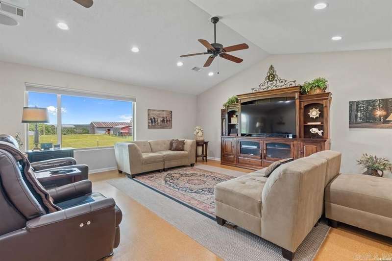 **Charming Ranch Estate Retreat! Your Dream Homestead Awaits!** Welcome to your private oasis! Nestled in the heart of nature, this stunning ranch estate offers a harmonious blend of rural charm and modern convenience, perfect for horse lovers and hobby farmers alike. The home sits on top of ridge with views in all directions. Step inside and be greeted by an expansive open-concept layout where a vaulted ceiling soars overhead, creating a bright airy feeling throughout. Beautiful cork floors underfoot not only add a warm aesthetic, but also provide both durability and style. Enjoy preparing meals in the kitchen while you entertain family and friends. Custom soft close cabinets, large island and upscale appliances make it easy to enjoy. Just off of the kitchen you will find a very large screened in porch where you will enjoy soft breezes and beautiful views. The spacious master suite features a luxurious ensuit with his/hers walk in closets. The large master bath features his/her vanities, water closet and a large shower. The Second and Third bedroom are thoughtfully placed on the other side of the home from privacy. The third bedroom is currently being utilized as an home office