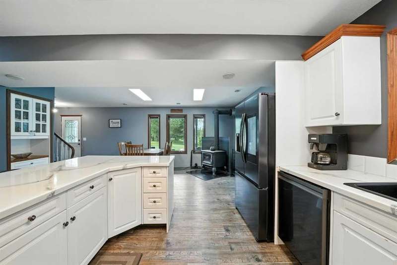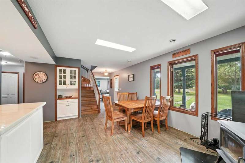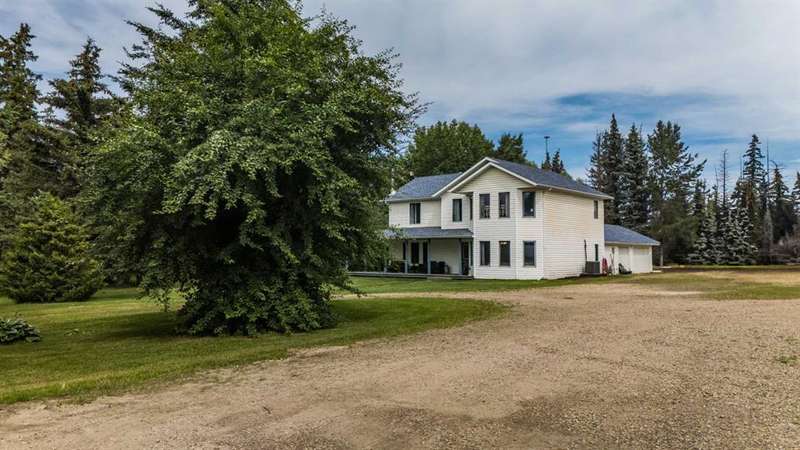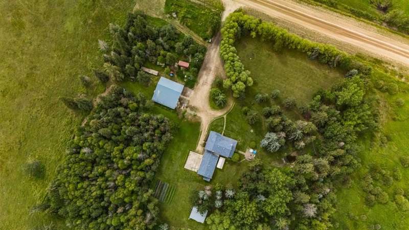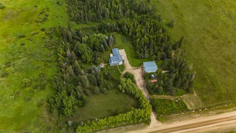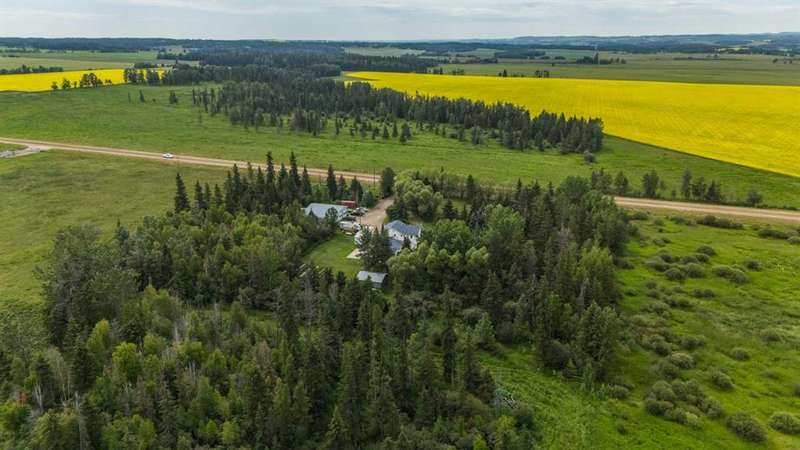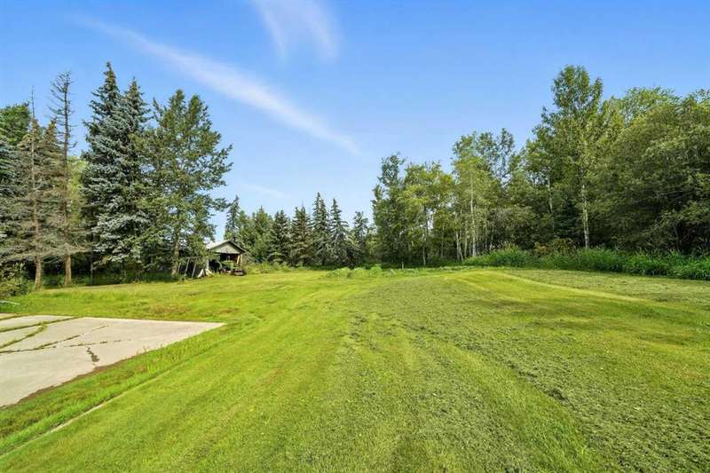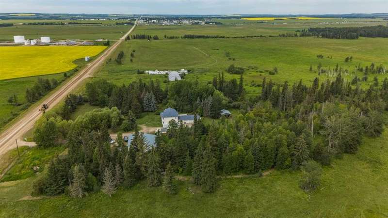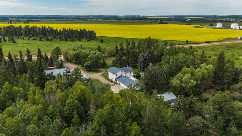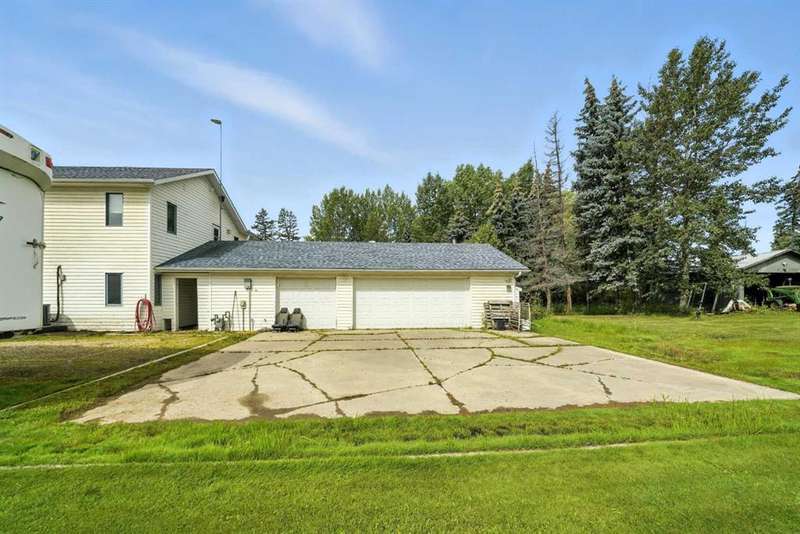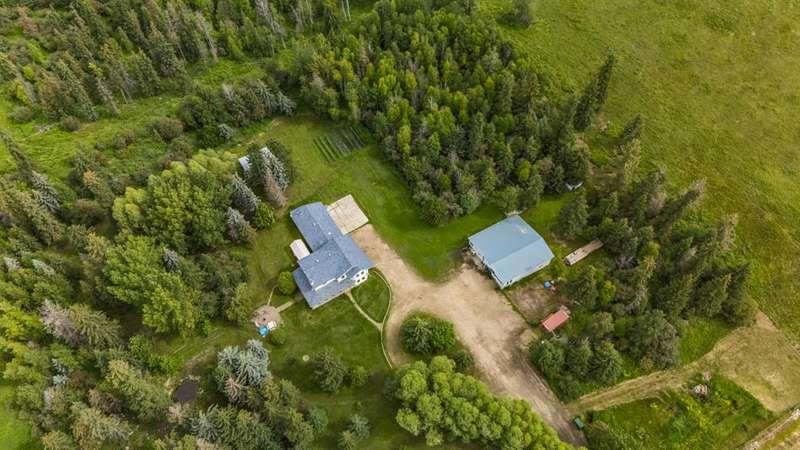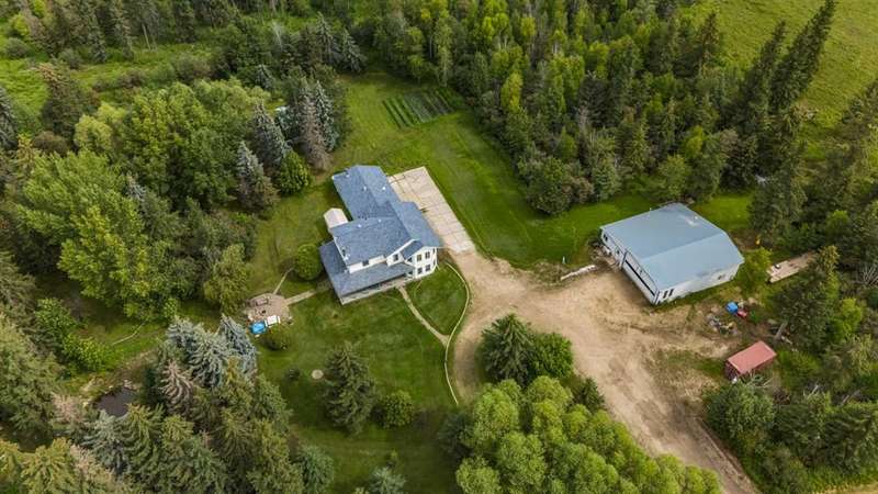 This is it! Set on 5.26 private acres, just 1 mile from Rimbey, this beautifully treed acreage offers the best of both worlds—peaceful rural living with quick access to amenities. Enjoy walking trails, a pond, and a firepit area, all nestled within mature trees for ultimate privacy. The home is set back from the road with a teardrop driveway, creating a welcoming and secluded approach. A covered wraparound deck surrounds the house, and large windows flood the interior with natural light. The heart of the home features a spacious kitchen with brand-new black stainless appliances, vinyl plank flooring throughout main and new epoxy countertops. The massive primary suite includes a full ensuite, while three additional bedrooms and an upper-floor laundry provide space and convenience for the whole family. A triple car garage, connected to the home by a breezeway, includes its own bathroom—perfect for those working outdoors. Need more space? The impressive 44x48 heated shop comes fully equipped with water, a bathroom, auto lift, 220V, and a compressor—a dream setup for any hobbyist or home-based business. Recent upgrades include: Vinyl Plank Flooring throughout main floor (2025), Kitchen appliances, 2023), Woodstove (2023), Hot Tub (2023), Air Conditioner (2023), Hot water tank (2019), Furnace (2019), Shingles (7 years old). This acreage offers tremendous value and endless potential—perfect for families, entrepreneurs, or anyone seeking space, privacy, and country charm just minutes from town.