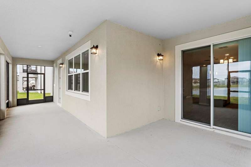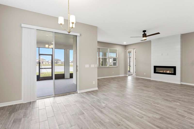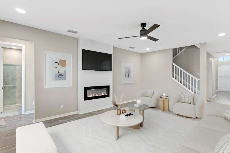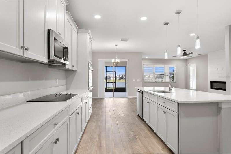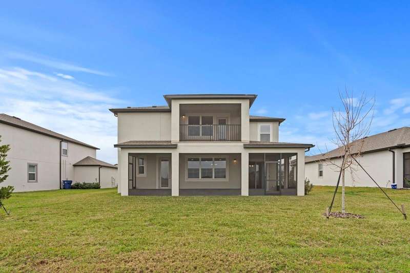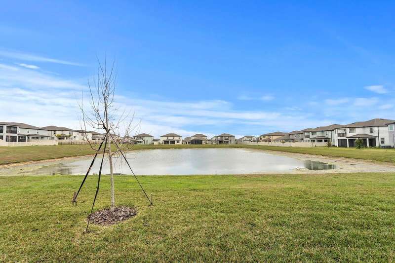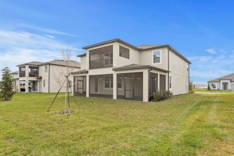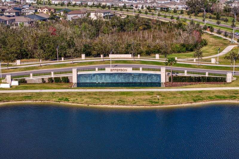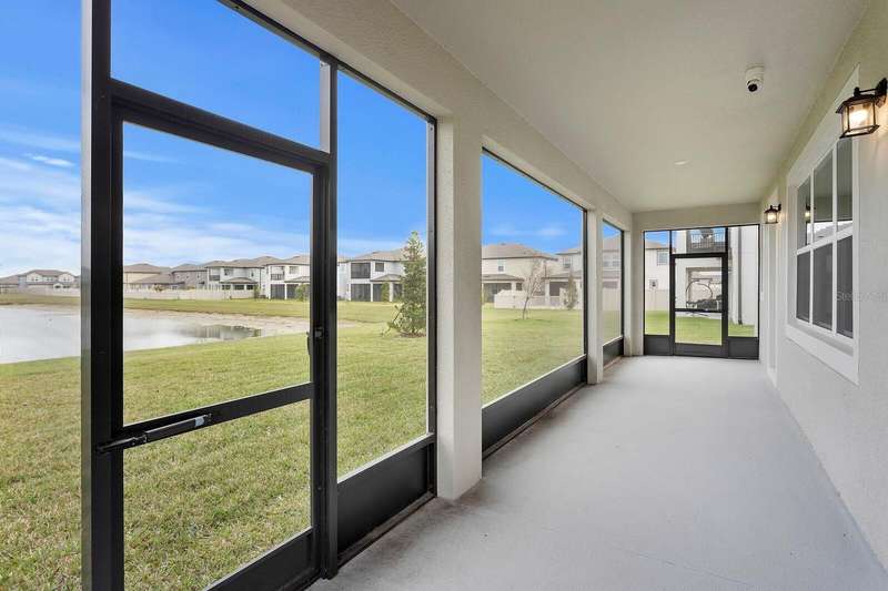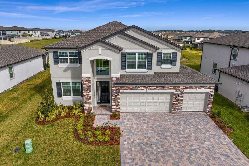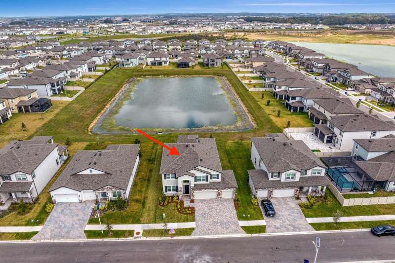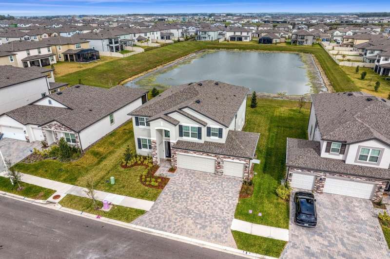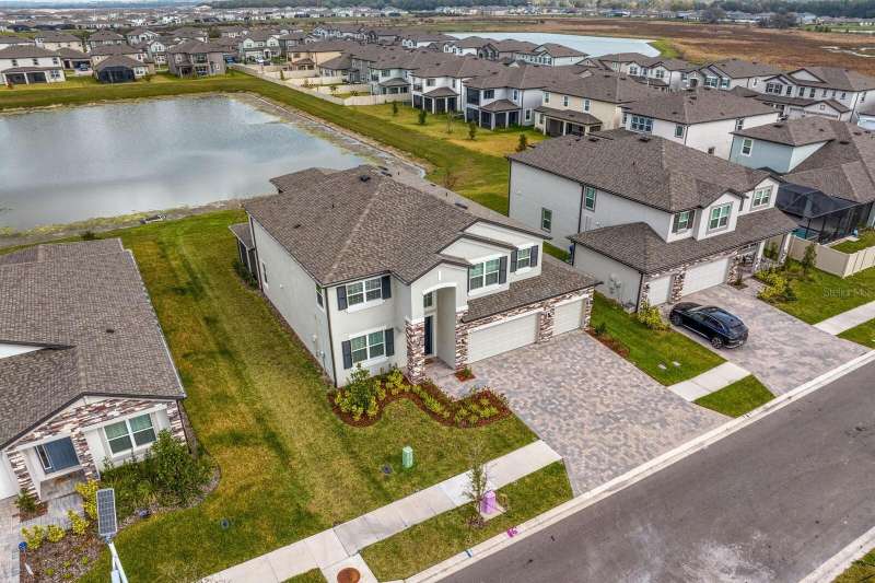 One or more photo(s) has been virtually staged. +++++++This brand-new, never-lived-in home, purchased in 2024, is a true masterpiece featuring over $140K in premium upgrades. Boasting 3,761 sq. ft., this stunning 5-bedroom, 5-bathroom residence is perfectly positioned on a picturesque waterfront homesite in the sought-after Epperson Ranch community. Thoughtfully designed for modern living, this 2024-built home showcases luxury and innovation, including wood plank tile flooring, a 50-amp car charger, a striking 48” electric fireplace, extra LED can lighting, tray ceilings, and a spacious 15x18 balcony. A Smart Home thermostat adds convenience and efficiency. The open floor plan includes two master suites (one upstairs, one downstairs), five full bathrooms, a private den/office, a large family room, and a massive bonus/media room with a pool bath that leads to the oversized screened lanai. The gourmet kitchen is a showstopper with sleek quartz countertops, stainless steel appliances, a large island with drop pendant lighting, double ovens, and a spacious butler’s pantry with custom shelving. A flexible space near the kitchen can serve as a formal dining room or additional office. Upstairs, you’ll find four generously sized bedrooms, a loft, and a versatile bonus room, perfect for movie or game nights. Step outside to your private backyard retreat featuring an extended screened lanai with breathtaking waterfront views, creating an ideal setting for relaxation and entertaining. Additional features include a three-car garage with epoxy-coated flooring, two automatic garage door openers, a 50-amp circuit for electric vehicle charging, pre-plumbing for a water softener, and reclaimed water for irrigation. Located in the highly desirable Epperson Ranch, residents enjoy access to the Crystal Lagoon, a 7-acre tropical paradise featuring swimming, kayaking, paddleboarding, a floating obstacle course, water slides, a rock-climbing wall, and a sandy beach. The community also offers a swim-up bar and Lagoon Café for refreshments. Conveniently located near top-rated schools, shopping, dining, and major highways, this exceptional property offers the ultimate Florida lifestyle. Don’t miss this incredible opportunity—schedule your showing today!