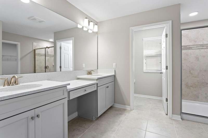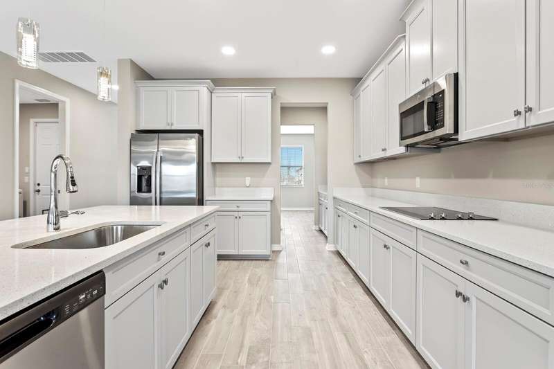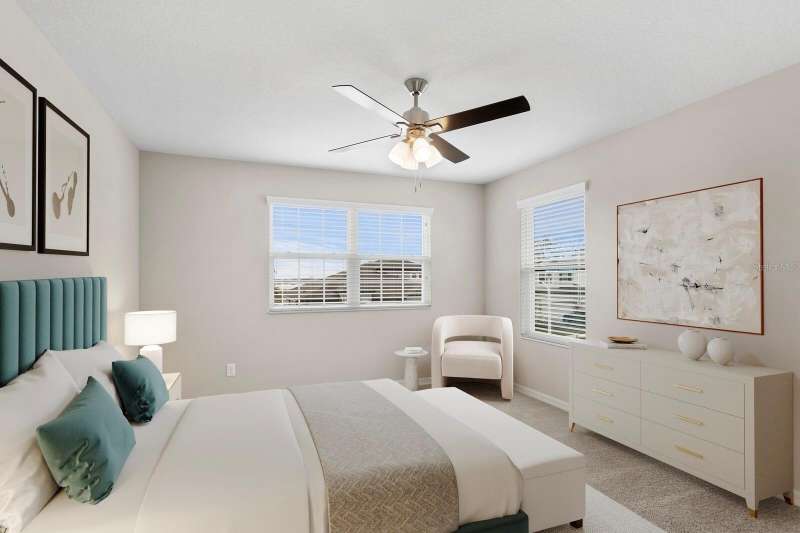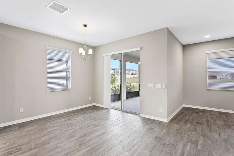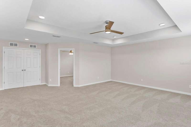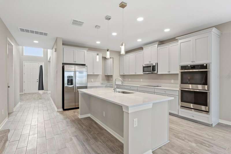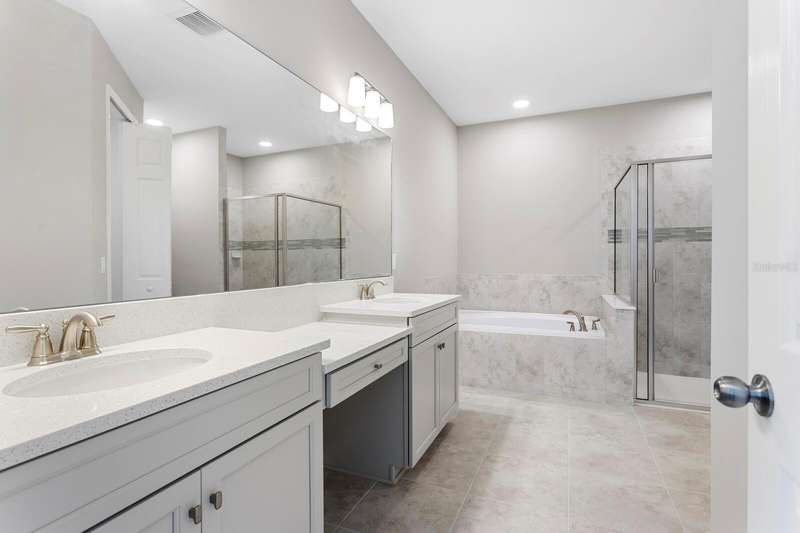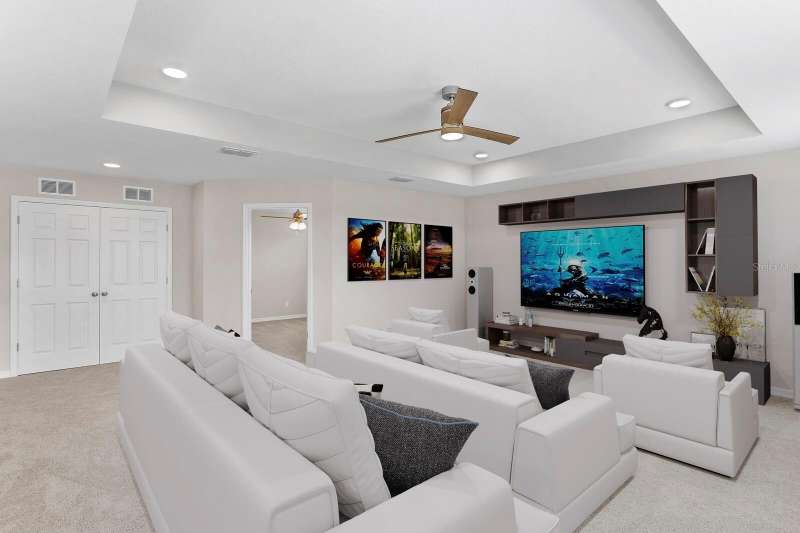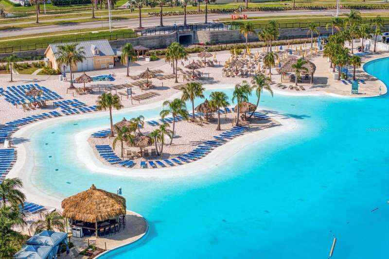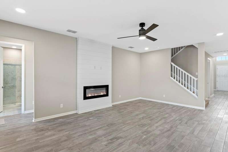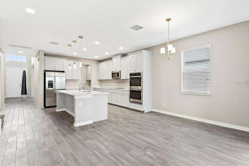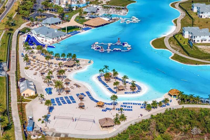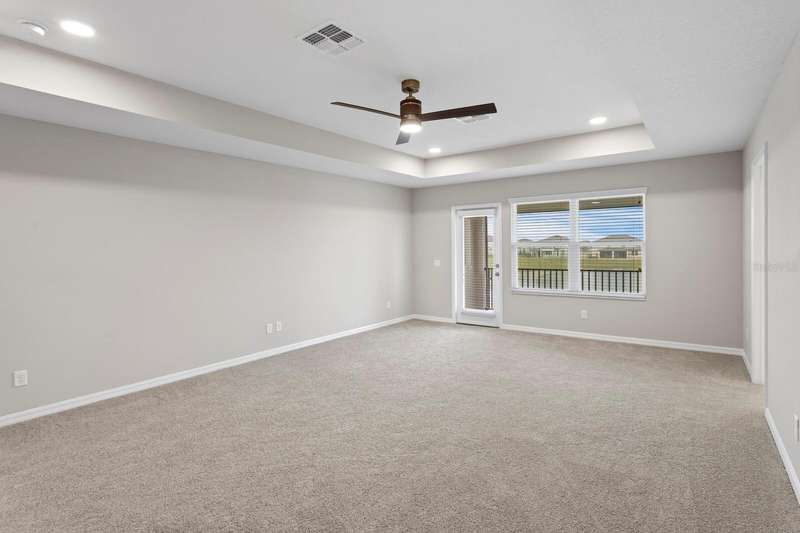 One or more photo(s) has been virtually staged. +++++++This brand-new, never-lived-in home, purchased in 2024, is a true masterpiece featuring over $140K in premium upgrades. Boasting 3,761 sq. ft., this stunning 5-bedroom, 5-bathroom residence is perfectly positioned on a picturesque waterfront homesite in the sought-after Epperson Ranch community. Thoughtfully designed for modern living, this 2024-built home showcases luxury and innovation, including wood plank tile flooring, a 50-amp car charger, a striking 48” electric fireplace, extra LED can lighting, tray ceilings, and a spacious 15x18 balcony. A Smart Home thermostat adds convenience and efficiency. The open floor plan includes two master suites (one upstairs, one downstairs), five full bathrooms, a private den/office, a large family room, and a massive bonus/media room with a pool bath that leads to the oversized screened lanai. The gourmet kitchen is a showstopper with sleek quartz countertops, stainless steel appliances, a large island with drop pendant lighting, double ovens, and a spacious butler’s pantry with custom shelving. A flexible space near the kitchen can serve as a formal dining room or additional office. Upstairs, you’ll find four generously sized bedrooms, a loft, and a versatile bonus room, perfect for movie or game nights. Step outside to your private backyard retreat featuring an extended screened lanai with breathtaking waterfront views, creating an ideal setting for relaxation and entertaining. Additional features include a three-car garage with epoxy-coated flooring, two automatic garage door openers, a 50-amp circuit for electric vehicle charging, pre-plumbing for a water softener, and reclaimed water for irrigation. Located in the highly desirable Epperson Ranch, residents enjoy access to the Crystal Lagoon, a 7-acre tropical paradise featuring swimming, kayaking, paddleboarding, a floating obstacle course, water slides, a rock-climbing wall, and a sandy beach. The community also offers a swim-up bar and Lagoon Café for refreshments. Conveniently located near top-rated schools, shopping, dining, and major highways, this exceptional property offers the ultimate Florida lifestyle. Don’t miss this incredible opportunity—schedule your showing today!