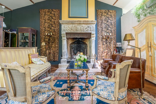 Entirely renovated with noble materials and quality fittings, it combines old-world charm with contemporary comforts such as a heat pump. Its workshop converted into a reception room with an antique fireplace and ornamental pond adds a rare and inspiring dimension to the whole.