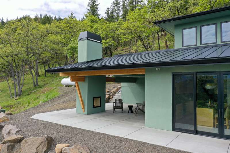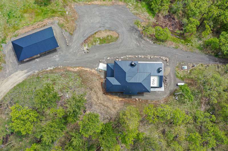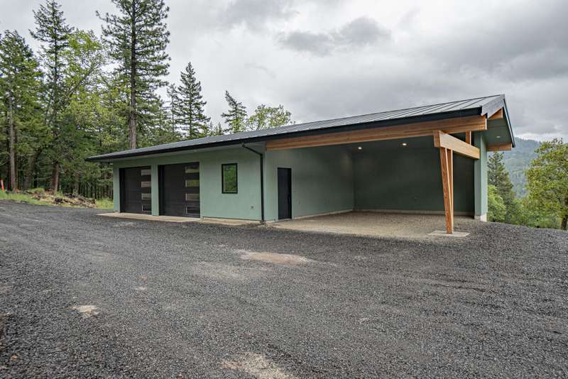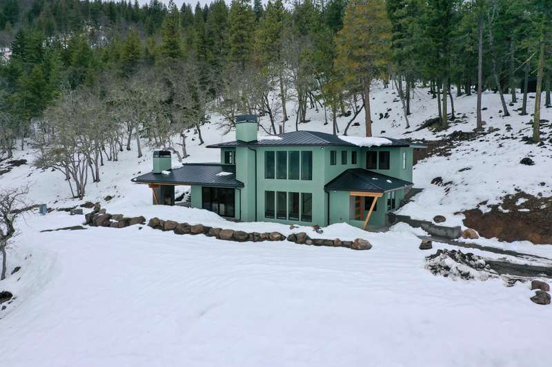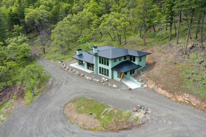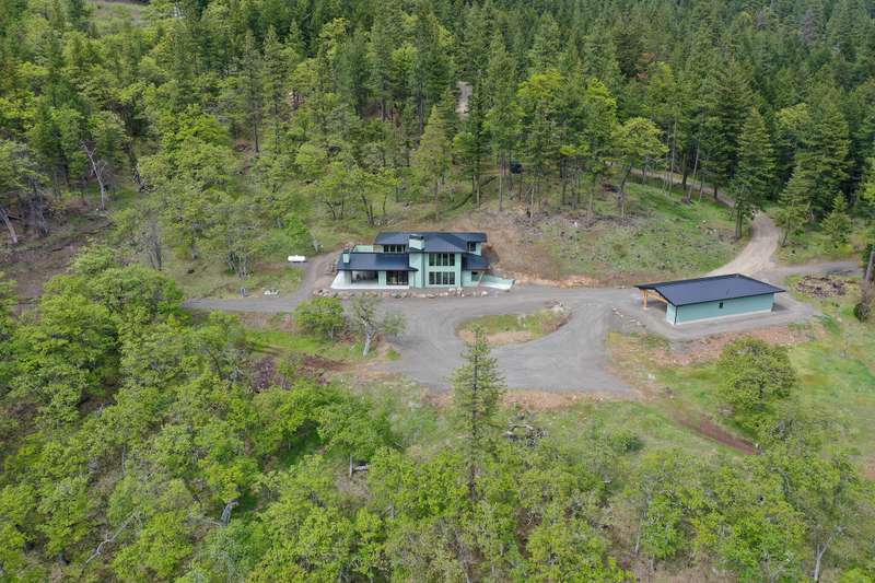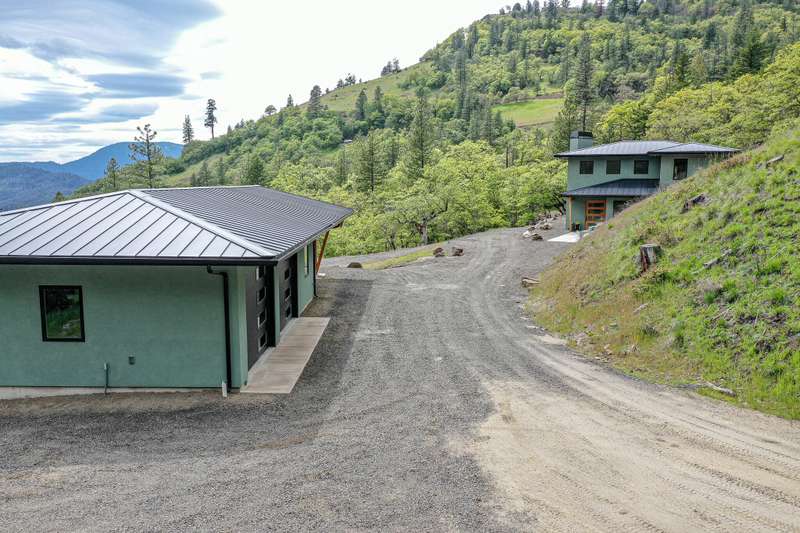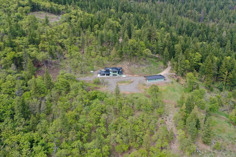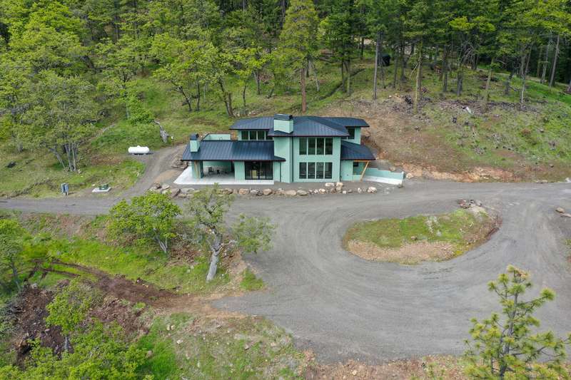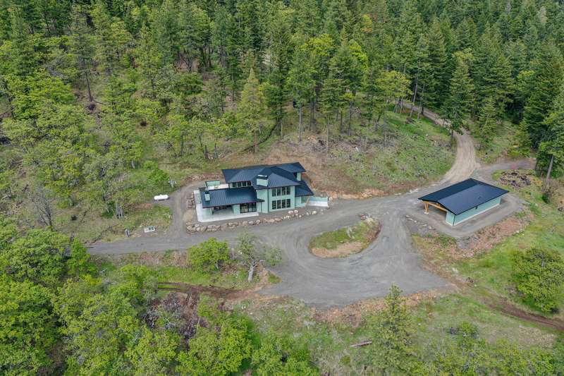 Stunning new contemporary home with mountain views on 20+ private acres! Interior highlights include natural hickory and maple hardwood floors and steps; porcelain tile in kitchen, bathrooms and great room, granite counter tops, washer and dryer in upstairs primary bedroom closet and connections for a second set up downstairs, windows wired for electric blinds or shades, beautiful stone fireplace all the way to the ceiling, all Dacor appliances. The exterior has stucco siding, and a metal roof on both the main house and detached garage. The oversized garage has enough space for 2 cars plus a shop area with ample lighting, EV charging outlet, and a heated full bathroom. The garage also has an attached 2 car carport. The covered patio boasts an outdoor fireplace and the upstairs balcony off of the primary bedroom is a perfect place to accommodate a hot tub and enjoy the views. There is also a 200 amp service to the home and an additional 200 amp service for future construction.