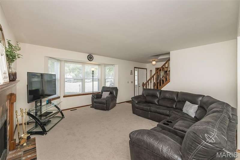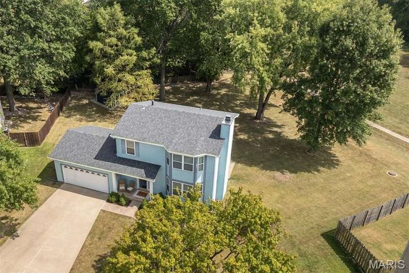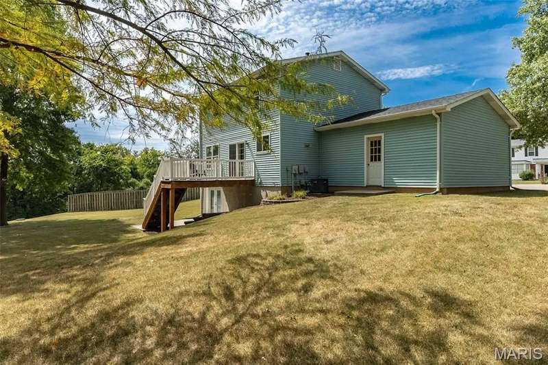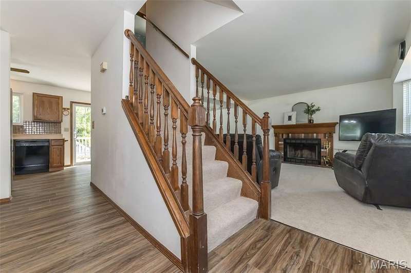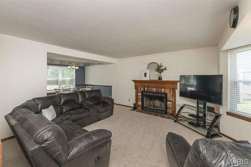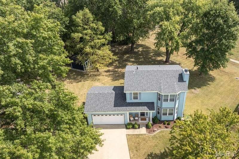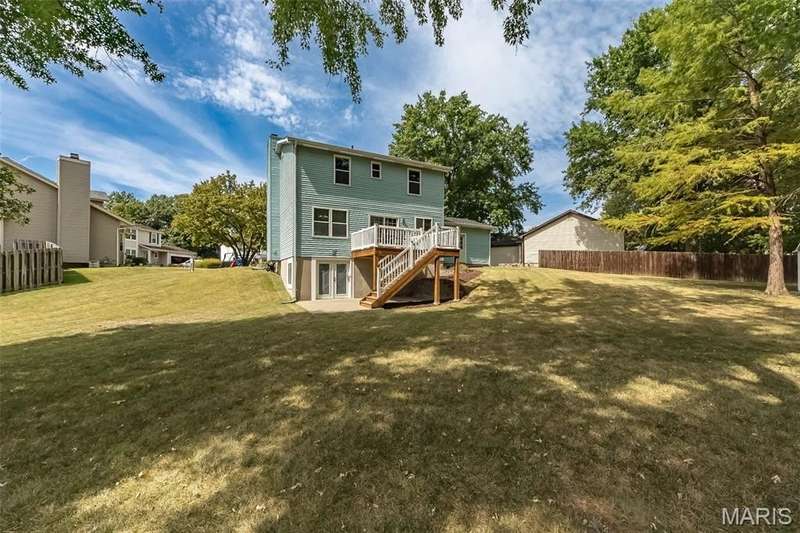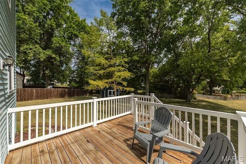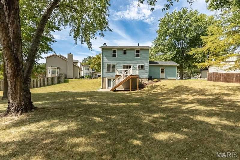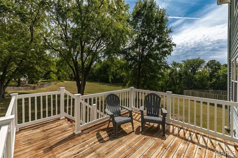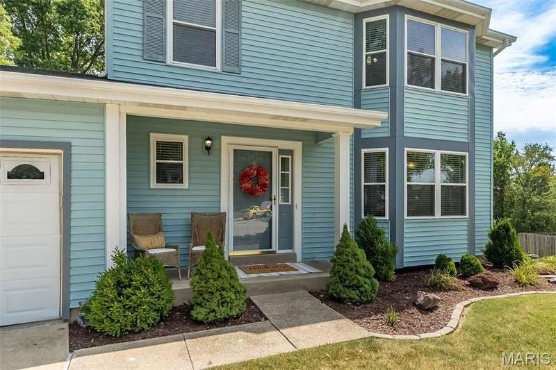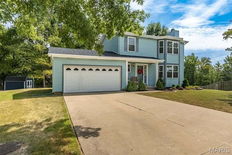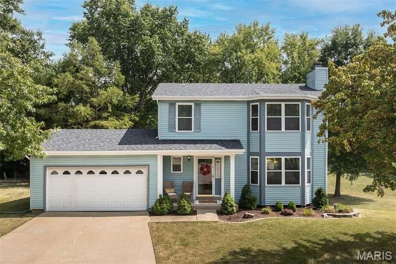 Welcome to this lovingly maintained 2-story gem in the heart of St. Peters! Nestled at the end of a quiet cul-de-sac in a desirable neighborhood with pool access and top-rated schools, this home has been cared for by the same owners for nearly 30 years, and it shows. Situated on a spectacular 0.3+ acre lot backing to peaceful common ground, the setting offers both privacy and space to enjoy the outdoors. Step inside to discover new flooring throughout — luxury vinyl plank on the main level and plush new carpet upstairs. The inviting family room features a cozy wood-burning fireplace and bay window, while kitchen shines with stainless steel appliances, tile backsplash, pantry, and sliding door that opens to the deck overlooking the yard. Upstairs, the vaulted primary suite offers a relaxing retreat, and additional bay windows fill the home with natural light. The walkout lower level expands your living space with a half bath and easy access to the patio. Additional updates include newer windows and doors, HVAC system, garage door and opener, plus an architectural roof. The finished 2-car garage with service door, handy outbuilding/shed, and beautifully landscaped yard complete this move-in ready home. Enjoy comfort, character, and convenience—all in one perfect St. Peters location!