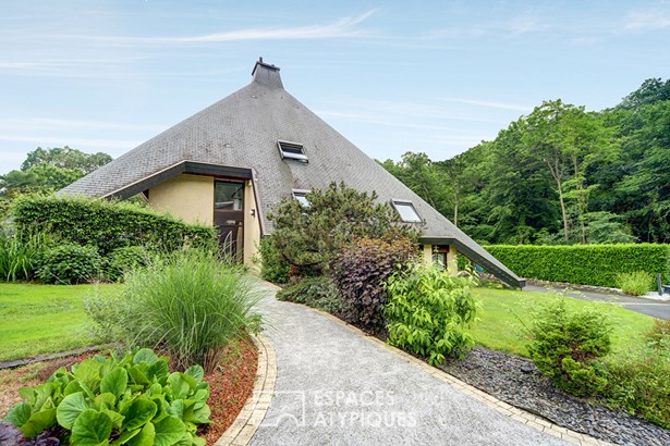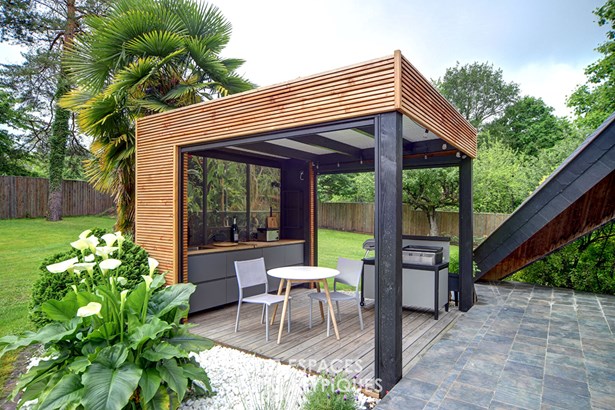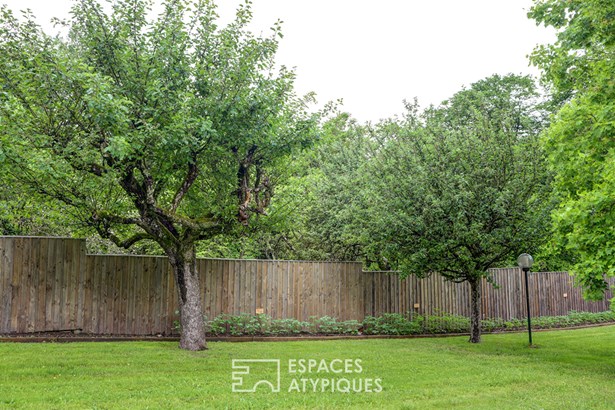 The carefully landscaped garden offers a summer kitchen sheltered by a pergola, a garden shed clad in wood and direct access to the forest.