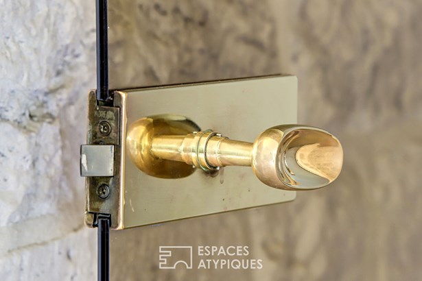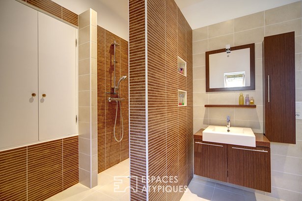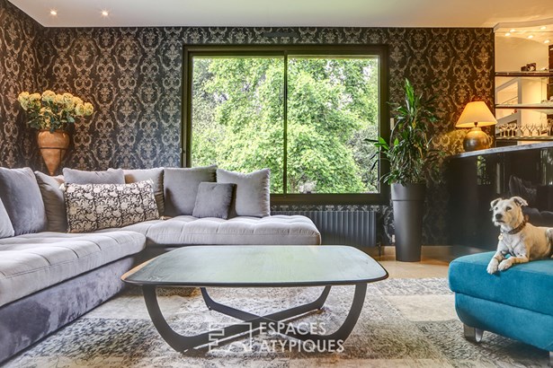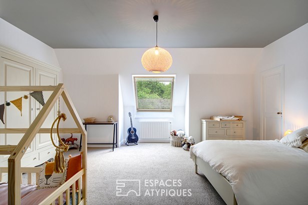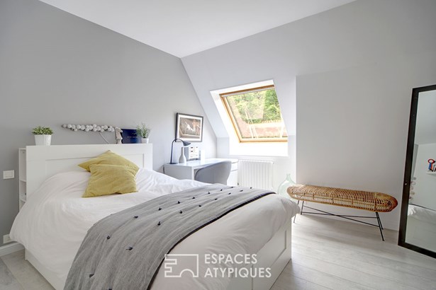 The separate dining room and living room benefit from abundant light thanks to large bay windows giving access to the single-storey stone terrace. Enhanced with a custom-created bar/library area, the living room, heated by a pellet stove, displays careful finishes in contemporary tones.