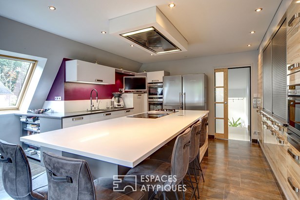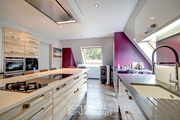 The separate dining kitchen offers a generous and warm space, thanks to its high-end equipment and the pellet stove inviting moments of conviviality around a modular central island.
