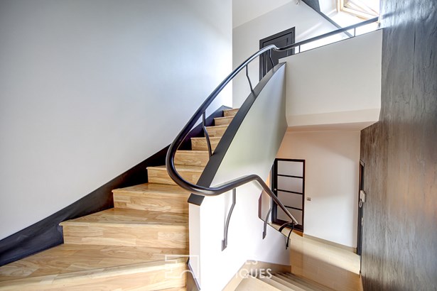 The entrance opens onto a spacious staircase bathed in light, leading to the living rooms and a master suite.