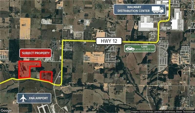 Land is located just north of Northwest Arkansas National Airport with Arkansas HWY 12 frontage in one of the fastest growing secondary markets in the country, making it ideal for an industrial-warehouse and distribution hub. Located only minutes southwest of Walmart distribution facilities and the city of Bentonville. Please see attached documents.