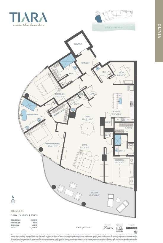 Open House November 1st 11:00AM-3:00PM. Now under construction! Welcome to the Olivia floorplan at Tiara on the Beach– This floorplan is located on the 4th floor and redefines the art of gracious living with a private elevator vestibule, lofty 10’ ceilings, and all Thermador appliances. Contemporary and sophisticated, Tiara on the Beach will be an architectural gem nestled along one of Galveston Island’s prime locations. This luxury residence will offer an amenity-rich lifestyle on Galveston Island. Features include spacious open floor plans and endless water views. Distinctive finishes such as Italian cabinetry and the highest levels of design and craftsmanship await you. Visit our one-of-a-kind sales gallery that includes a scaled model to showcase the architecture and amenities on 300ft of beachfront. Total square footage includes square footage of balcony. Completion scheduled for Summer of 2027.