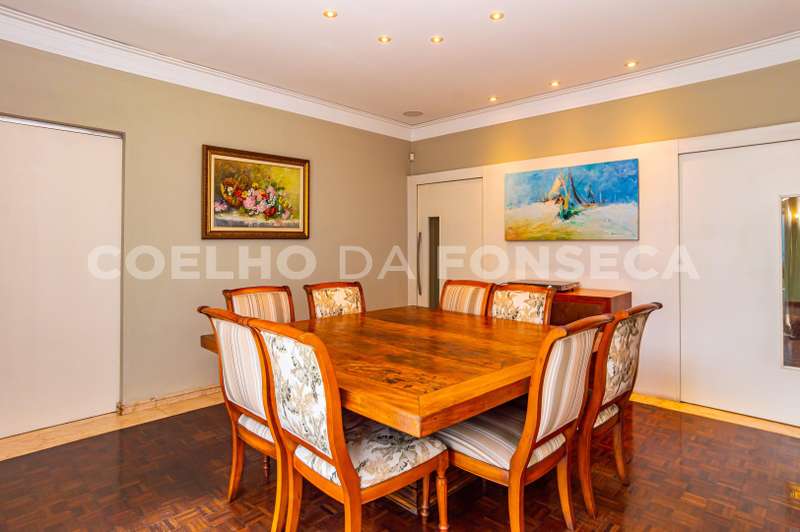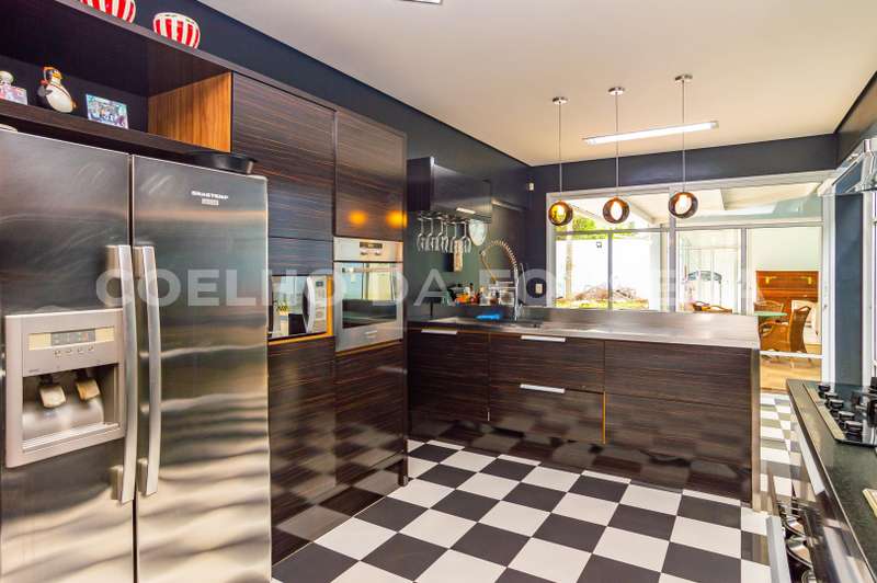 Ampla sala de jantar, cozinha integrada a área de lazer com churrasqueira e mesa de almoço coberta