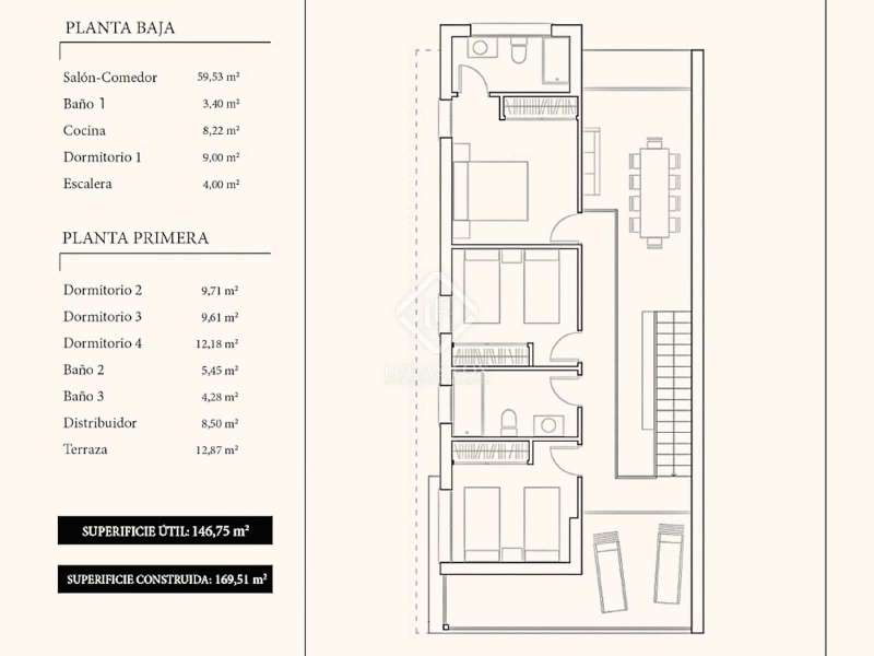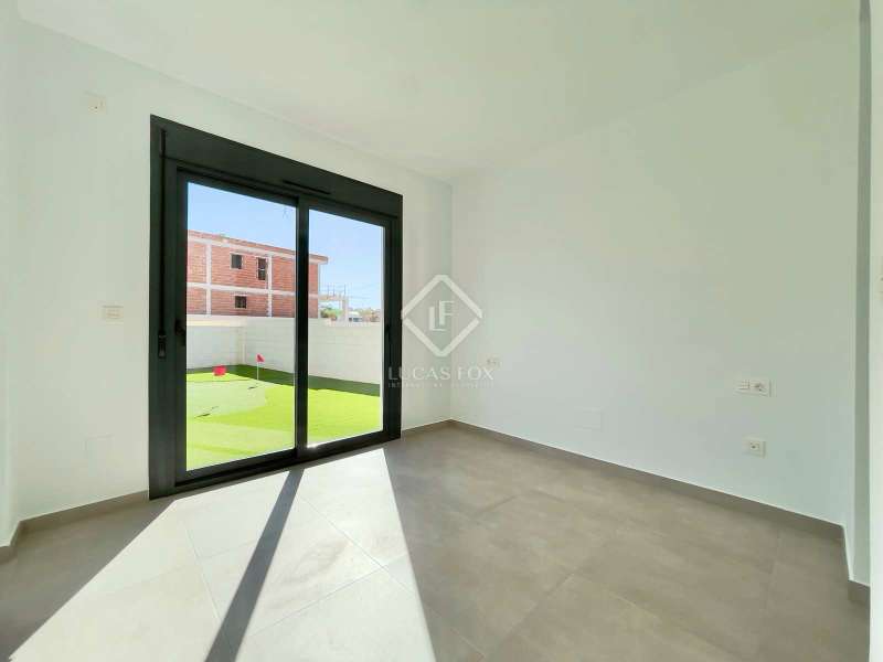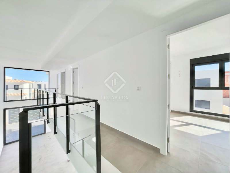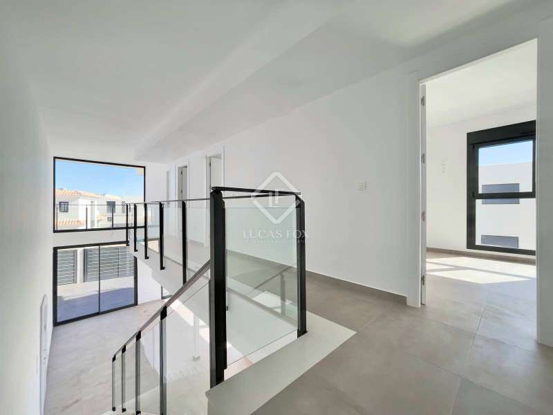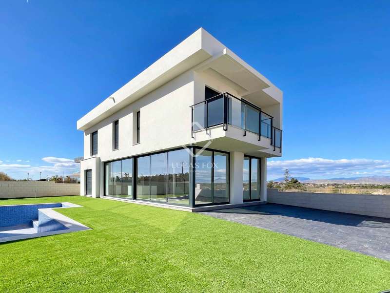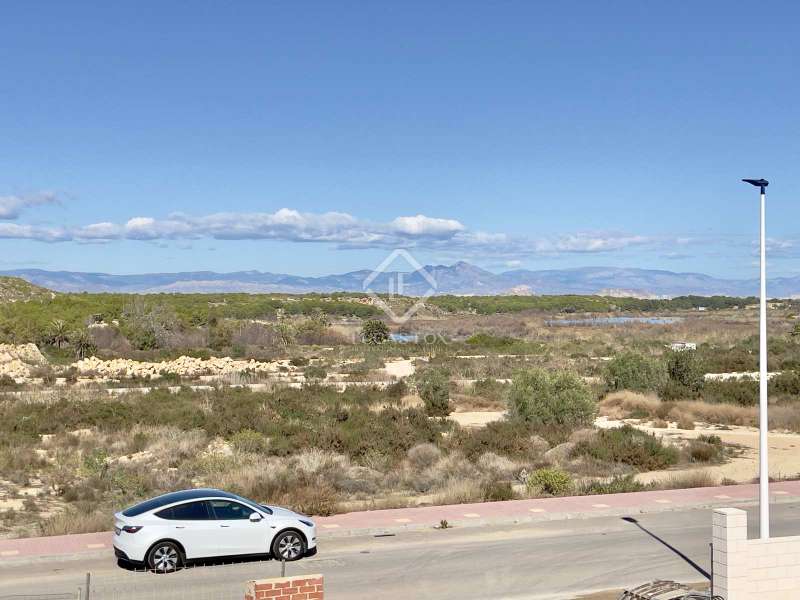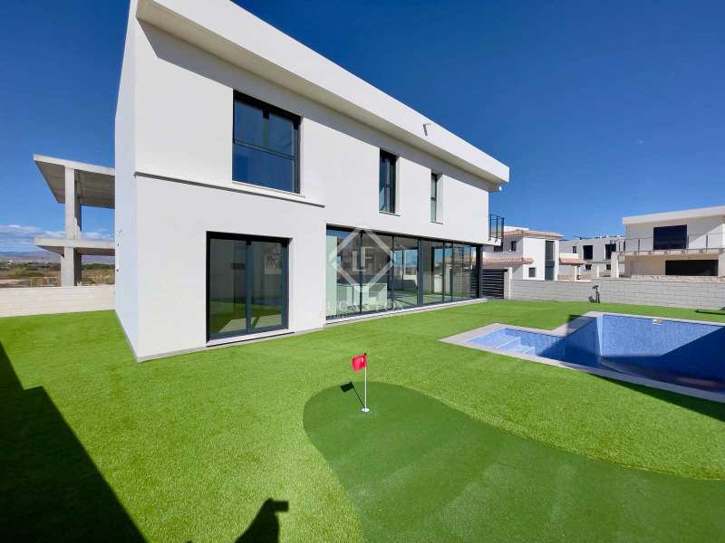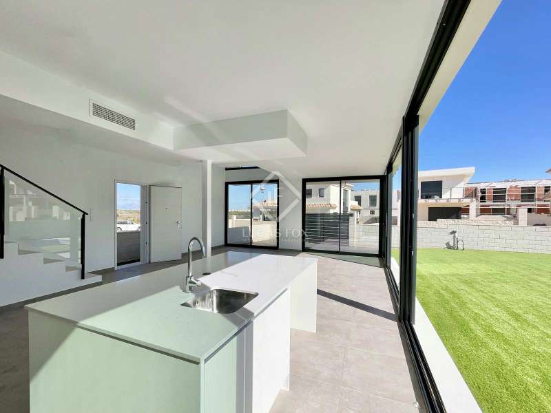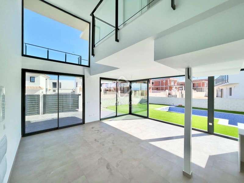 This modern premium villa is located in Gran Alacant, close to the beach and next to several shopping centers. It is also very close to the lively cities of Elche and Alicante and 10 minutes from the airport. The villa is ideal as a primary property or as a high-end second home. From the street, the design in white and gray tones is evident, with large windows covering much of the facade. The 320 m² plot offers plenty of space, including a terrace where you can spend time with friends or sunbathe, a large private pool, a garden area, and parking. Upon entering the house, we find an elegant, bright living-dining room measuring up to 65 m² and featuring a fully equipped open- hall kitchen. This floor also includes a bedroom, a large bathroom , and the staircase leading to the main floor . From there, the corridor leads to the master bedroom with a private bathroom, two more double bedrooms, a full bathroom with natural light, and the 13 m² terrace. Optionally, a basement with natural light, approximately 70 m2, can be added for an additional price of €40,000. This space can accommodate another separate living room, a work area, an extra guest room, etc. The house comes equipped with pre-installed hot and cold air conditioning in all interior spaces, full bathrooms, a furnished kitchen, well-kept exteriors, and a private 8 x 3 meter pool. Contact us to arrange a visit and for more information.
