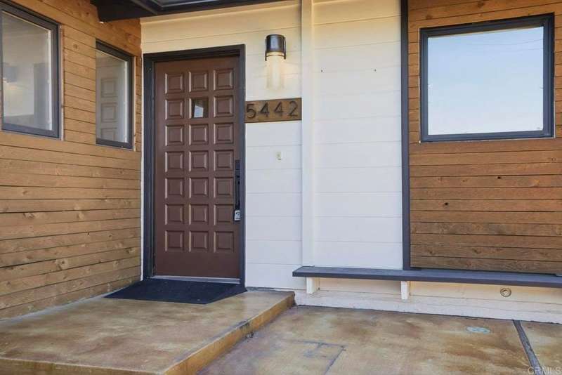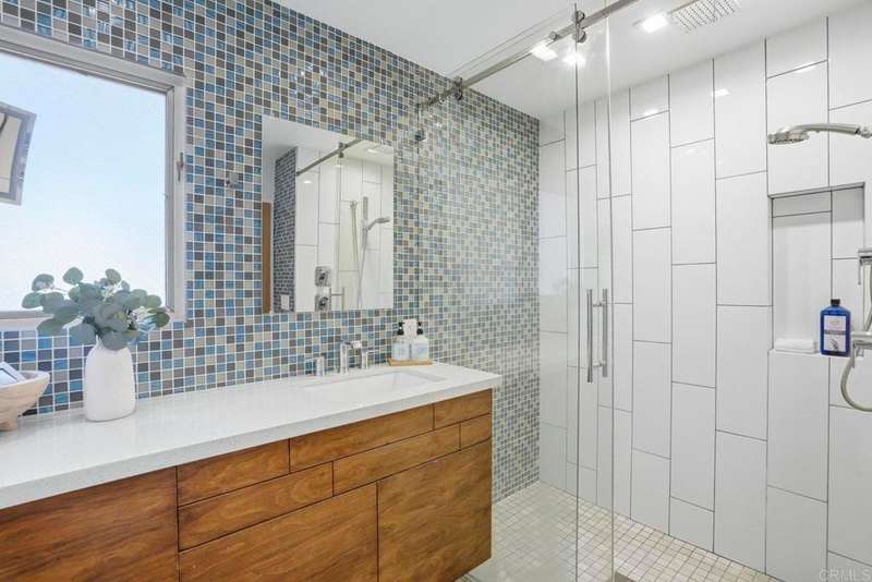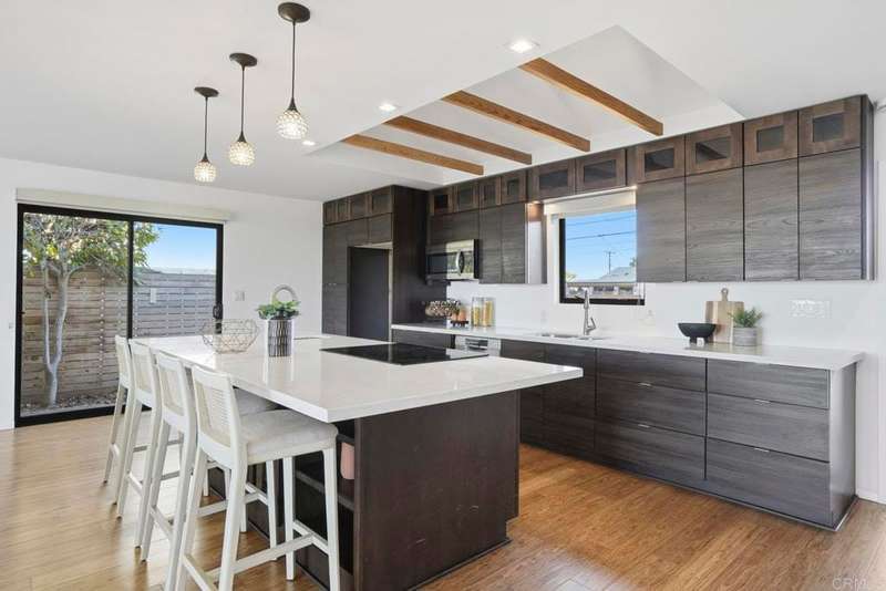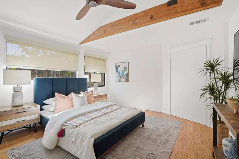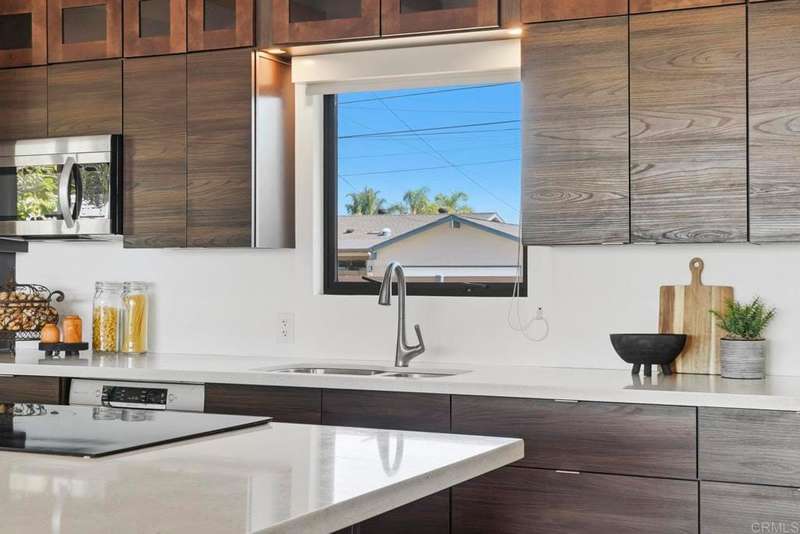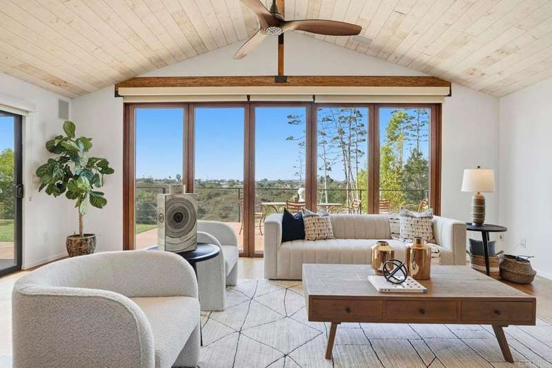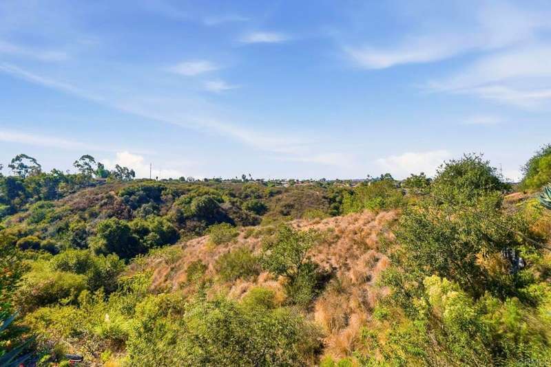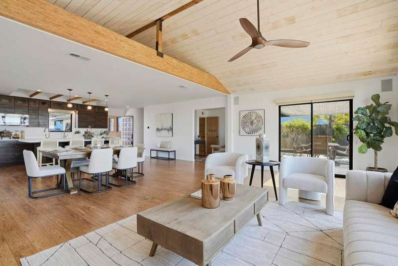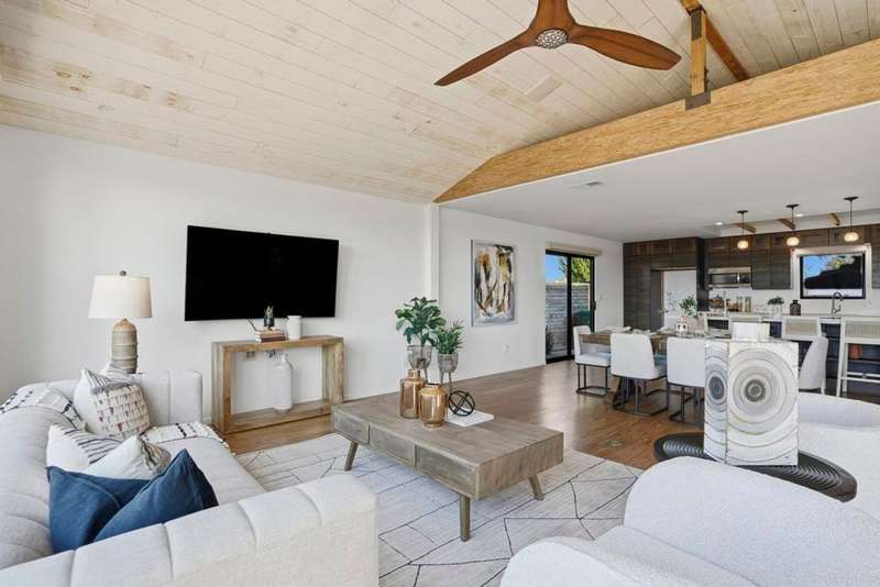 Experience stunning panoramic canyon and sunset views from both the back patio and living room of this North Clairemont canyon rim residence. Enter through the front door to an impressive open concept living room and kitchen that seamlessly connects to the backyard via a collapsible wall-to-wall folding door system. The property features convenient upgrades, including owned solar panels with Tesla Powerwall, tankless water heater, updated wiring and electric panel, engineered eucalyptus hardwood flooring, and a newer roof. The kitchen offers elegant dark wood cabinetry for ample storage, stainless steel appliances, quartz countertops, a spacious island with sink, and a breakfast bar. Exposed beams throughout the home add distinctive character to the living spaces. Additional enhancements include remodeled bathrooms and vaulted ceilings in the living room and primary bedroom.