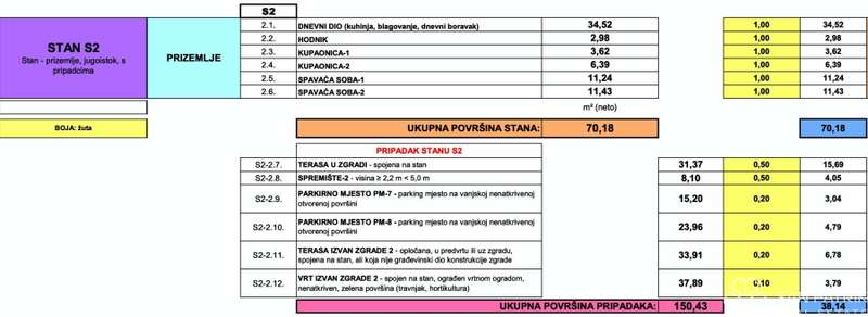 Apartment AS2 - Ground Floor - Living Area: 70.18 m2 (2 Bedrooms + 2 Bathrooms) + Terrace (31 m2 - SE) + Second Terrace (34 m2) + Storage Room (8 m2) + Garden (38 m2) + 2 Outdoor Parking Spaces (PM7 & PM8), Total Net Area: 108.32 m2 = €355,000