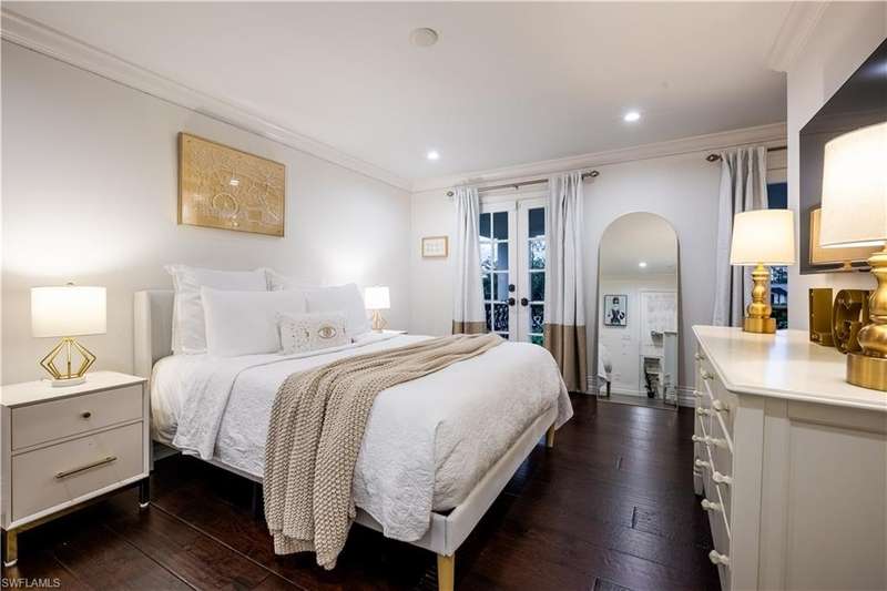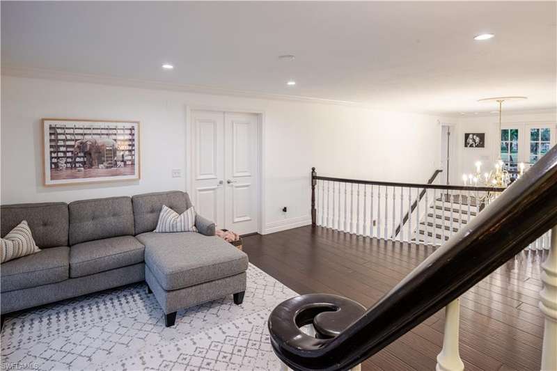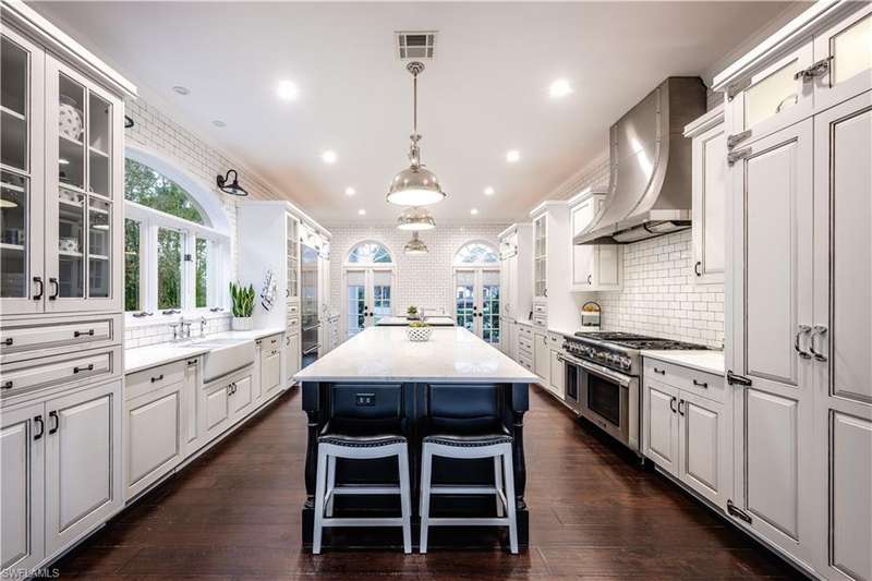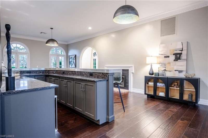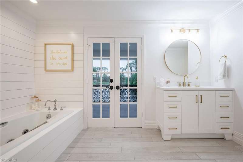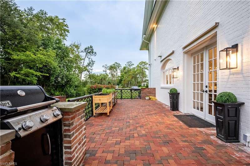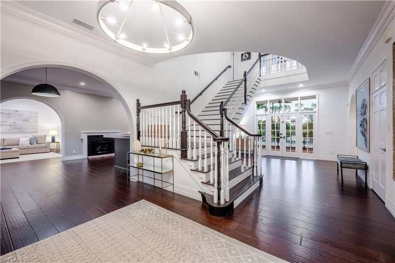 Welcome to an extraordinary residence...a masterfully renovated Classic House infused with modern elegance and Florida charm. Ideally positioned just minutes from the vibrant dining, shopping, and entertainment of North Naples, this home offers unrivaled convenience and sophistication. From its majestic facade, the expansive front porch and balcony provide seamless outdoor living space, matching the rear structures that overlook exquisite views of the pool, the lake, and a lush golf course. The interior boasts a sophisticated foyer with a dramatic staircase and mezzanine, setting the stage for effortless entertaining alongside an exquisitely decorated bar, a chic living room, and a luxurious yet welcoming dining room. Gourmet chefs will delight in the no-expense-spared kitchen flaunting high-end features such as B&B Custom Cabinetry, dual islands, a farm sink, White Carrara marble countertops, a Thermador range, Vent A Hood range hood, a Sub Zero integrated refrigerator, plus two under