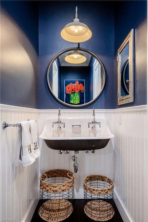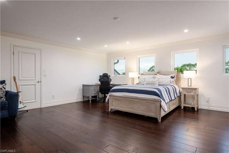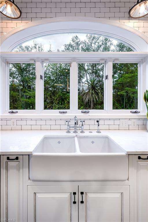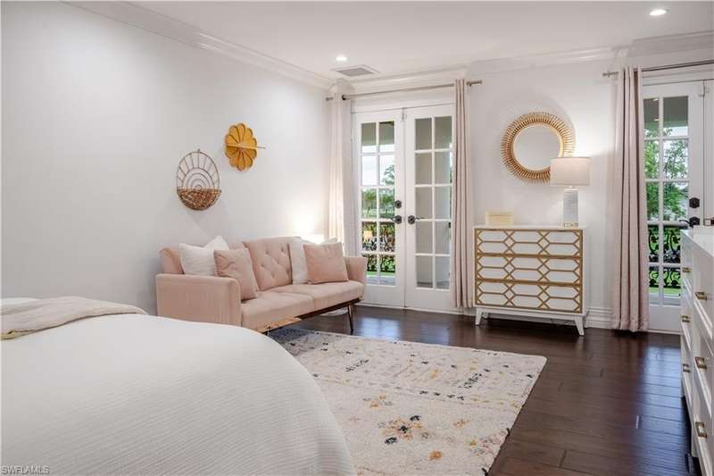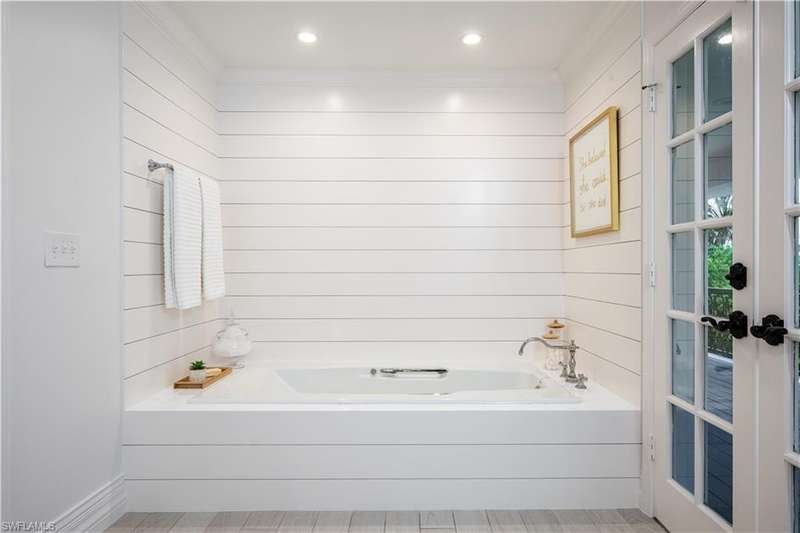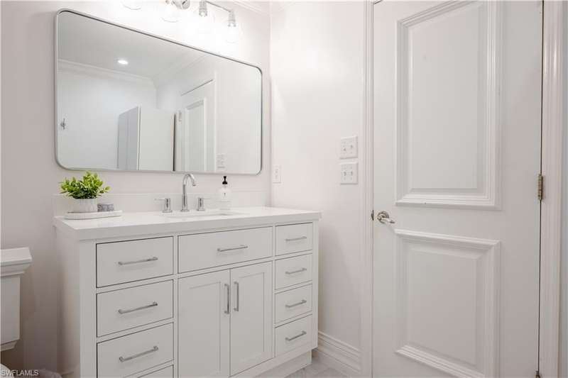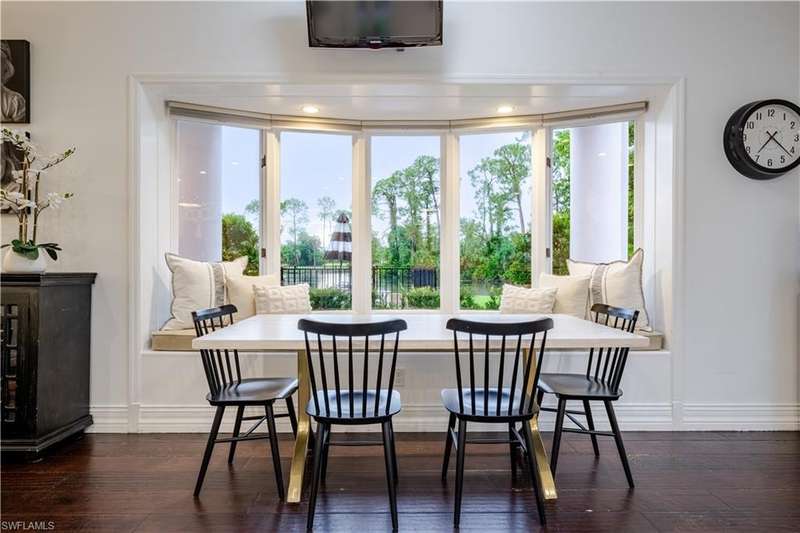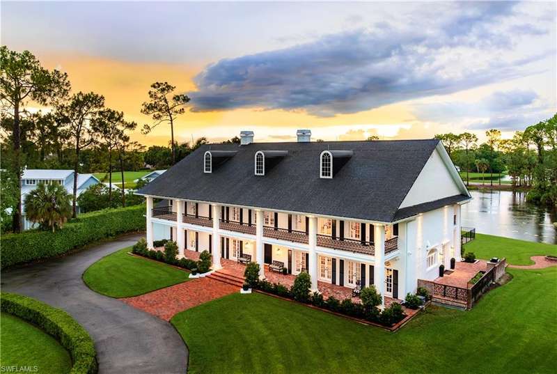 Welcome to an extraordinary residence...a masterfully renovated Classic House infused with modern elegance and Florida charm. Ideally positioned just minutes from the vibrant dining, shopping, and entertainment of North Naples, this home offers unrivaled convenience and sophistication. From its majestic facade, the expansive front porch and balcony provide seamless outdoor living space, matching the rear structures that overlook exquisite views of the pool, the lake, and a lush golf course. The interior boasts a sophisticated foyer with a dramatic staircase and mezzanine, setting the stage for effortless entertaining alongside an exquisitely decorated bar, a chic living room, and a luxurious yet welcoming dining room. Gourmet chefs will delight in the no-expense-spared kitchen flaunting high-end features such as B&B Custom Cabinetry, dual islands, a farm sink, White Carrara marble countertops, a Thermador range, Vent A Hood range hood, a Sub Zero integrated refrigerator, plus two under