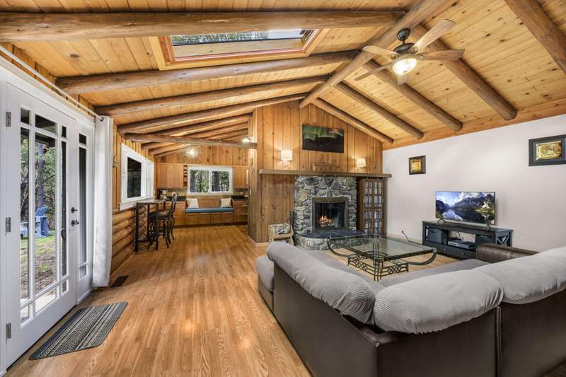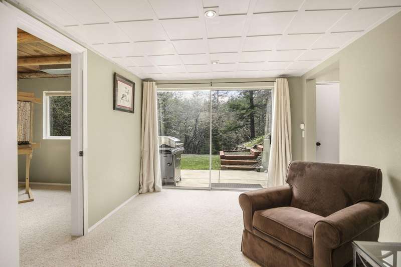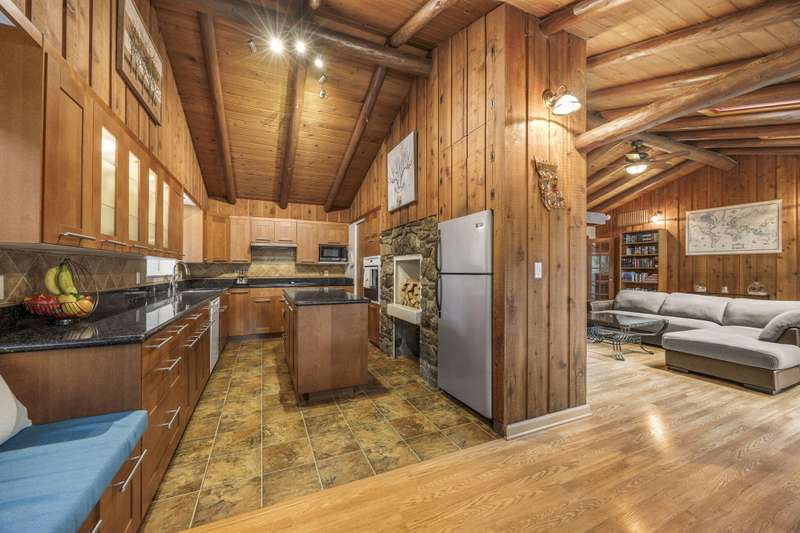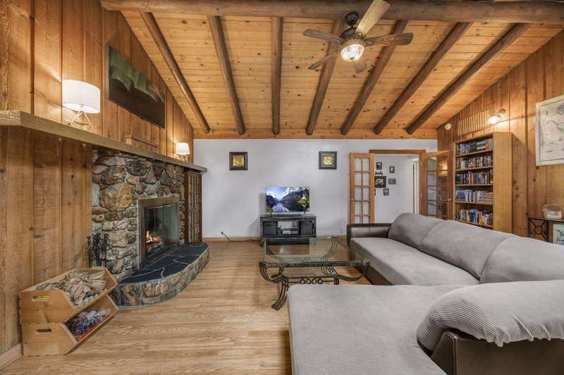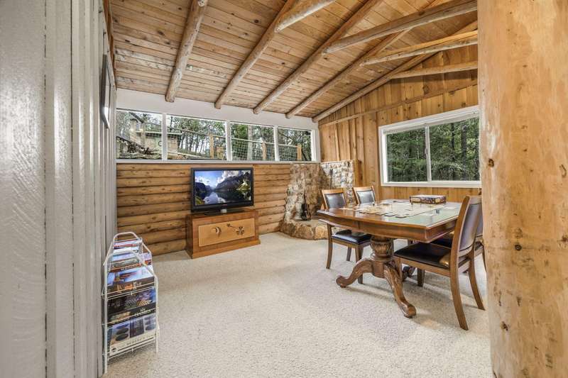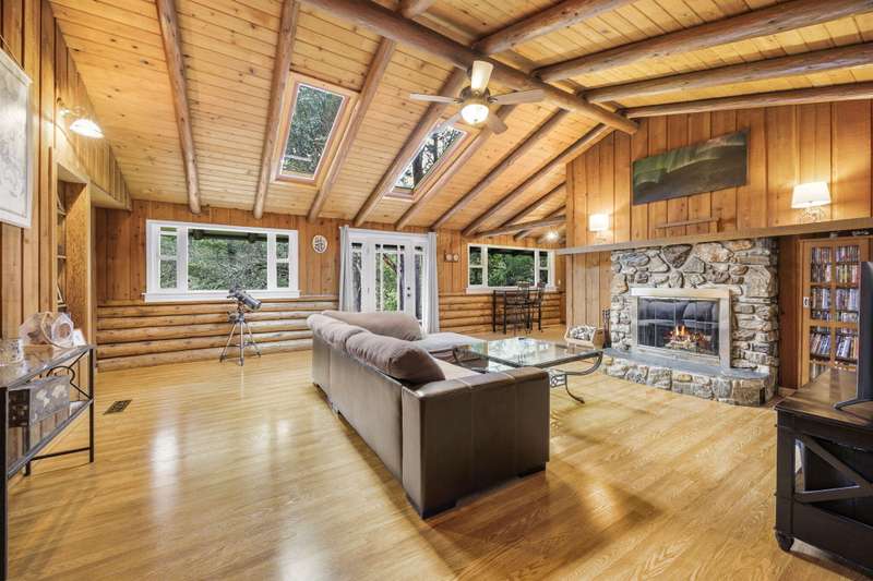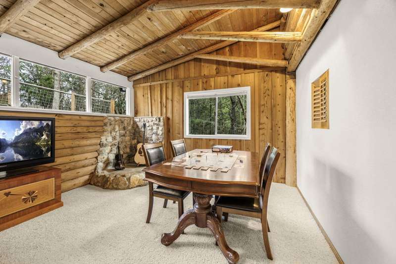 Welcome home! This inviting property sits on over 11 wooded acres, offering privacy with low maintenance. Just minutes from the sought-after town of Jacksonville, the location blends tranquility and convenience. Inside, enjoy a vaulted living room with exposed beams, wood-burning fireplace, and skylights that fill the space with natural light. The remodeled kitchen features granite counters, custom cabinetry, electric range, pantry, and built-in bench seating. Two bedrooms on the main level plus two more downstairs offer flexibility. The lower level includes a second living area and separate entrance—ideal for guests or multi-gen living. You'll love the warm mix of logs and wood accents throughout. A circular driveway and ample parking accommodate all your toys. Bonus: a charming brick detached storage building adds extra space. This home is a perfect blend of comfort, character, and convenience.