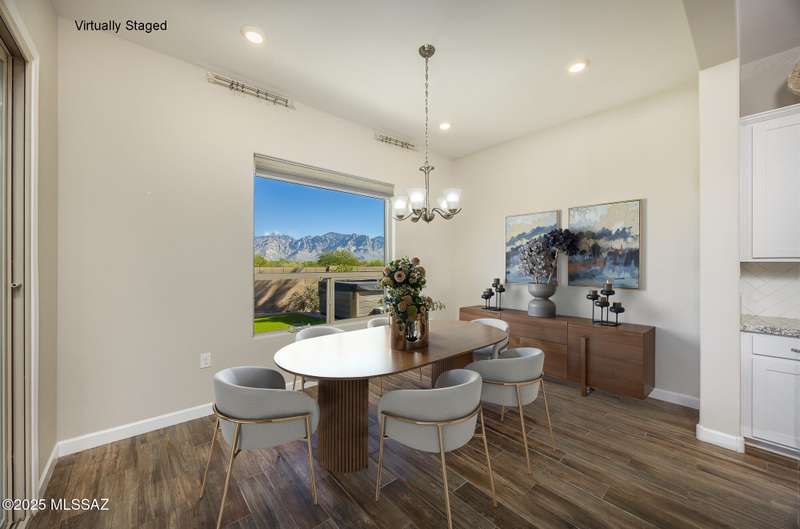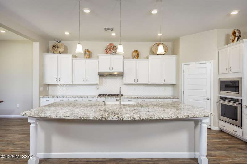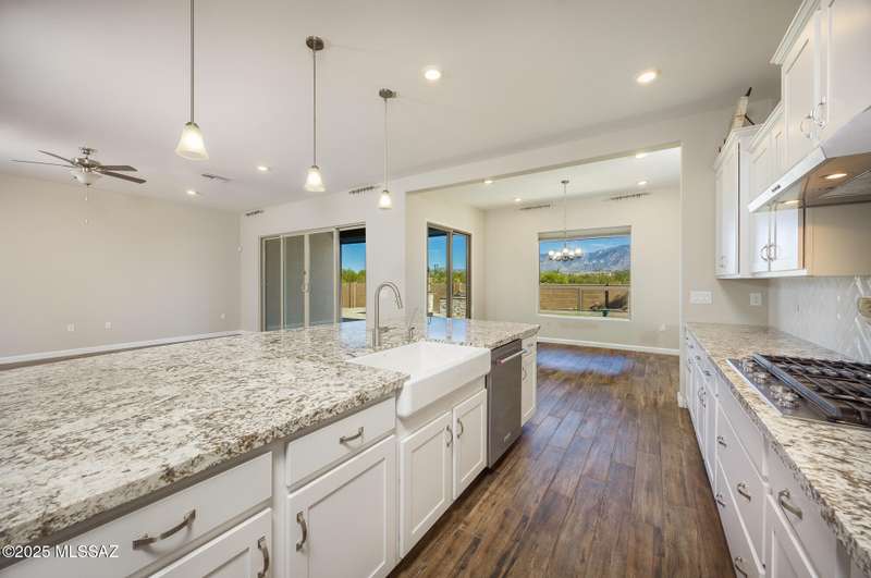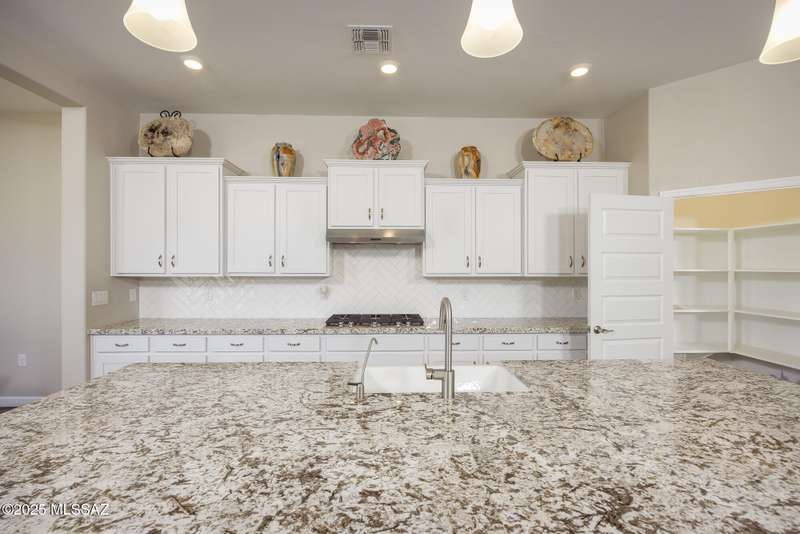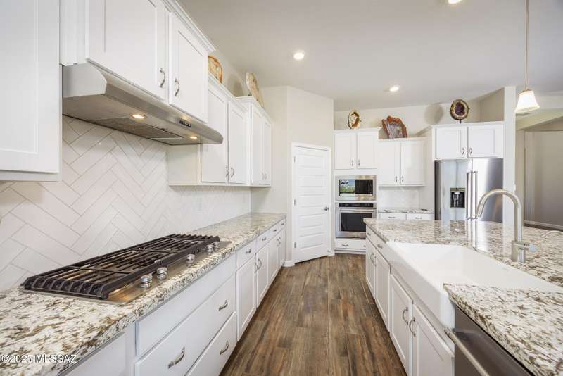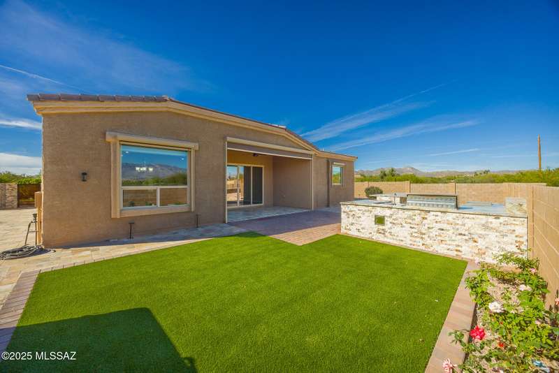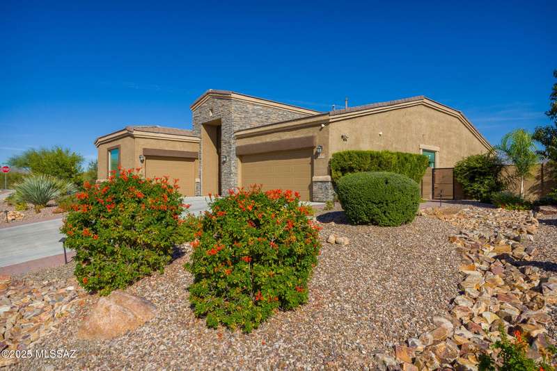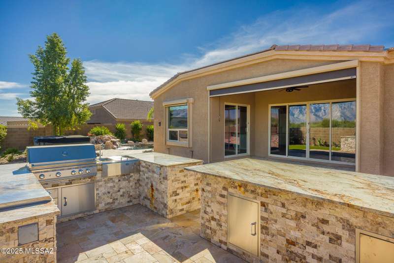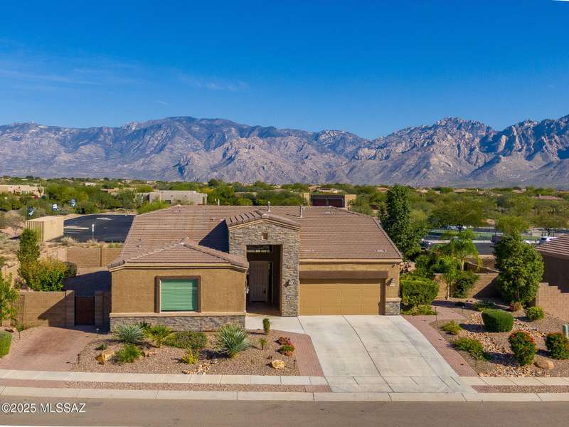Gorgeous D.R. Horton former model home w/ breathtaking views of Pusch Ridge! Beautifully designed 2,534 sq.ft home offers 4 BR 3 BA & flex room on a spacious .295 acre lot. A light-filled foyer opens to a spacious greatroom which flows to a covered patio w/double sliders. Enjoy 10 ft ceilings, custom paint & designer window coverings. The chef's kitchen features an oversized center island, gas cooktop, convection oven, farmhouse sink, granite c'tops,42'' cabinets, pendant lighting & walk-in pantry. The spacious primary suite boasts double-door entry, luxurious bath w/oversized shower & garden tub w/fabulous views.Rolling shutters in primary bath, dining area & patio. The resort-style backyard includes a heated pool w/water feature, lagoon, 3 swim-outs, outdoor kitchen w/BBQ. Spa.