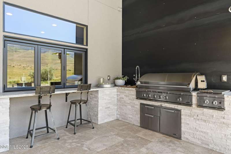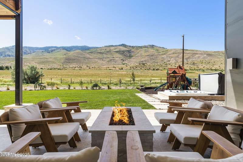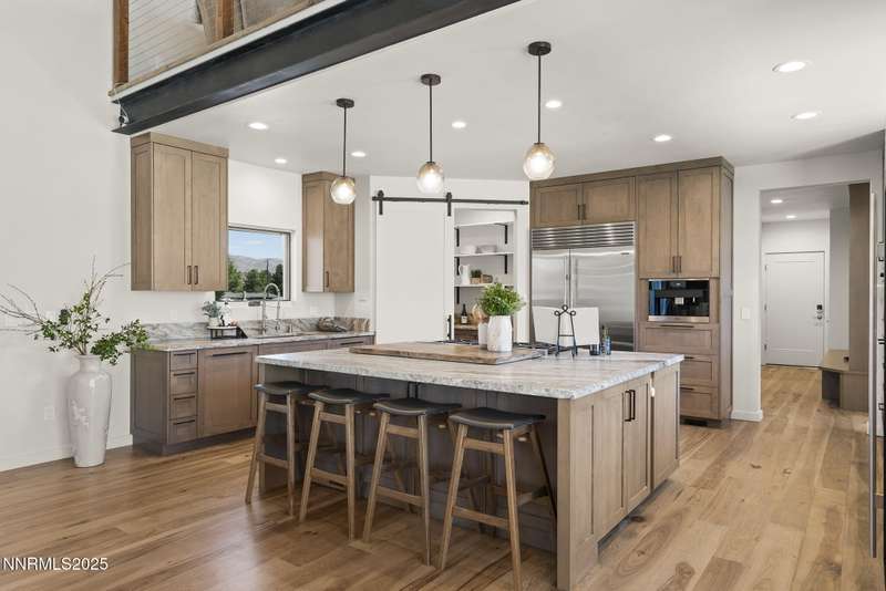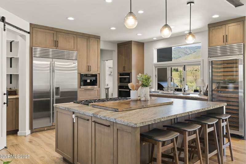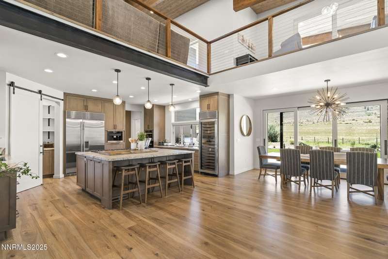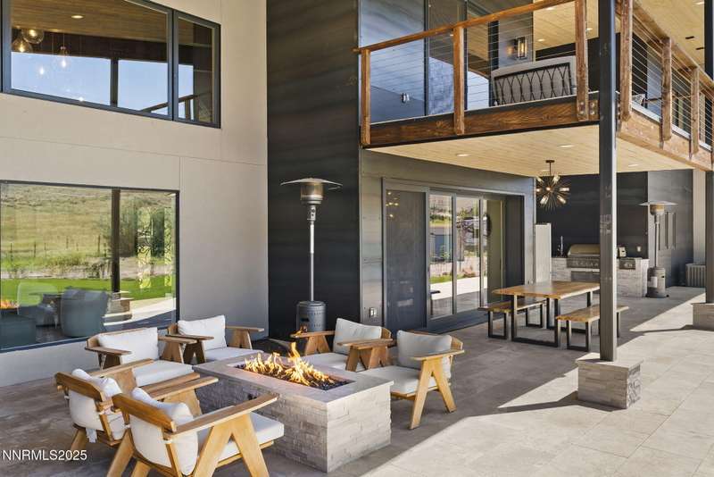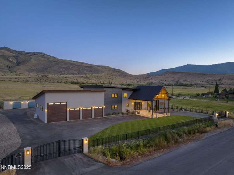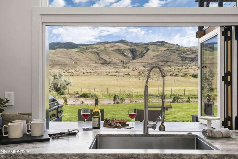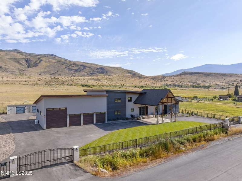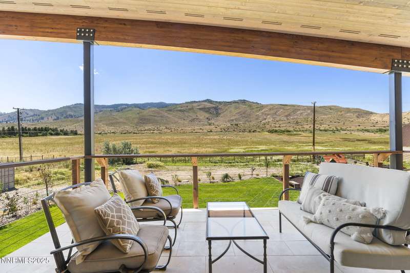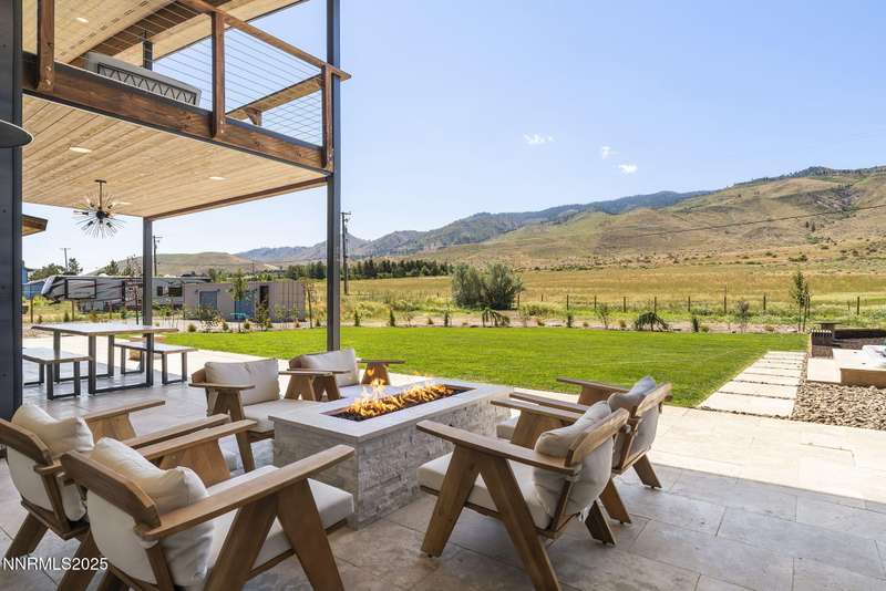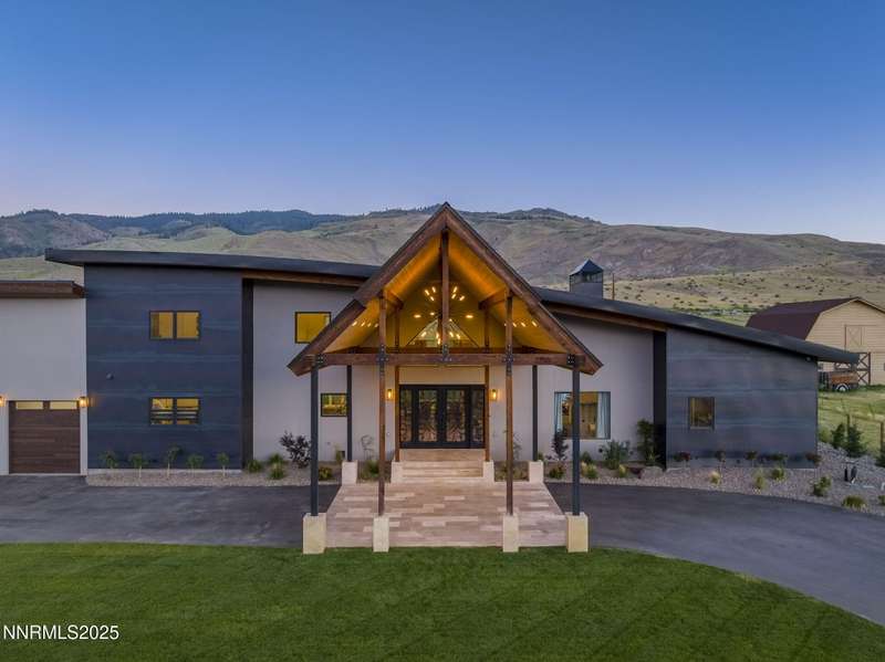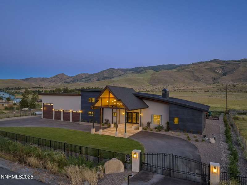 Set on nearly an acre, and less than ten miles from the California border and downtown Reno, 2255 Warrior Lane offers a rare blend of mountain modern architecture, self-sufficient infrastructure, and independence. This 5-bed/5.5-bath, 4,900+ sqft custom estate is a private, high-functioning retreat designed for those who think long-term and live on their terms. Here, there's no HOA—just panoramic views. Built in 2019 and crafted without compromise, the home merges industrial design cues with warm natural materials and layered craftsmanship. Hot-rolled steel and smooth stucco siding meet arched Glulam beams and 7" character-grade hickory floors. Soaring ceilings and oversized windows frame the land, offering sightlines to the Sierra Nevada. The great room anchors the home, with a 15-foot multi-panel lift-and-slide door that blurs the line between indoor comfort and outdoor connection. An oversized gas/wood fireplace clad in marble sits above a hidden basement, accessed through a mechanical bookcase with a 1200-lb magnetic lock. Below: a Dolby Atmos home theater with 3D projection, surround sound, and tiered leather power seating; a wet bar with kegerator; billiards lounge; half bath; and a 240-bottle wine and gun room hidden behind a steel-reinforced door. The layout is designed for separation without isolation—ideal for hosting or housing without giving up privacy. Every bedroom is wired for internet and cable, with ceiling fans and full baths for flexibility, guest comfort, or multi-generational living. Upstairs, a full loft-level living area includes two additional bedrooms, a dual-sink shared bath, a secondary lounge, and a built-in wet bar with access to a travertine cocktail balcony. On the main level are three private ensuite bedrooms, including a dedicated primary wing. The primary suite is a retreat in its own right, with dual walk-in closets and a spa bathroom featuring radiant-heated tile floors, a bidet, dual vanities, a dual steam shower, and a soaking tub. The kitchen is equipped with a built-in 48" Sub-Zero fridge, Sub-Zero wine tower, three Miele ovens (convection, steam, and speed), 8-burner range with retractable downdraft, dual Bosch dishwashers, a Miele coffee system with pull-out shelf, and a pantry with appliance garage and pull-out organizers. A massive full-slab island of chiseled-edge fantasy brown marble offers seating, prep space, and a visual focal point. A folding pass-through window opens to the outdoor kitchen with a DCS rotisserie grill, marble-topped prep station, and full outdoor setup with sink and storage. Outside, 1,700 sqft of covered Turkish travertine terraces connect beautifully landscaped lawns, an 8-person hot tub, and a large commercial-grade play structure. There's ample room for horses or chickens, and wildlife sightings that include hawks, deer, coyotes, the occasional bear, and yes—even a black-footed ferret. The 1,932 sqft pass-through garage includes five bays, a 41-foot RV stall with hookups, and 14-foot doors. A separate 320 sqft finished container workshop offers dual roll-up doors, commercial cabinets, and rubber flooring for clean, secure work or storage space. There's also a built-in ice melt system, smart garage doors, a hot/cold car washing faucet, and 50-amp/30-amp outlets ready for tools, toys, or trades. Designed for resilience as much as beauty, the home includes a 22KW Generac backup generator, 5-zone HVAC with smart thermostats, engineered septic, 300-amp service, triple-filtered well water with carbon and UV purification, recirculating hot water, three sump pumps, central vacuum, integrated smoke and CO detectors, and wired security cameras throughout. Sierra Pacific windows and doors, tight-taped drywall, and spray foam insulation keep the home peaceful, efficient, and grounded in function. This custom estate is a rare convergence of craftsmanship, privacy, and possibility. If you're done compromising—on space, quality, or how you want to live—Warrior is for you.