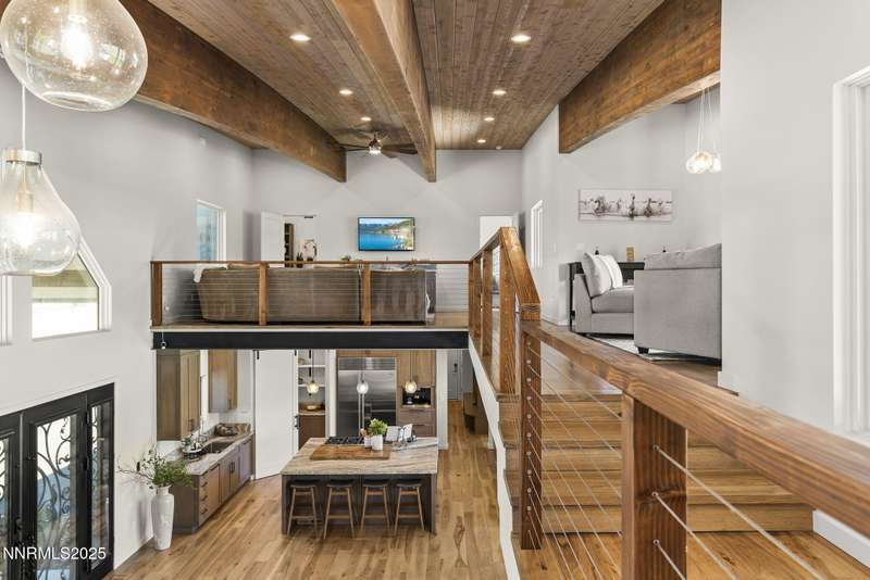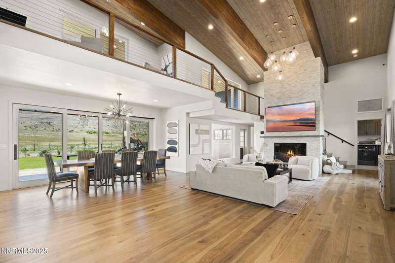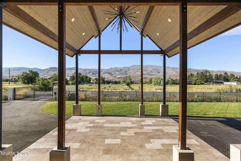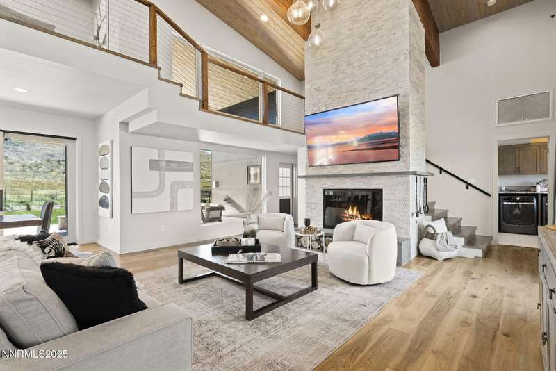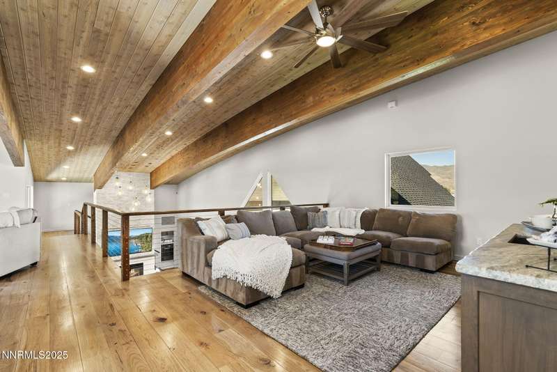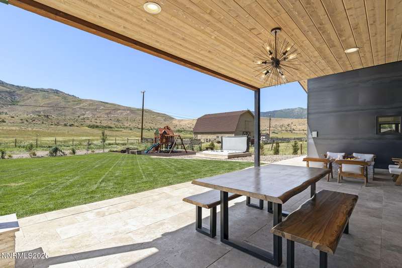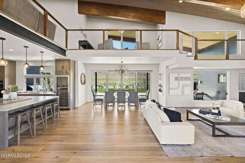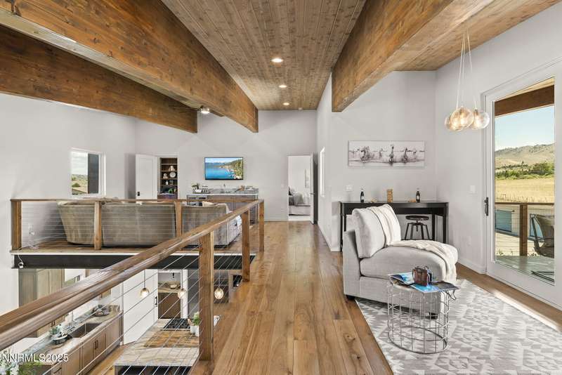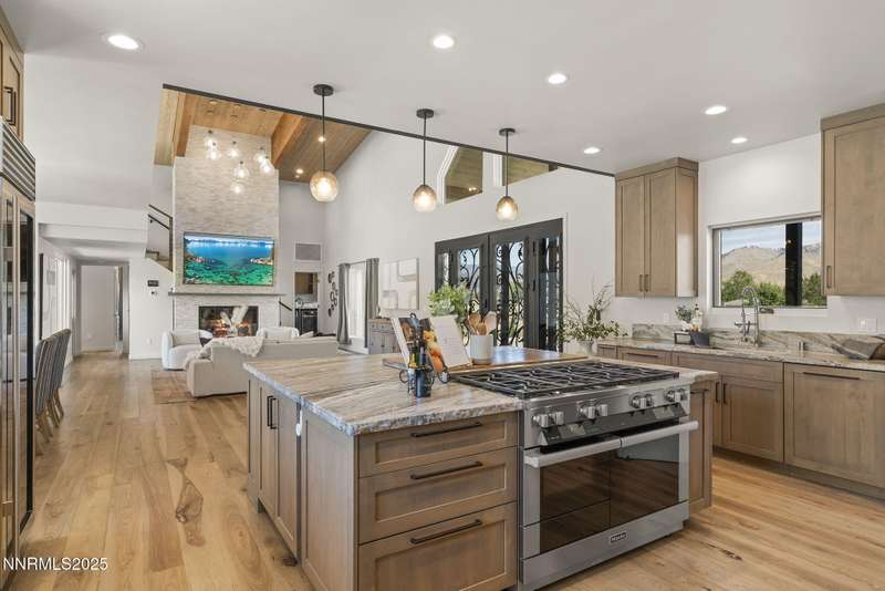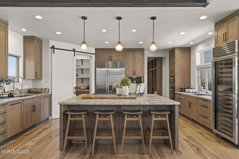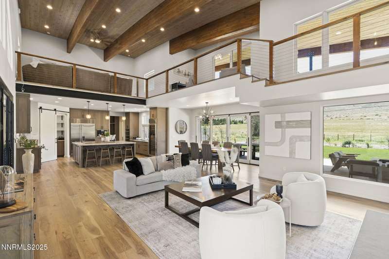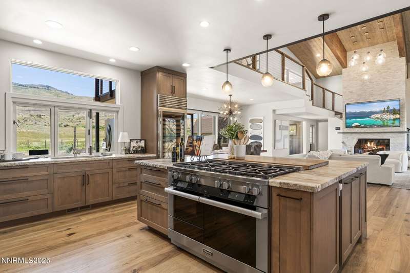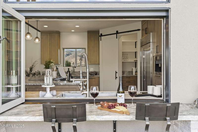 Set on nearly an acre, and less than ten miles from the California border and downtown Reno, 2255 Warrior Lane offers a rare blend of mountain modern architecture, self-sufficient infrastructure, and independence. This 5-bed/5.5-bath, 4,900+ sqft custom estate is a private, high-functioning retreat designed for those who think long-term and live on their terms. Here, there's no HOA—just panoramic views. Built in 2019 and crafted without compromise, the home merges industrial design cues with warm natural materials and layered craftsmanship. Hot-rolled steel and smooth stucco siding meet arched Glulam beams and 7" character-grade hickory floors. Soaring ceilings and oversized windows frame the land, offering sightlines to the Sierra Nevada. The great room anchors the home, with a 15-foot multi-panel lift-and-slide door that blurs the line between indoor comfort and outdoor connection. An oversized gas/wood fireplace clad in marble sits above a hidden basement, accessed through a mechanical bookcase with a 1200-lb magnetic lock. Below: a Dolby Atmos home theater with 3D projection, surround sound, and tiered leather power seating; a wet bar with kegerator; billiards lounge; half bath; and a 240-bottle wine and gun room hidden behind a steel-reinforced door. The layout is designed for separation without isolation—ideal for hosting or housing without giving up privacy. Every bedroom is wired for internet and cable, with ceiling fans and full baths for flexibility, guest comfort, or multi-generational living. Upstairs, a full loft-level living area includes two additional bedrooms, a dual-sink shared bath, a secondary lounge, and a built-in wet bar with access to a travertine cocktail balcony. On the main level are three private ensuite bedrooms, including a dedicated primary wing. The primary suite is a retreat in its own right, with dual walk-in closets and a spa bathroom featuring radiant-heated tile floors, a bidet, dual vanities, a dual steam shower, and a soaking tub. The kitchen is equipped with a built-in 48" Sub-Zero fridge, Sub-Zero wine tower, three Miele ovens (convection, steam, and speed), 8-burner range with retractable downdraft, dual Bosch dishwashers, a Miele coffee system with pull-out shelf, and a pantry with appliance garage and pull-out organizers. A massive full-slab island of chiseled-edge fantasy brown marble offers seating, prep space, and a visual focal point. A folding pass-through window opens to the outdoor kitchen with a DCS rotisserie grill, marble-topped prep station, and full outdoor setup with sink and storage. Outside, 1,700 sqft of covered Turkish travertine terraces connect beautifully landscaped lawns, an 8-person hot tub, and a large commercial-grade play structure. There's ample room for horses or chickens, and wildlife sightings that include hawks, deer, coyotes, the occasional bear, and yes—even a black-footed ferret. The 1,932 sqft pass-through garage includes five bays, a 41-foot RV stall with hookups, and 14-foot doors. A separate 320 sqft finished container workshop offers dual roll-up doors, commercial cabinets, and rubber flooring for clean, secure work or storage space. There's also a built-in ice melt system, smart garage doors, a hot/cold car washing faucet, and 50-amp/30-amp outlets ready for tools, toys, or trades. Designed for resilience as much as beauty, the home includes a 22KW Generac backup generator, 5-zone HVAC with smart thermostats, engineered septic, 300-amp service, triple-filtered well water with carbon and UV purification, recirculating hot water, three sump pumps, central vacuum, integrated smoke and CO detectors, and wired security cameras throughout. Sierra Pacific windows and doors, tight-taped drywall, and spray foam insulation keep the home peaceful, efficient, and grounded in function. This custom estate is a rare convergence of craftsmanship, privacy, and possibility. If you're done compromising—on space, quality, or how you want to live—Warrior is for you.