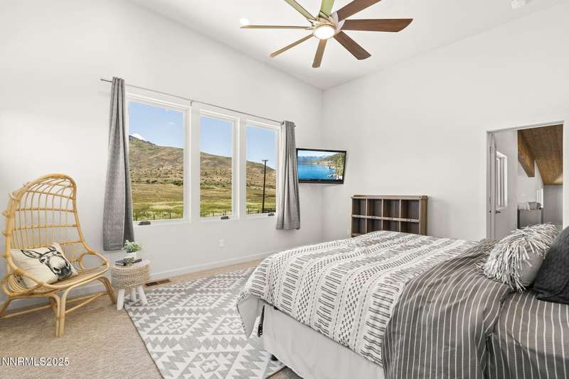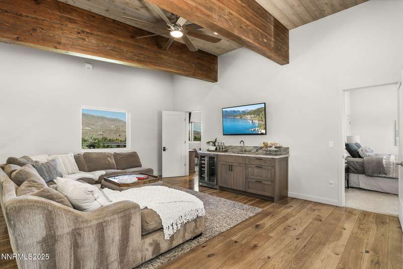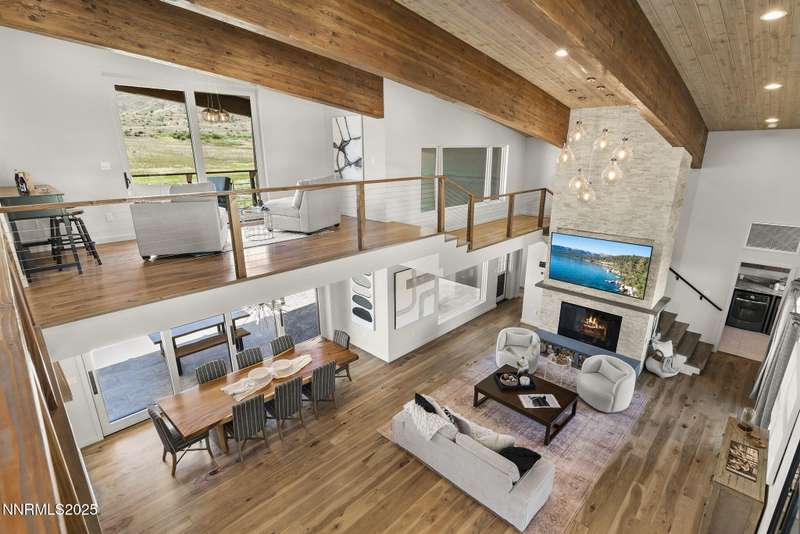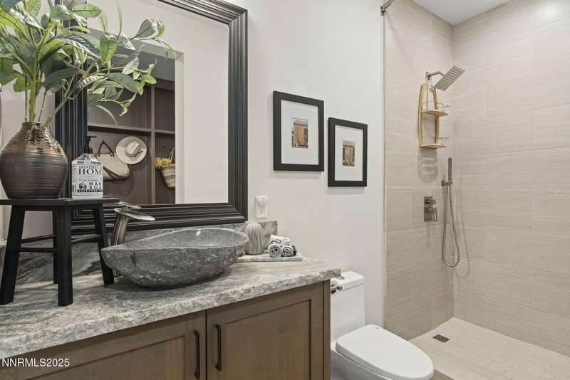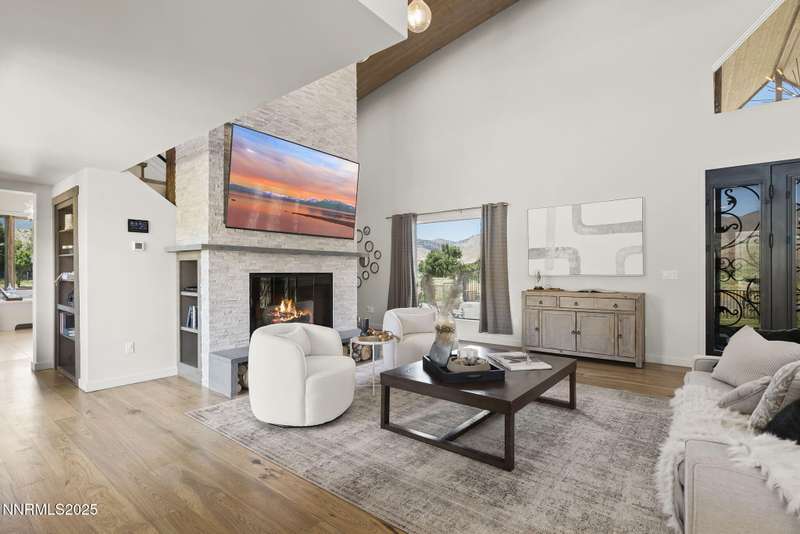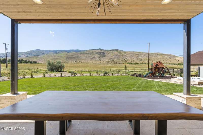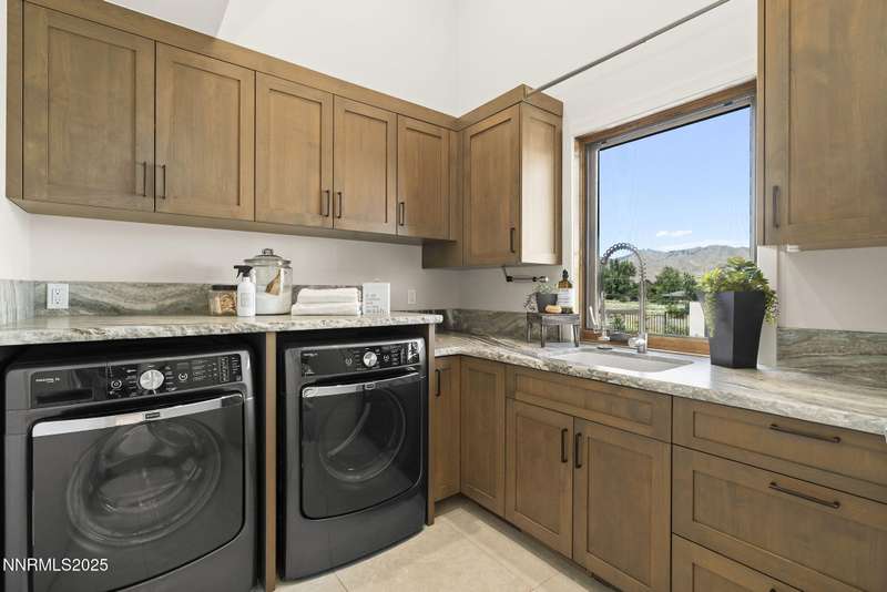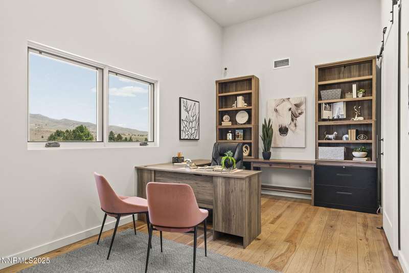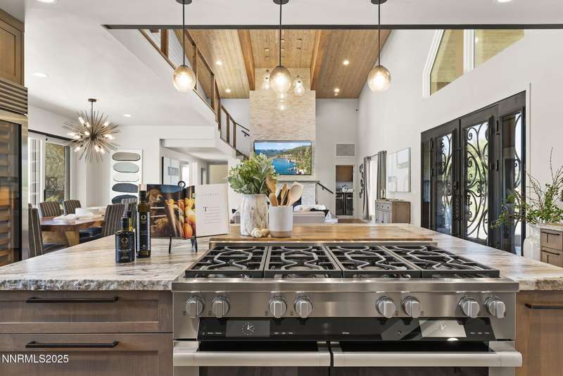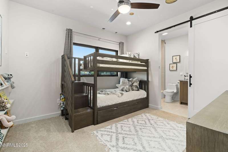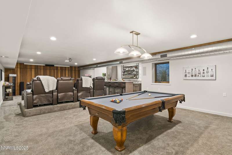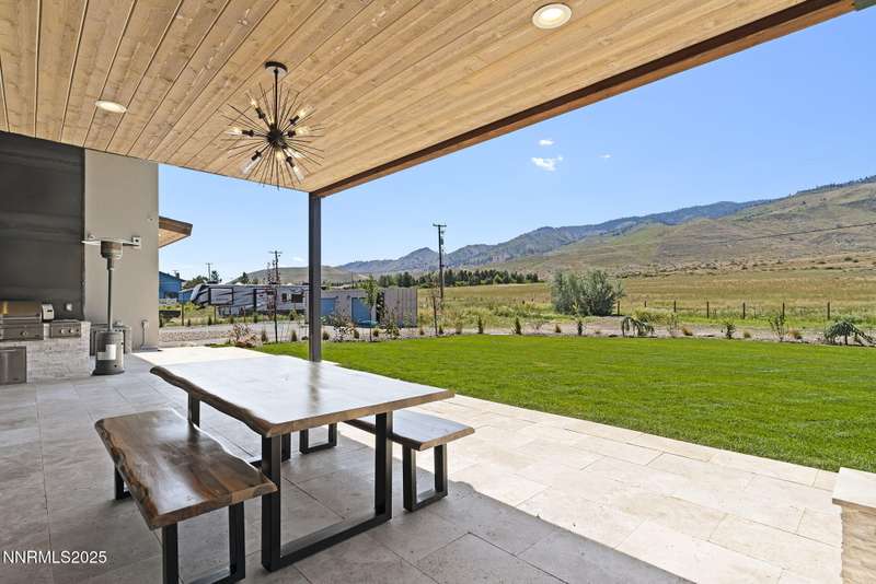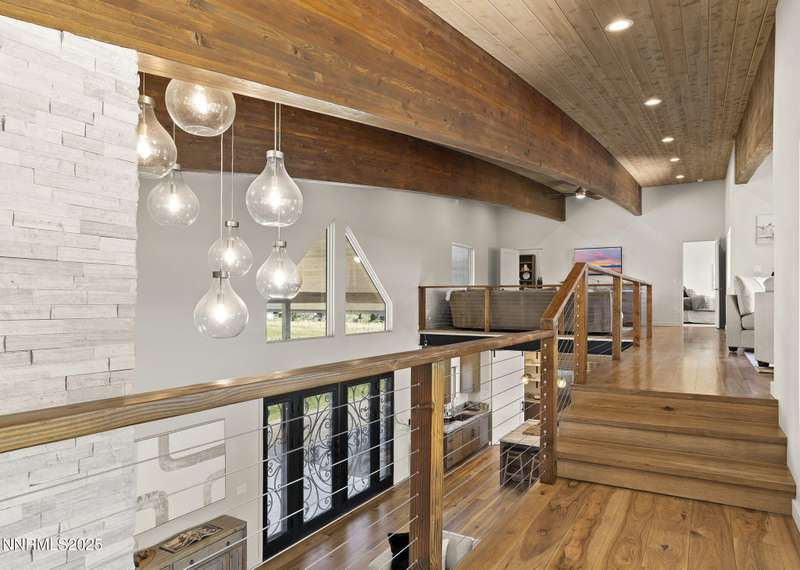 Set on nearly an acre, and less than ten miles from the California border and downtown Reno, 2255 Warrior Lane offers a rare blend of mountain modern architecture, self-sufficient infrastructure, and independence. This 5-bed/5.5-bath, 4,900+ sqft custom estate is a private, high-functioning retreat designed for those who think long-term and live on their terms. Here, there's no HOA—just panoramic views. Built in 2019 and crafted without compromise, the home merges industrial design cues with warm natural materials and layered craftsmanship. Hot-rolled steel and smooth stucco siding meet arched Glulam beams and 7" character-grade hickory floors. Soaring ceilings and oversized windows frame the land, offering sightlines to the Sierra Nevada. The great room anchors the home, with a 15-foot multi-panel lift-and-slide door that blurs the line between indoor comfort and outdoor connection. An oversized gas/wood fireplace clad in marble sits above a hidden basement, accessed through a mechanical bookcase with a 1200-lb magnetic lock. Below: a Dolby Atmos home theater with 3D projection, surround sound, and tiered leather power seating; a wet bar with kegerator; billiards lounge; half bath; and a 240-bottle wine and gun room hidden behind a steel-reinforced door. The layout is designed for separation without isolation—ideal for hosting or housing without giving up privacy. Every bedroom is wired for internet and cable, with ceiling fans and full baths for flexibility, guest comfort, or multi-generational living. Upstairs, a full loft-level living area includes two additional bedrooms, a dual-sink shared bath, a secondary lounge, and a built-in wet bar with access to a travertine cocktail balcony. On the main level are three private ensuite bedrooms, including a dedicated primary wing. The primary suite is a retreat in its own right, with dual walk-in closets and a spa bathroom featuring radiant-heated tile floors, a bidet, dual vanities, a dual steam shower, and a soaking tub. The kitchen is equipped with a built-in 48" Sub-Zero fridge, Sub-Zero wine tower, three Miele ovens (convection, steam, and speed), 8-burner range with retractable downdraft, dual Bosch dishwashers, a Miele coffee system with pull-out shelf, and a pantry with appliance garage and pull-out organizers. A massive full-slab island of chiseled-edge fantasy brown marble offers seating, prep space, and a visual focal point. A folding pass-through window opens to the outdoor kitchen with a DCS rotisserie grill, marble-topped prep station, and full outdoor setup with sink and storage. Outside, 1,700 sqft of covered Turkish travertine terraces connect beautifully landscaped lawns, an 8-person hot tub, and a large commercial-grade play structure. There's ample room for horses or chickens, and wildlife sightings that include hawks, deer, coyotes, the occasional bear, and yes—even a black-footed ferret. The 1,932 sqft pass-through garage includes five bays, a 41-foot RV stall with hookups, and 14-foot doors. A separate 320 sqft finished container workshop offers dual roll-up doors, commercial cabinets, and rubber flooring for clean, secure work or storage space. There's also a built-in ice melt system, smart garage doors, a hot/cold car washing faucet, and 50-amp/30-amp outlets ready for tools, toys, or trades. Designed for resilience as much as beauty, the home includes a 22KW Generac backup generator, 5-zone HVAC with smart thermostats, engineered septic, 300-amp service, triple-filtered well water with carbon and UV purification, recirculating hot water, three sump pumps, central vacuum, integrated smoke and CO detectors, and wired security cameras throughout. Sierra Pacific windows and doors, tight-taped drywall, and spray foam insulation keep the home peaceful, efficient, and grounded in function. This custom estate is a rare convergence of craftsmanship, privacy, and possibility. If you're done compromising—on space, quality, or how you want to live—Warrior is for you.