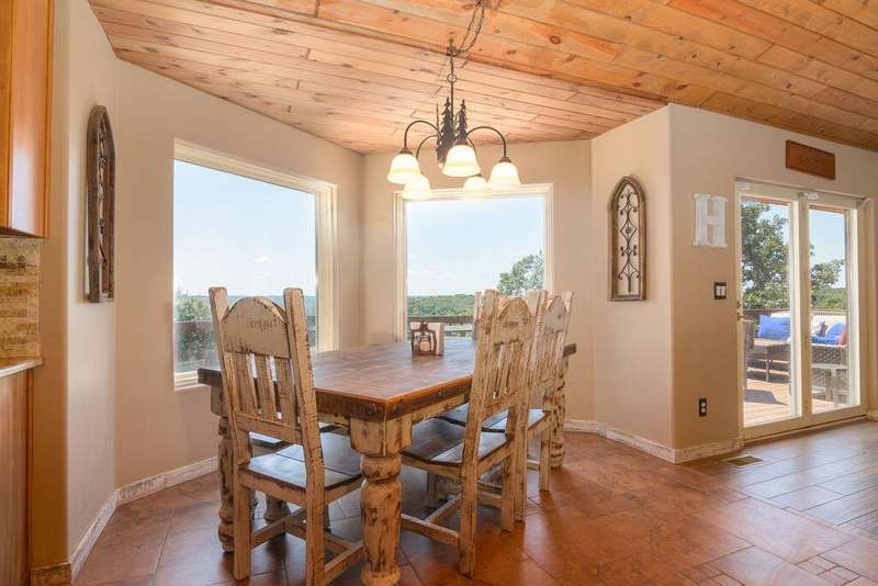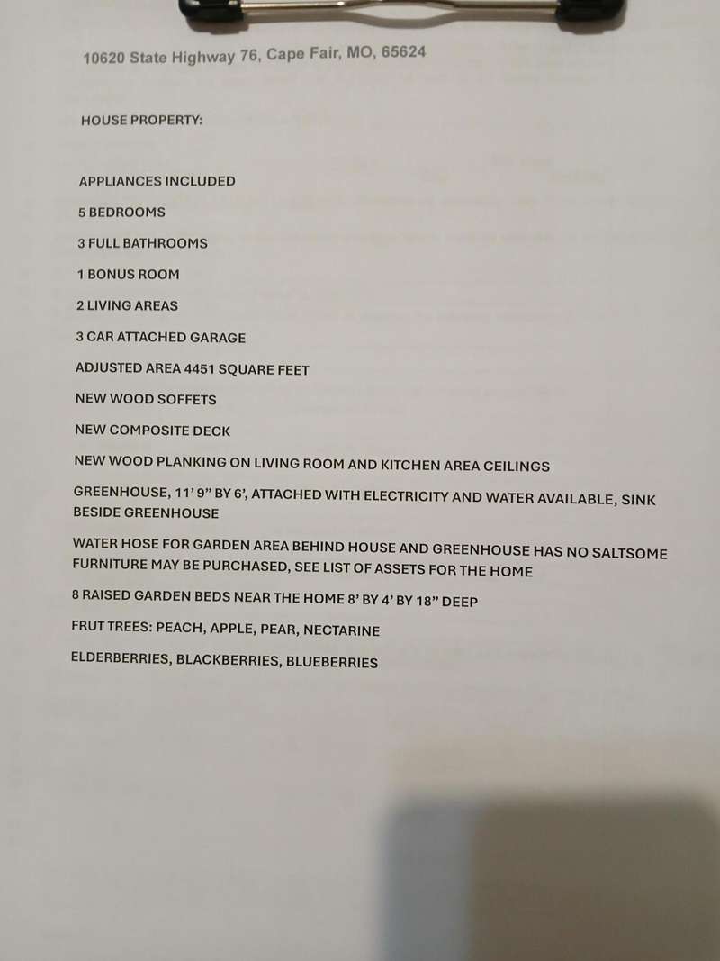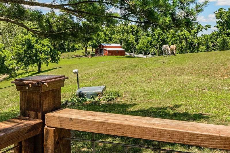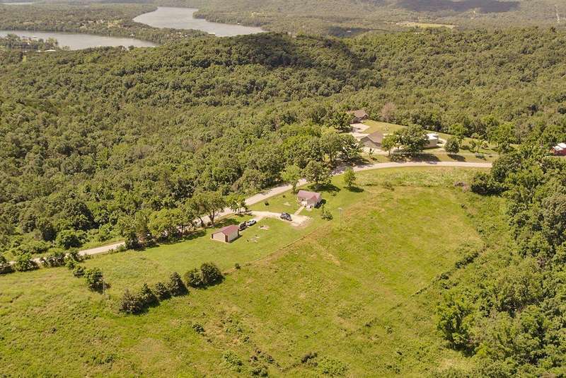 Gorgeous Table Rock View from this beautifully renovated home that is only about 5 minutes to the boat launch! Gated, secluded, but only about 12 minutes from Branson West. The home has a brand-new 11'9' by 6' green house with a sink, 8 4' by 8' raised garden beds, 18'' deep, and fruit trees. peach, apple, pear, nectarines... The lower level has 2 bedrooms, a bonus room, a storage cellar, a large kitchenette, and extra living space. This home comes with 2 other buildings and a 4-stall horse barn. Read on for their descriptions. The home has a new siding and a new composite deck. where the owners can sit, eat, and enjoy the magnificent view. The home and both buildings all have new roofs and new HVACs as well as beautiful new garage doors! The well pump is new! This unique property has a large event center (about 2537 square feet) with a very well-equipped commercial kitchen, a bandstand, dining area, and game room area as well as a projector and a large screen. A wonderful collection of antiques enhances the atmosphere, and three large garage doors can be opened for open-air activities! The event center does have a bathroom with a shower. This building was used for a car collection by the previous owner and could be converted back to a garage if desired. The other building is a cabin with about 1462 square feet of living space with an attached garage that is about 46' 9'' by 19' 5' with a height of about 14 to 16'. The new garage door is 14' high. There is a 30-amp RV hook-up off of the driveway behind this building. There is a lean to shed attached to the building for mowers, etc. The lower level of the cabin has 1 king size bed, 3 sets of bunkbeds, a washer, dryer, mini fridge, a microwave, and a sink. It includes a recliner sofa, a bathroom with a shower, and 2 paddle fans. The upper level has one king bed that could be 2 twins, 6 twin beds, 2 sofas, an electric fireplace, a medium size fridge, a sink, and a microwave. Please see added info in photos!