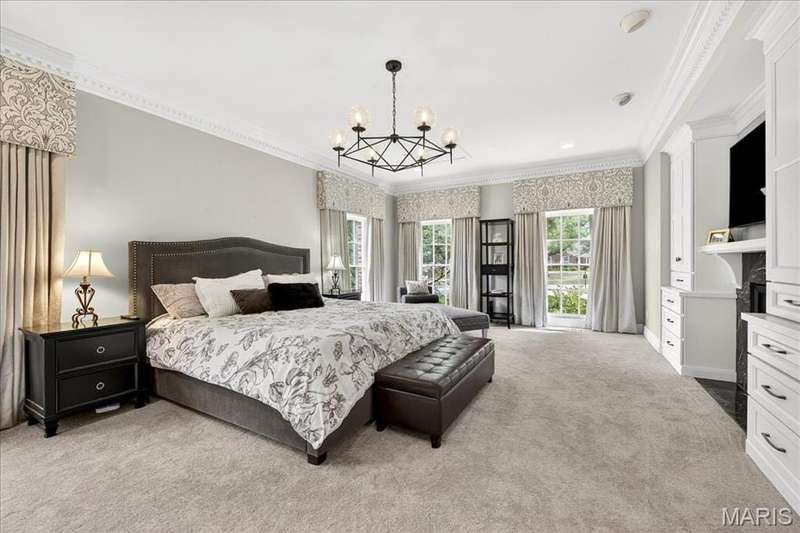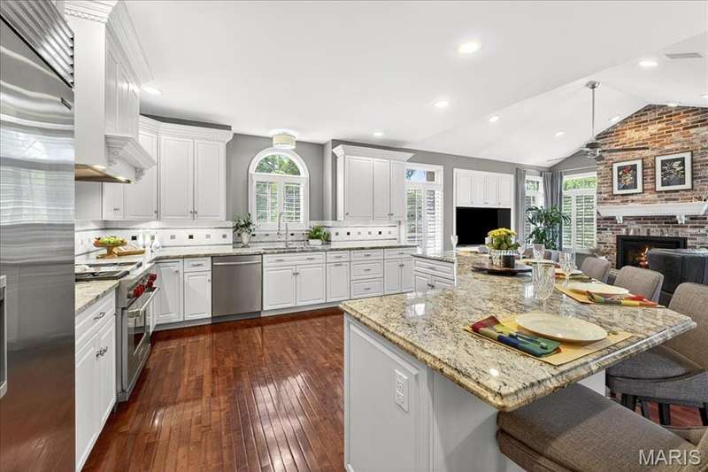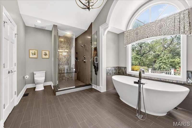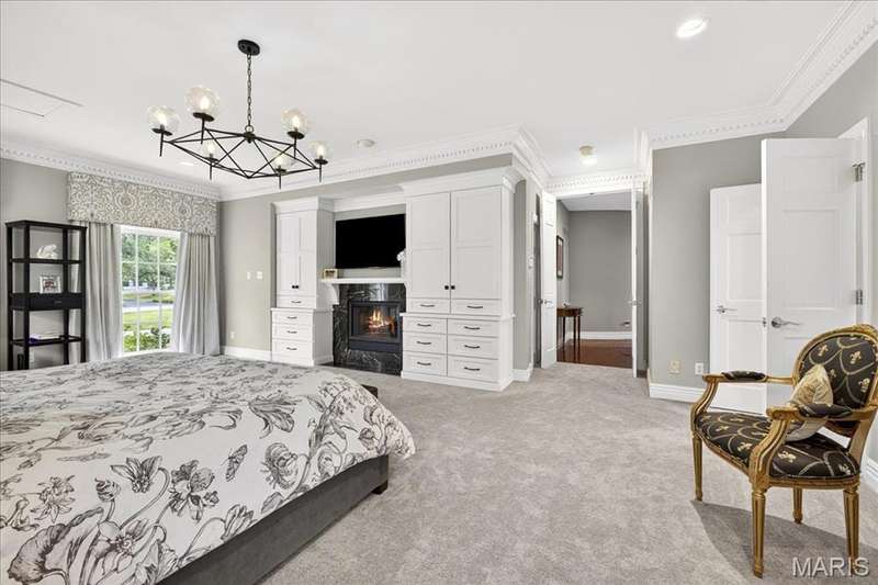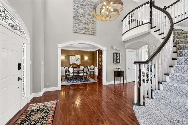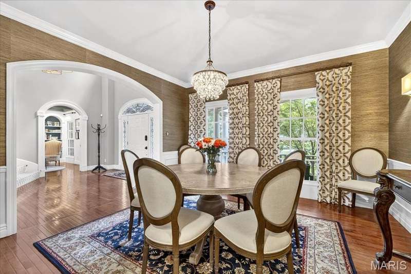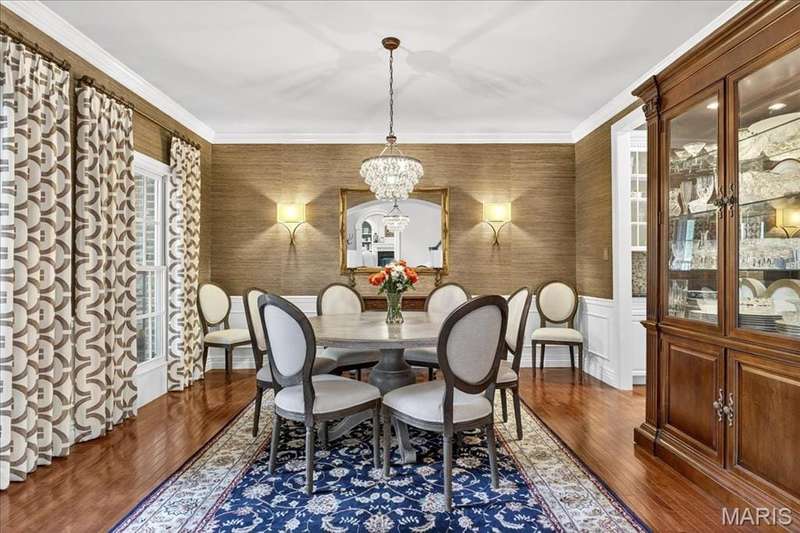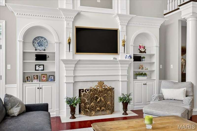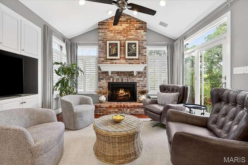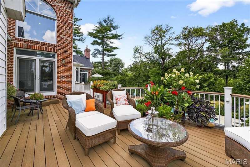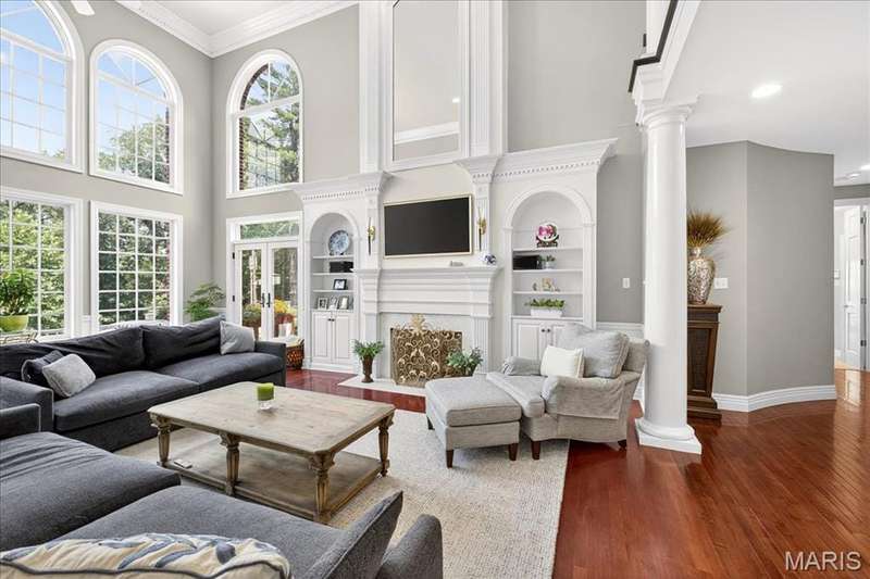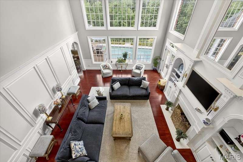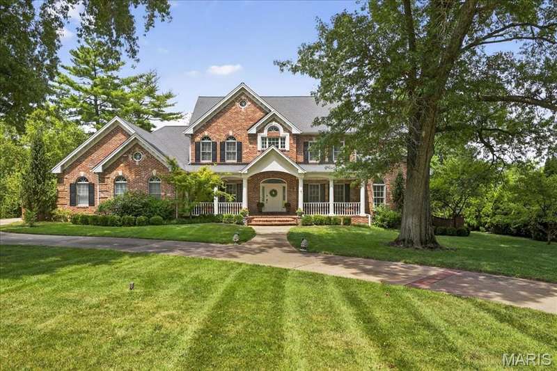 This stunning Frontenac estate offers timeless elegance and resort-style living on nearly an acre. A welcoming brick front porch and circle drive lead into a light-filled interior with high ceilings and wood floors throughout the main level. The two-story living room features dramatic floor-to-ceiling windows with serene views of your own private backyard oasis. The updated chef's kitchen opens to a cozy hearth room, creating the perfect setting for both entertaining and everyday living. The main-floor primary suite boasts dual walk-in closets, a spa inspired bath, and direct views to the expansive back patio overlooking the pool, vibrant landscaping, and the private, wooded backdrop beyond. The finished walkout lower level offers a full wet bar, spacious family room with gorgeous fireplace, two ensuite bedrooms, and seamless access to outdoor living. Extensive storage space and full size LL laundry. Complete with a 4-car garage and exceptional spaces inside and out, this home perfectly blends comfort, sophistication, and privacy.