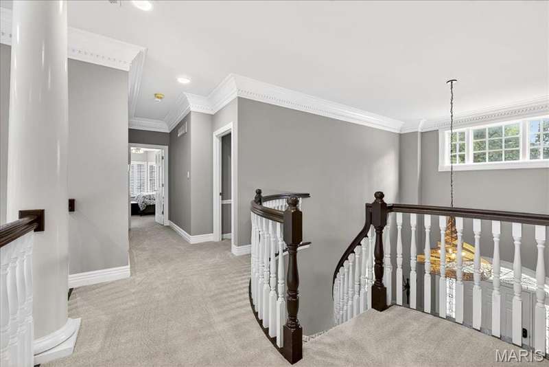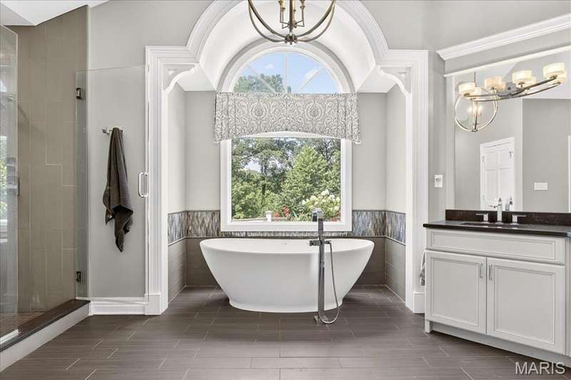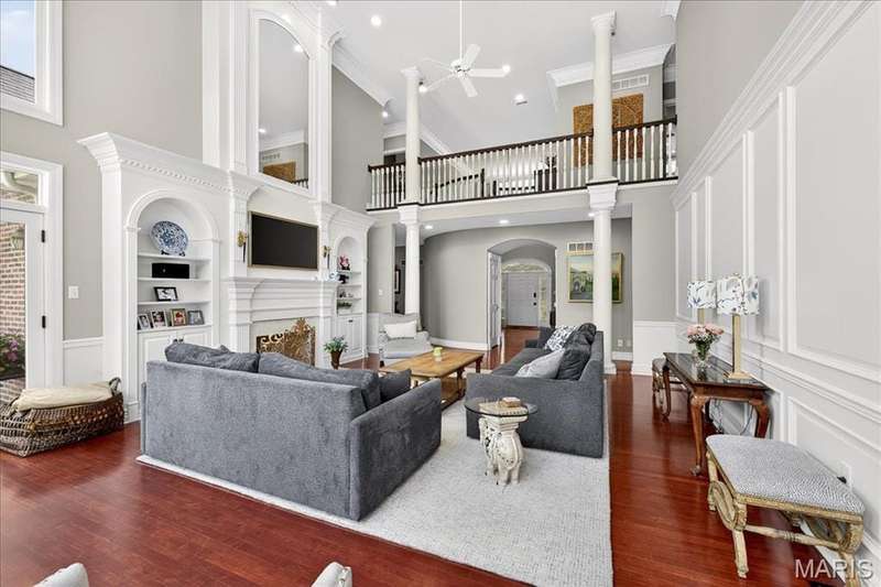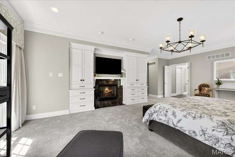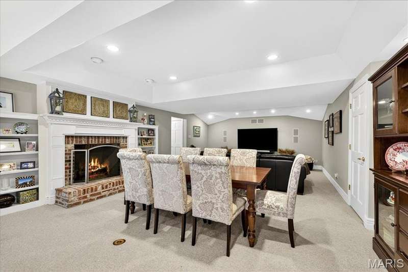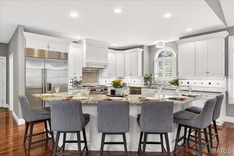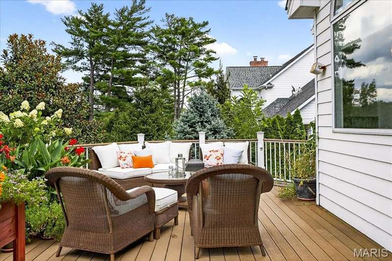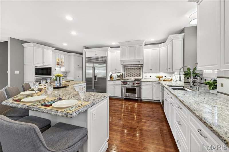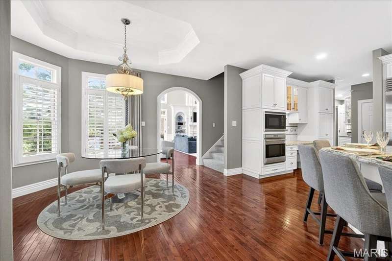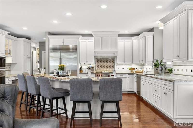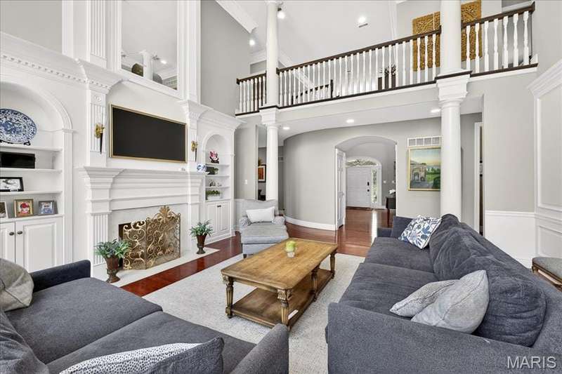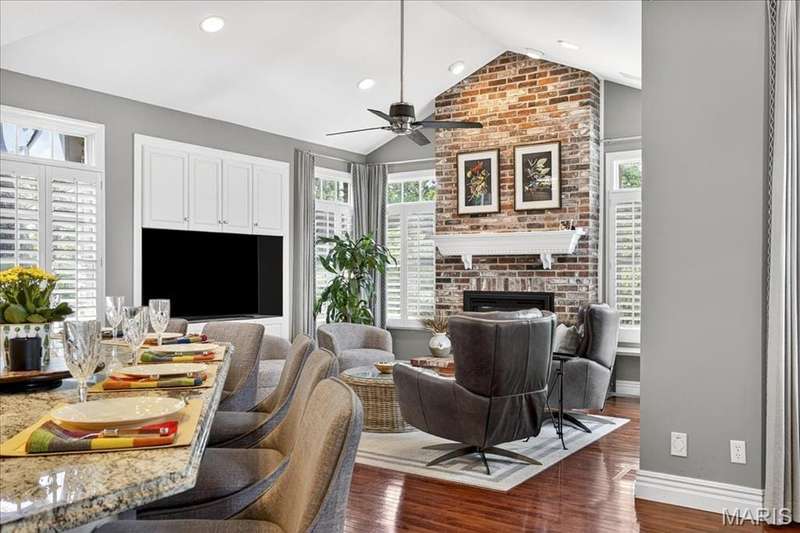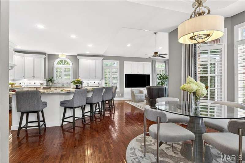 This stunning Frontenac estate offers timeless elegance and resort-style living on nearly an acre. A welcoming brick front porch and circle drive lead into a light-filled interior with high ceilings and wood floors throughout the main level. The two-story living room features dramatic floor-to-ceiling windows with serene views of your own private backyard oasis. The updated chef's kitchen opens to a cozy hearth room, creating the perfect setting for both entertaining and everyday living. The main-floor primary suite boasts dual walk-in closets, a spa inspired bath, and direct views to the expansive back patio overlooking the pool, vibrant landscaping, and the private, wooded backdrop beyond. The finished walkout lower level offers a full wet bar, spacious family room with gorgeous fireplace, two ensuite bedrooms, and seamless access to outdoor living. Extensive storage space and full size LL laundry. Complete with a 4-car garage and exceptional spaces inside and out, this home perfectly blends comfort, sophistication, and privacy.