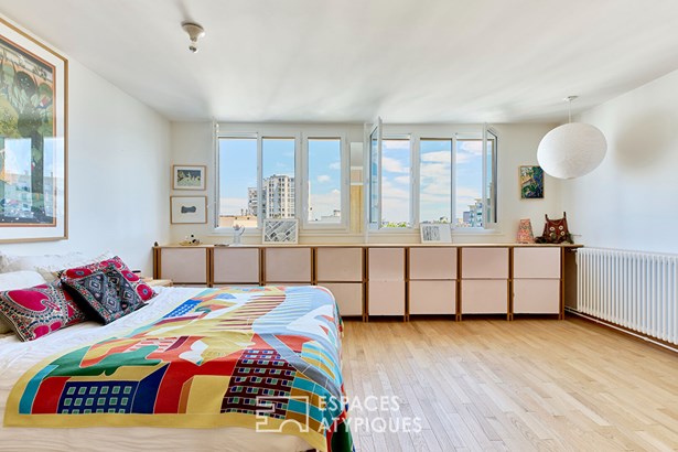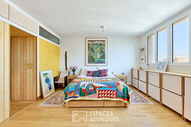 Crossing, the apartment benefits from a large bedroom on the east side, bathed in light thanks to a long line of windows.